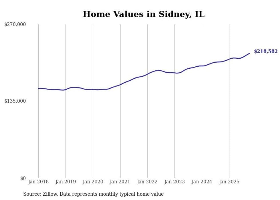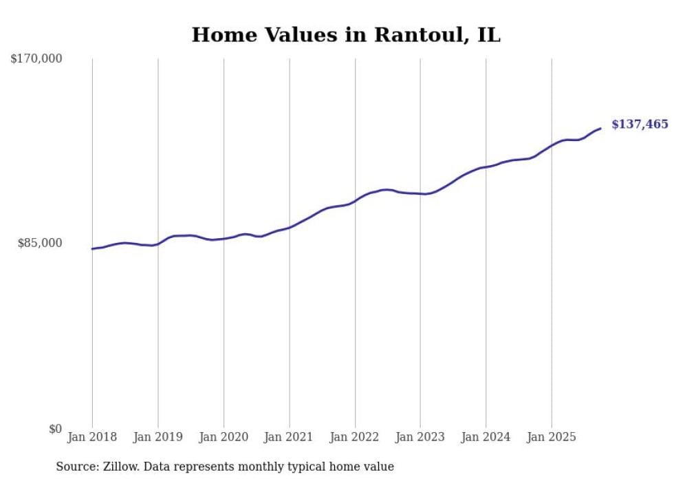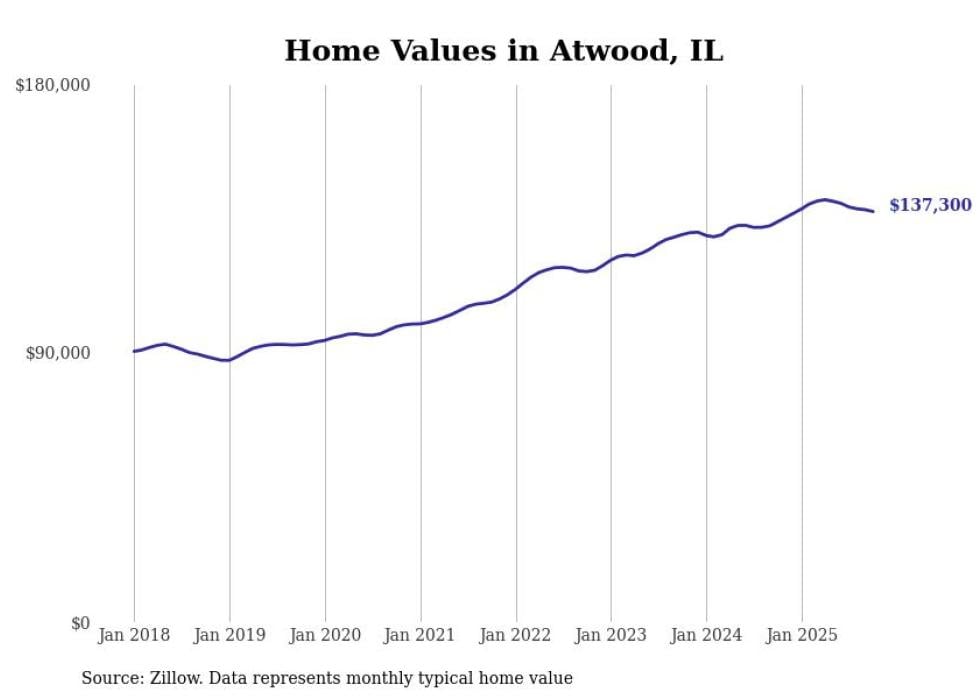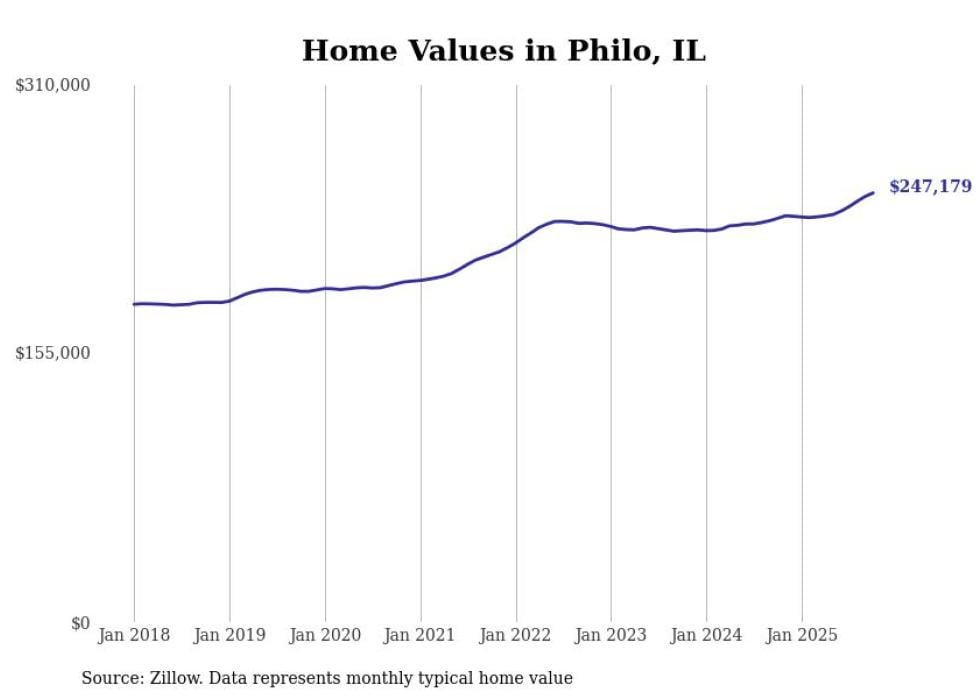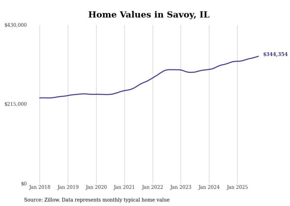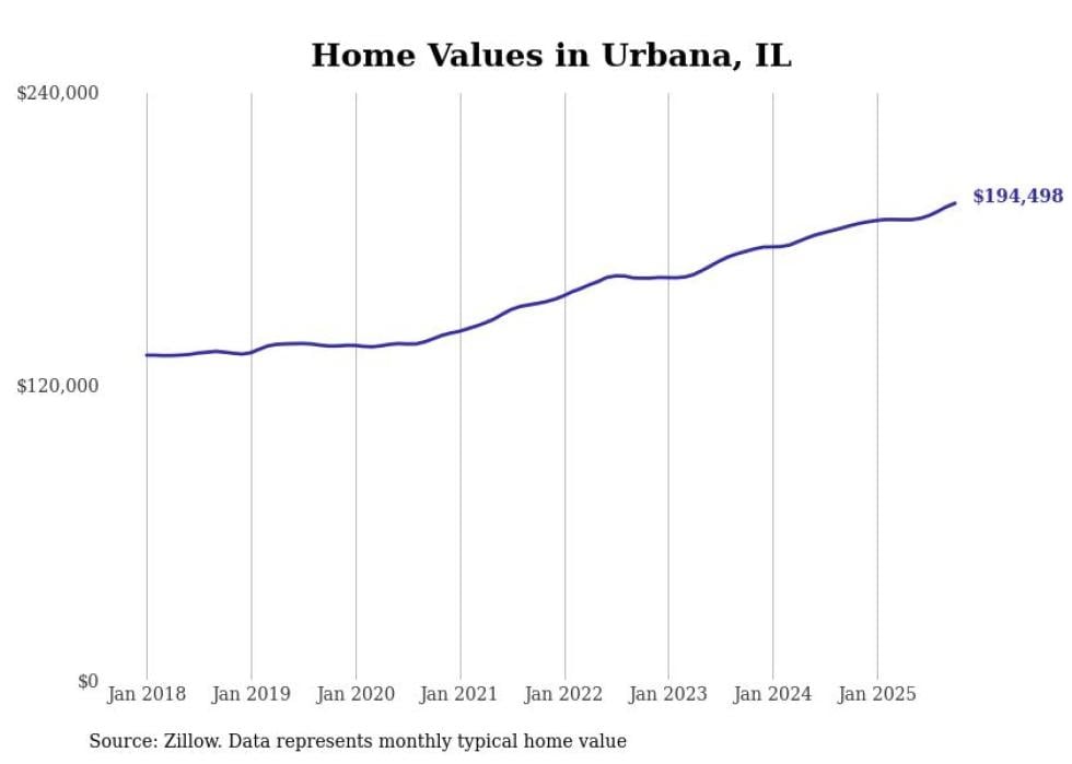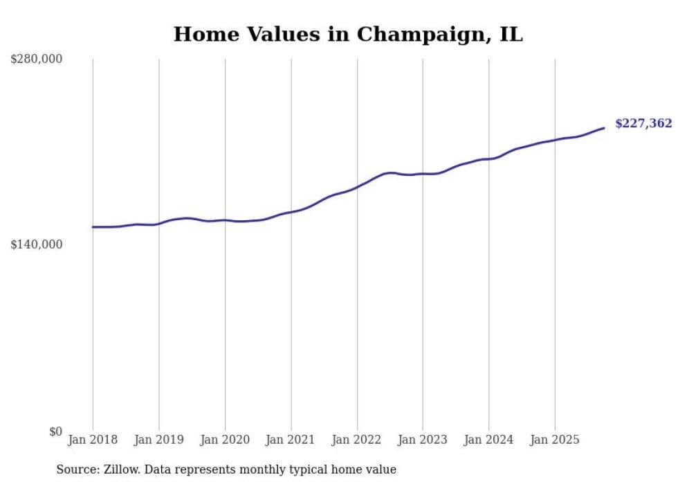 Stacker compiled a list of cities with the most expensive homes in the Champaign-Urbana, IL metro area using data from Zillow. Charts show the monthly typical home value since January 2018.