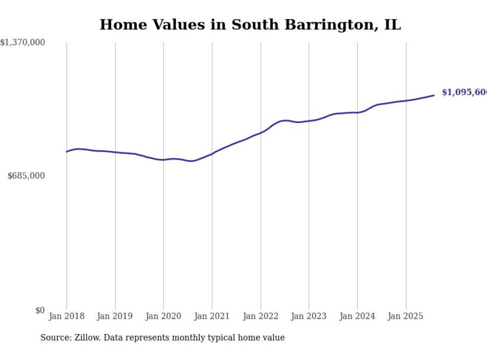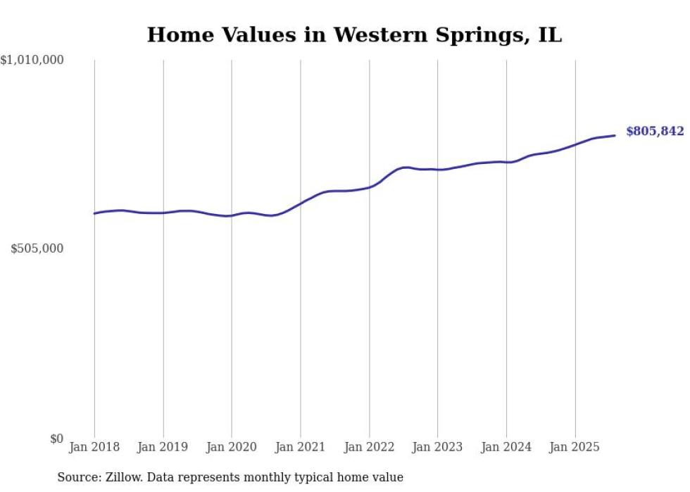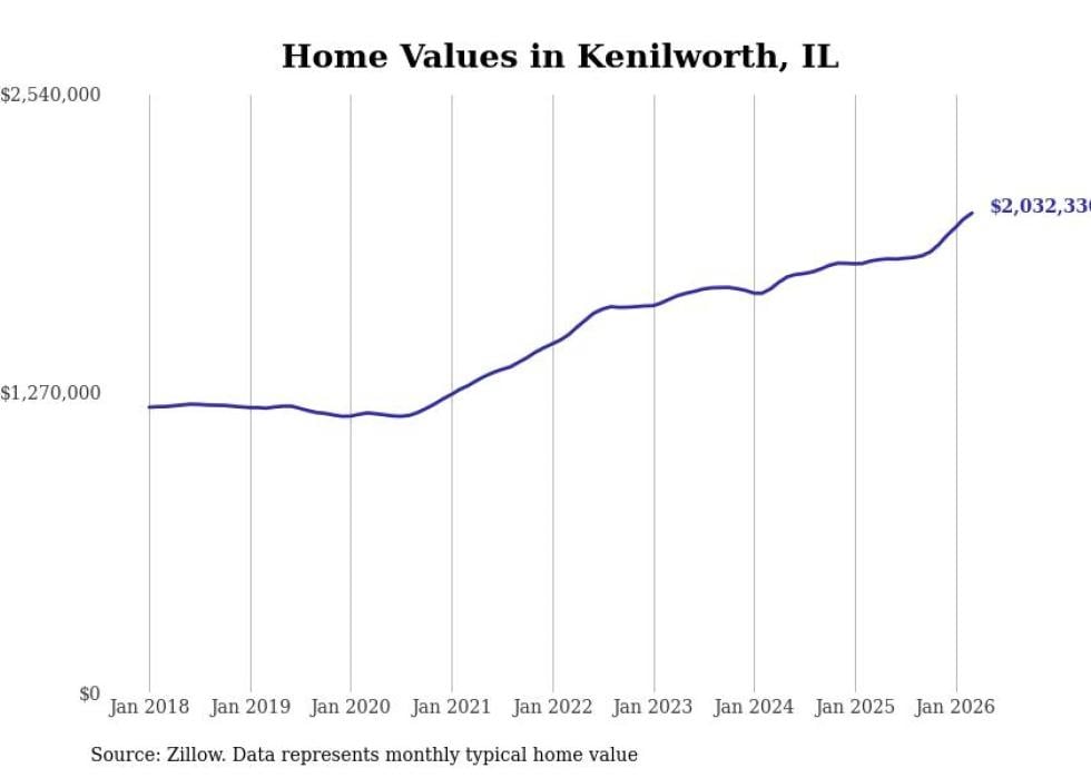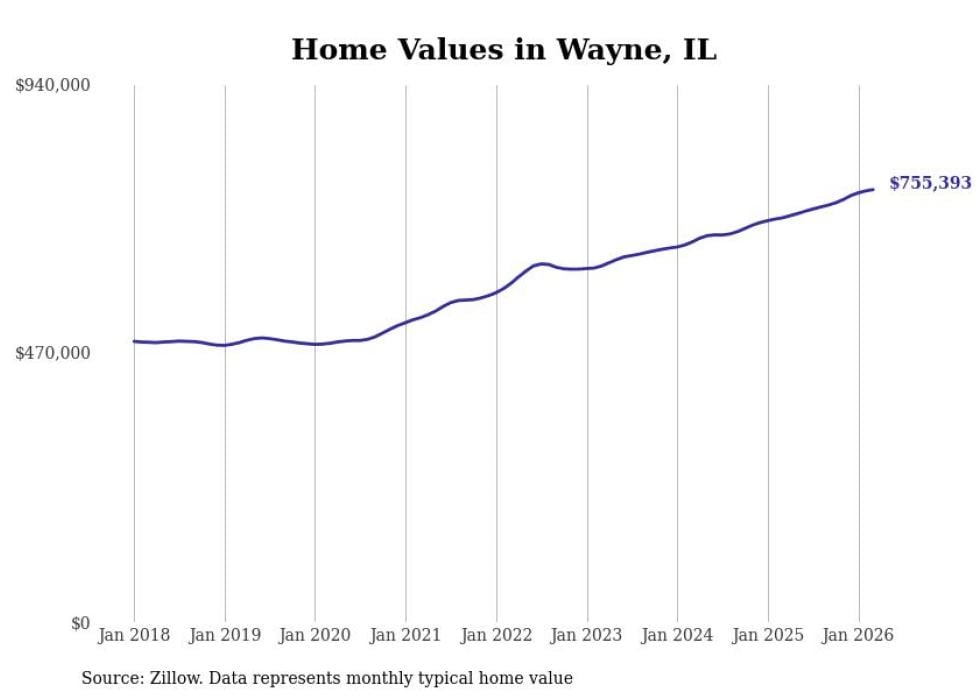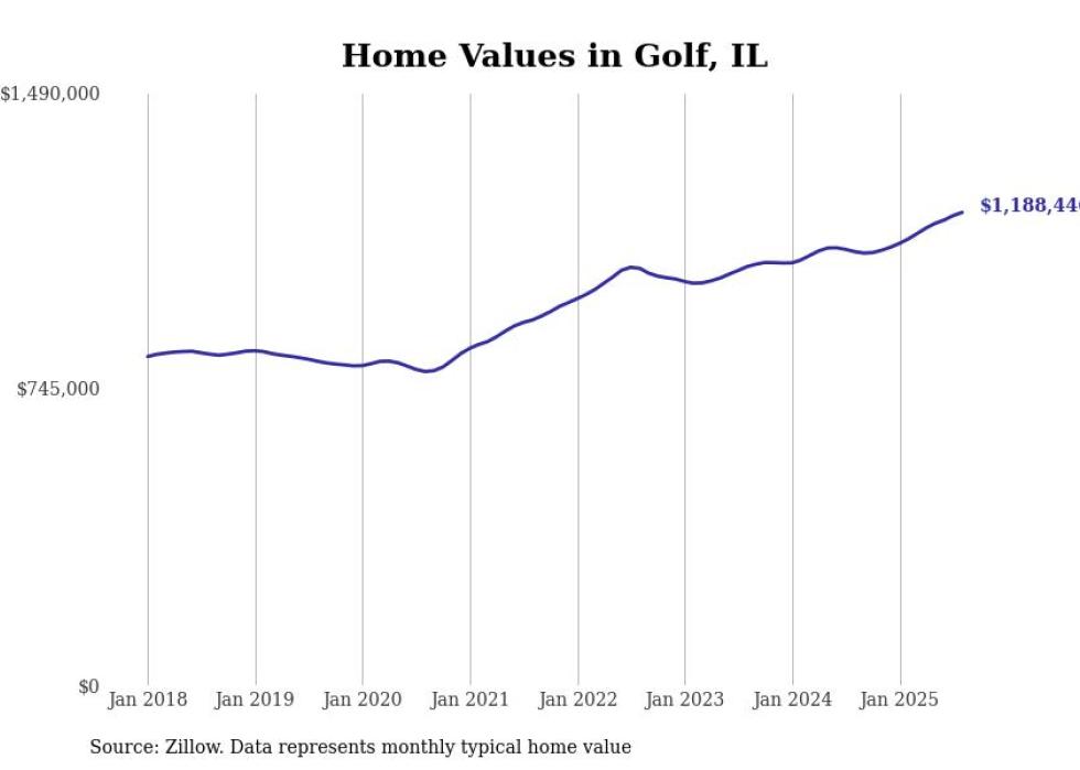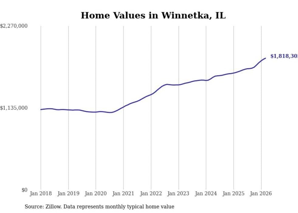 Stacker compiled a list of cities with the most expensive homes in the Chicago-Naperville-Elgin, IL-IN-WI metro area using data from Zillow. Charts show the monthly typical home value since January 2018.