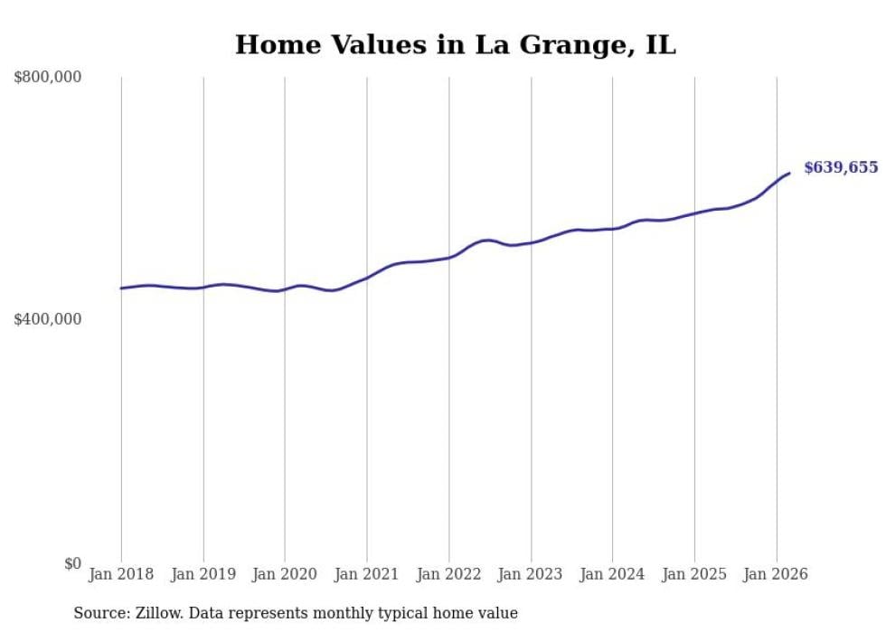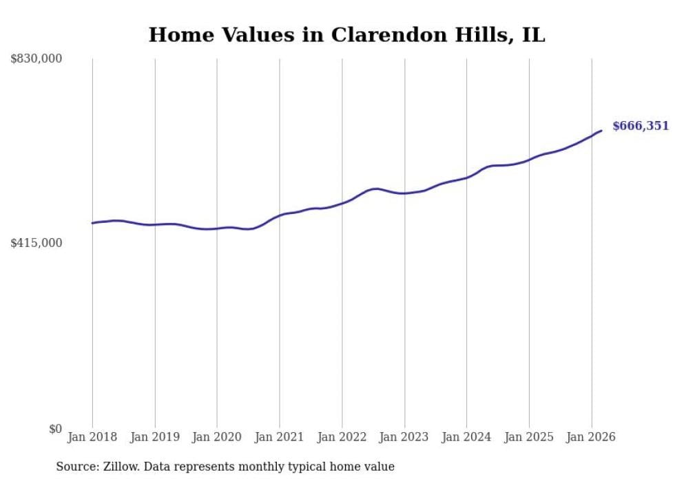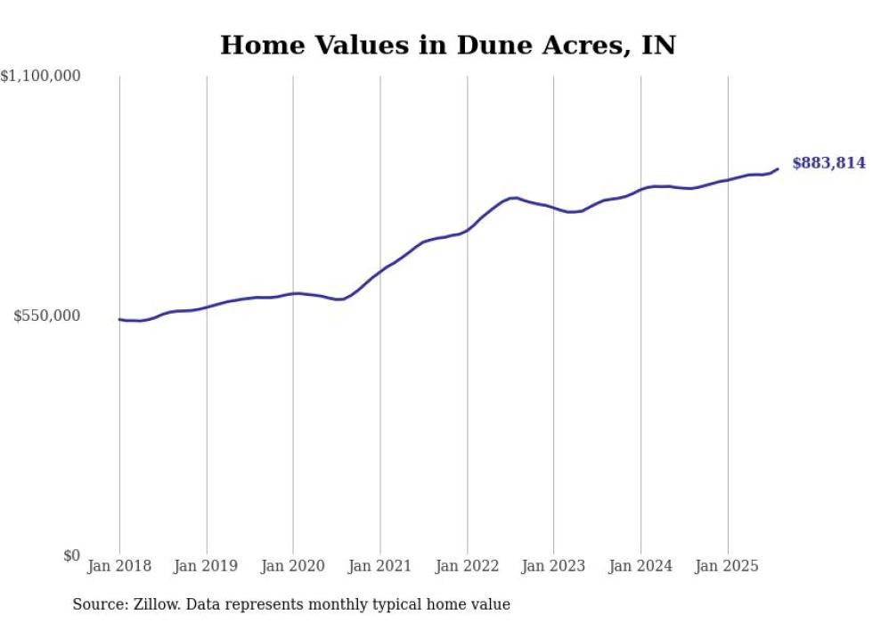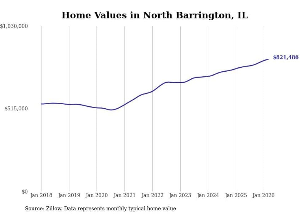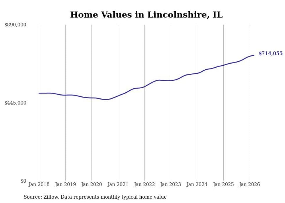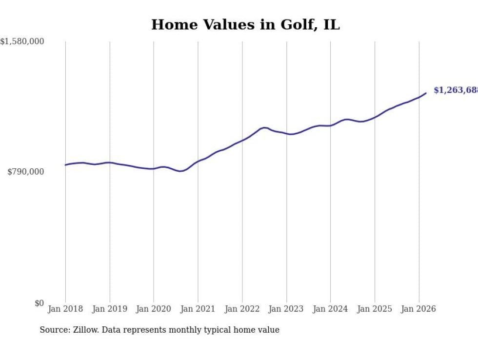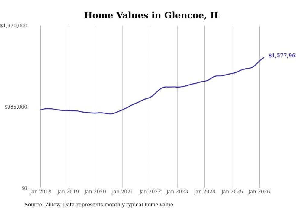 Stacker compiled a list of cities with the most expensive homes in the Chicago-Naperville-Elgin, IL-IN-WI metro area using data from Zillow. Charts show the monthly typical home value since January 2018.