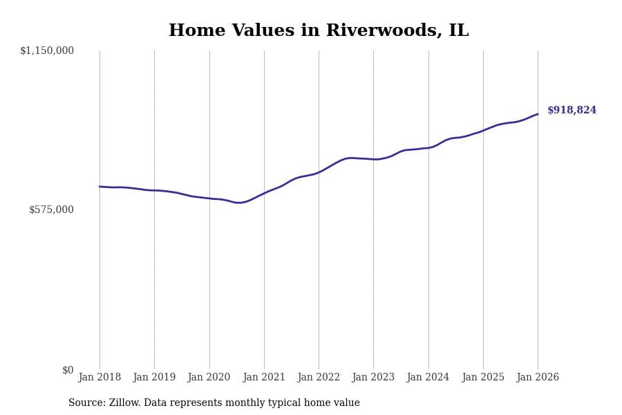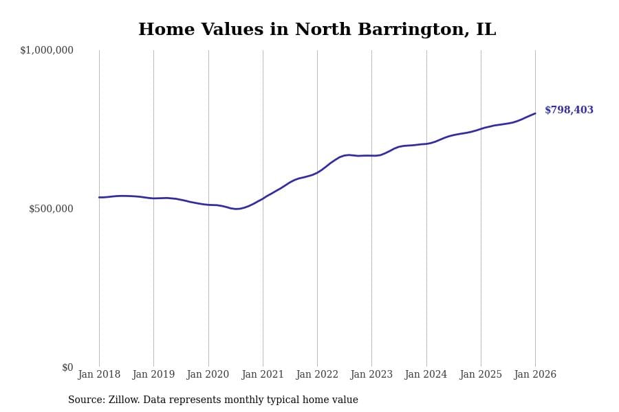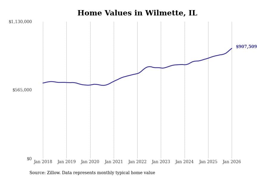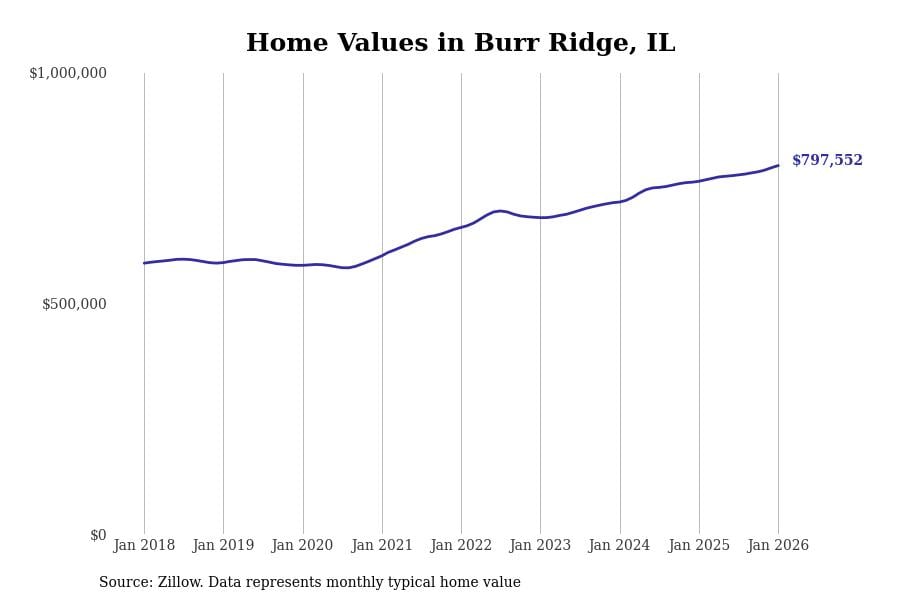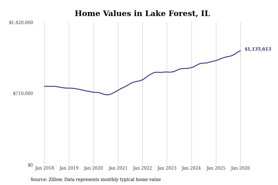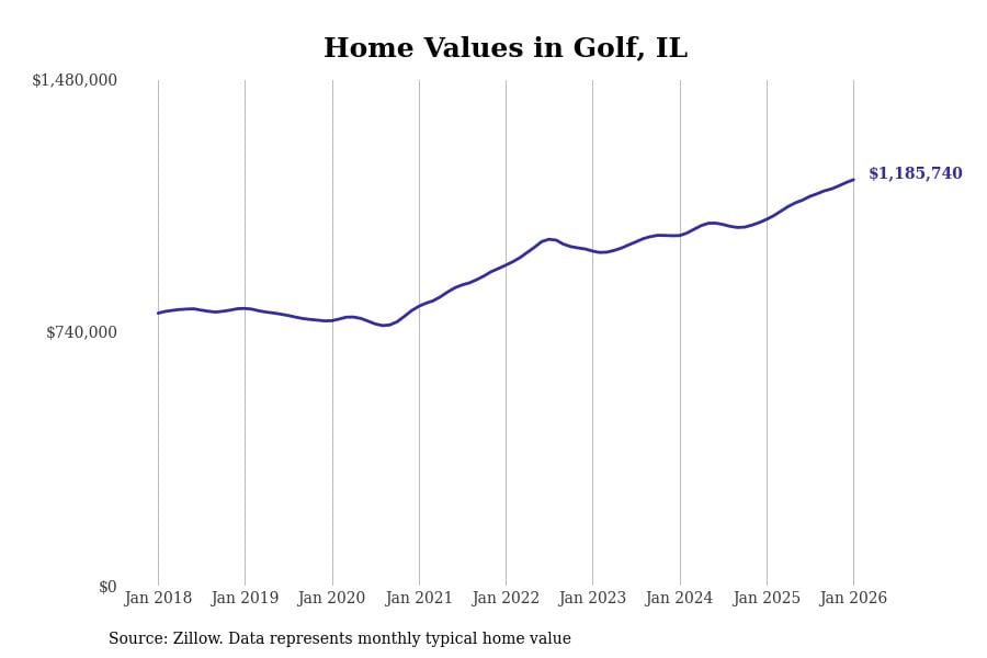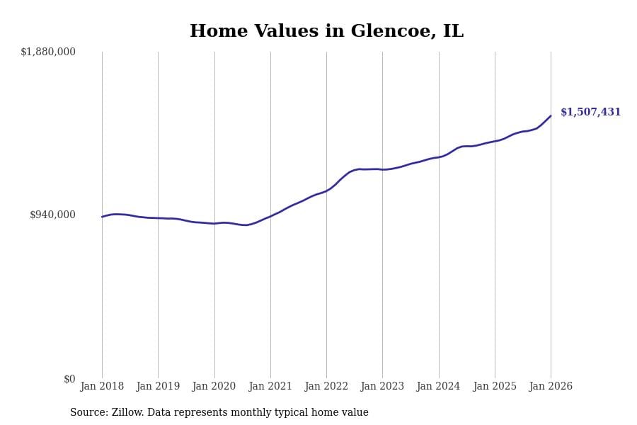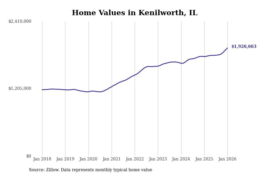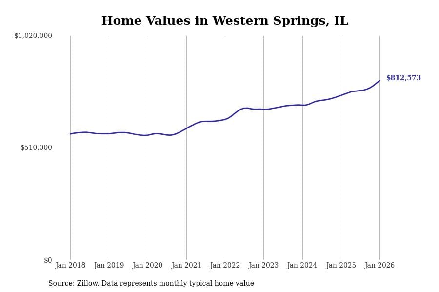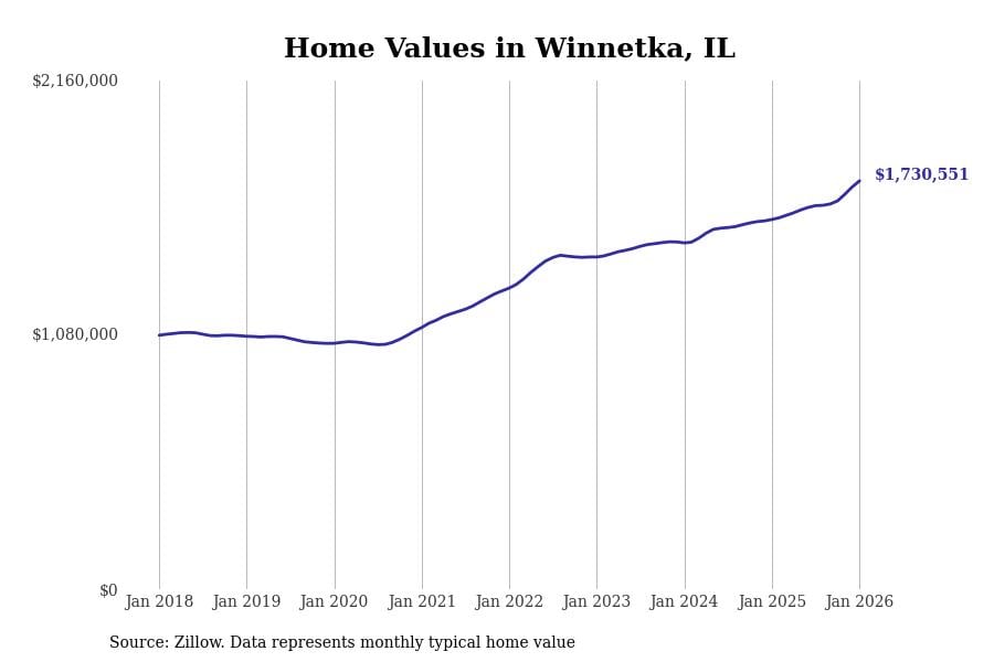 Stacker compiled a list of cities with the most expensive homes in the Chicago metro area using data from Zillow. Charts show the monthly typical home value since January 2018. Data was available for 346 cities and towns.