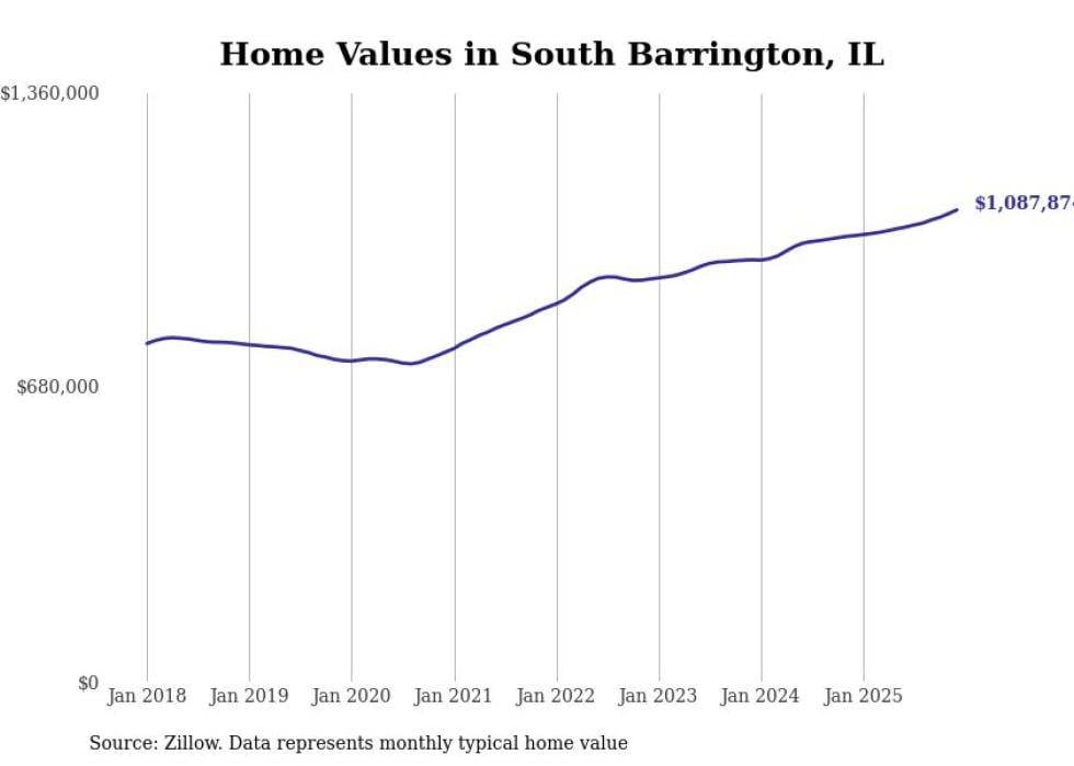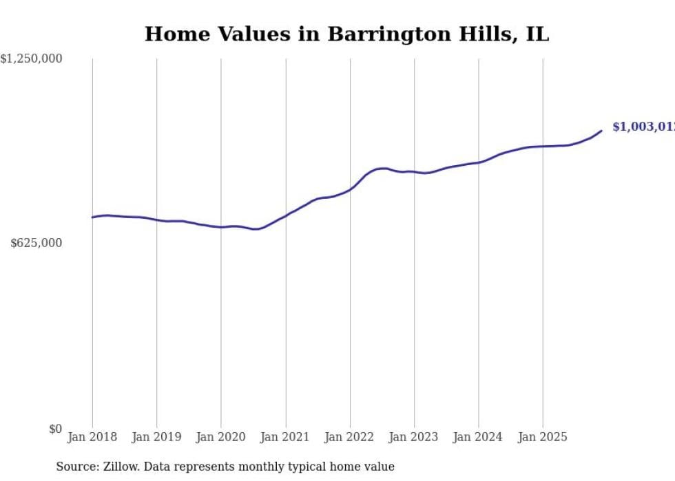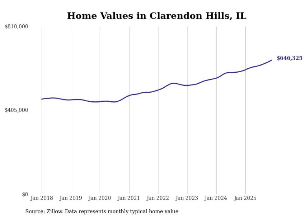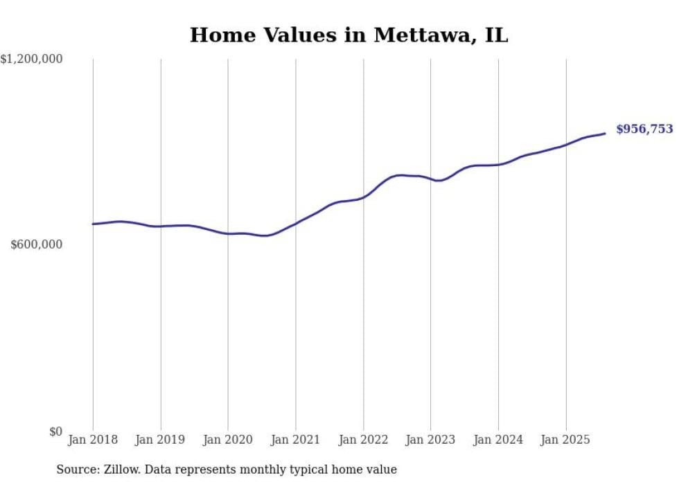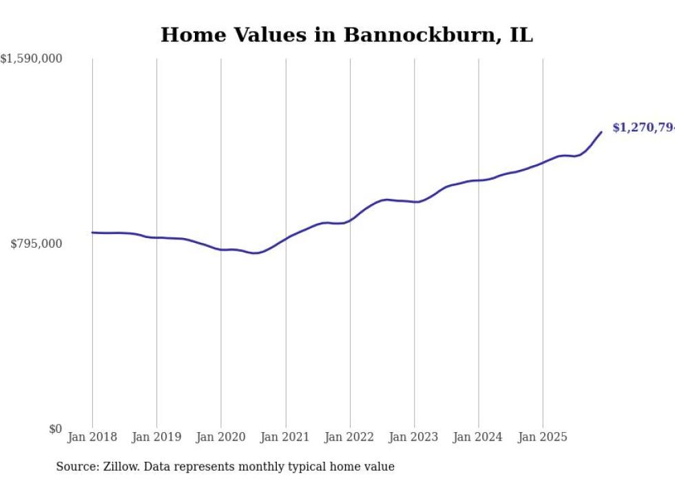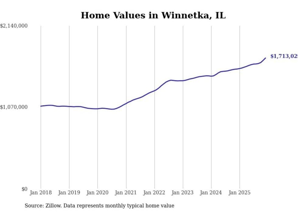 Stacker compiled a list of cities with the most expensive homes in the Chicago metro area using data from Zillow. Charts show the monthly typical home value since January 2018. Data was available for 347 cities and towns.