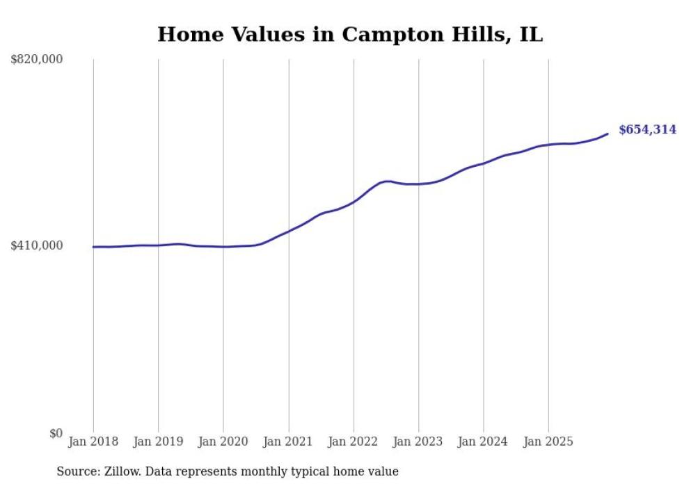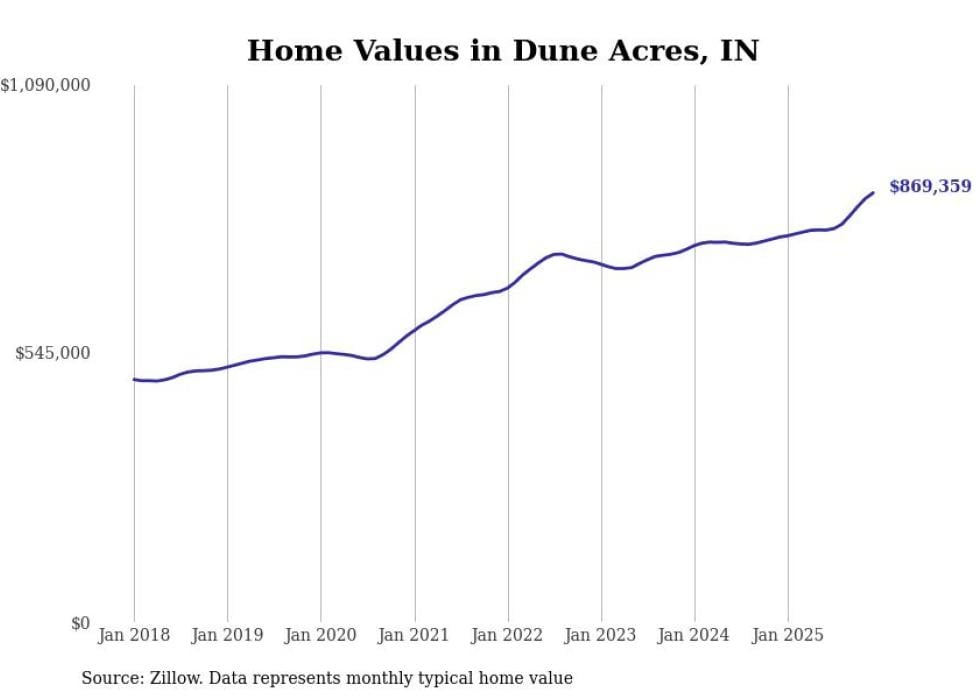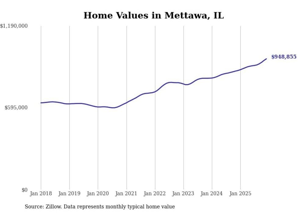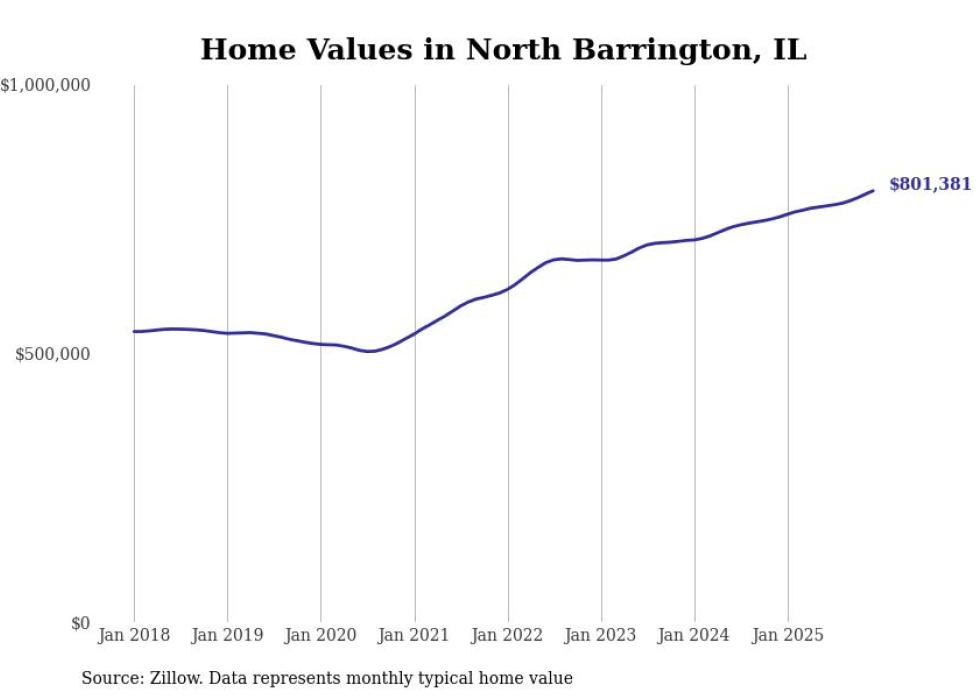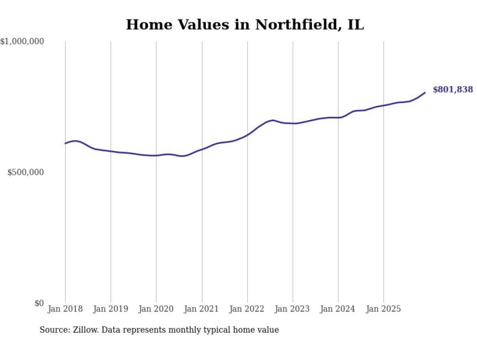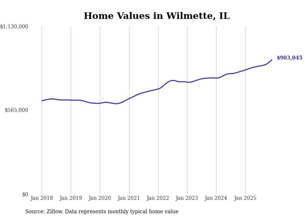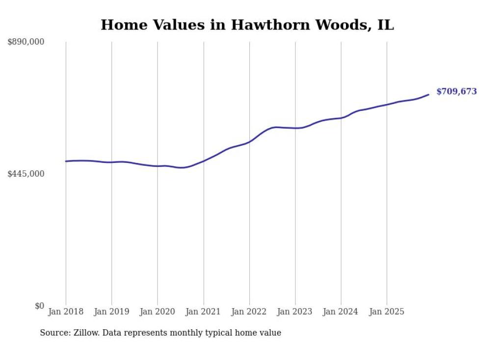 Stacker compiled a list of cities with the most expensive homes in the Chicago metro area using data from Zillow. Charts show the monthly typical home value since January 2018. Data was available for 347 cities and towns.