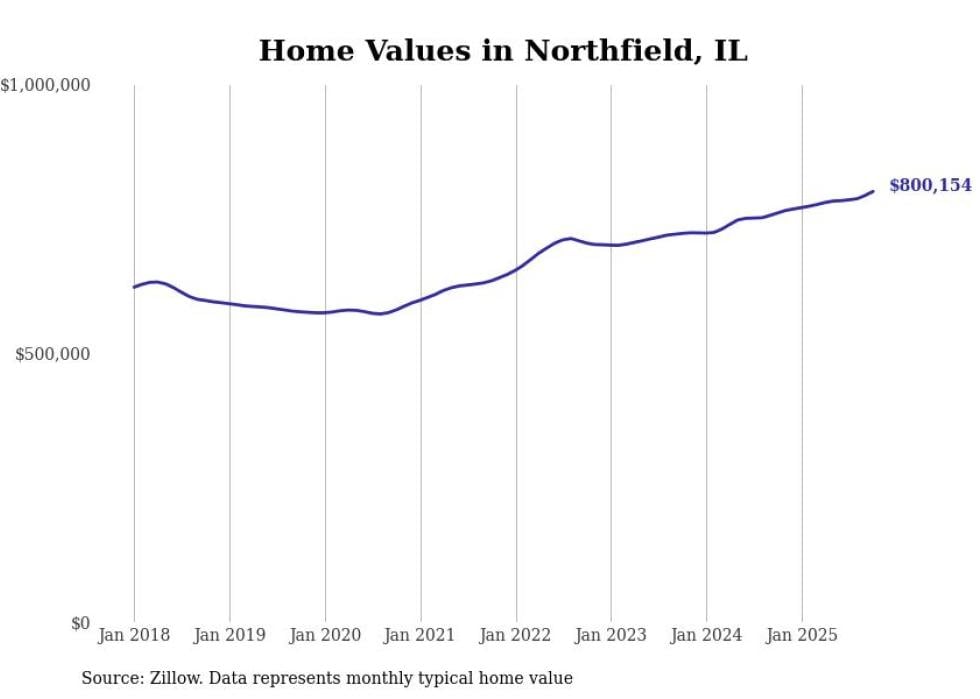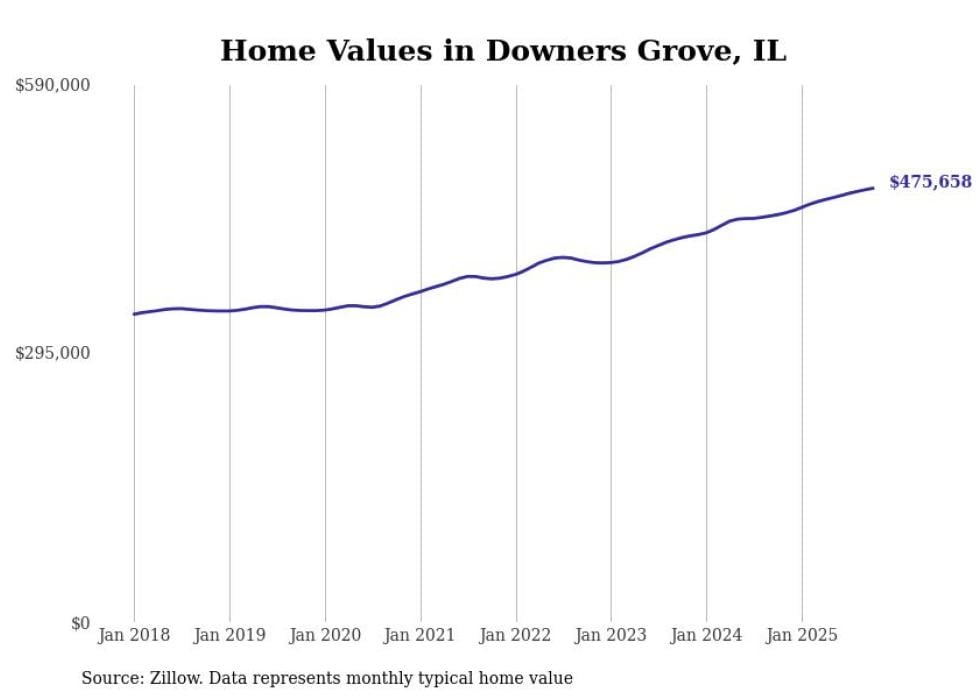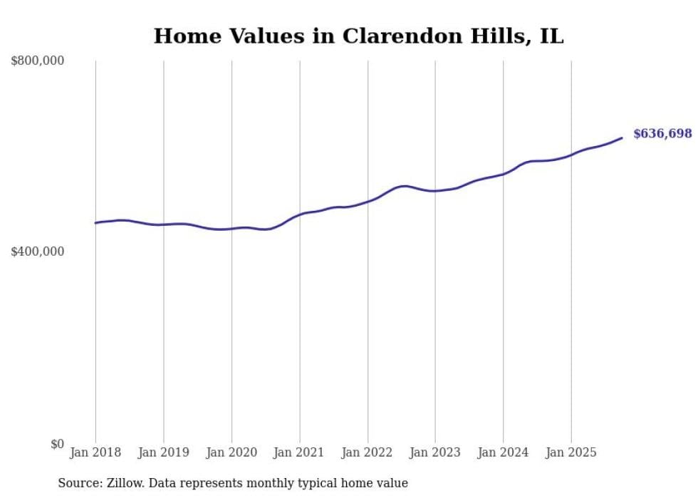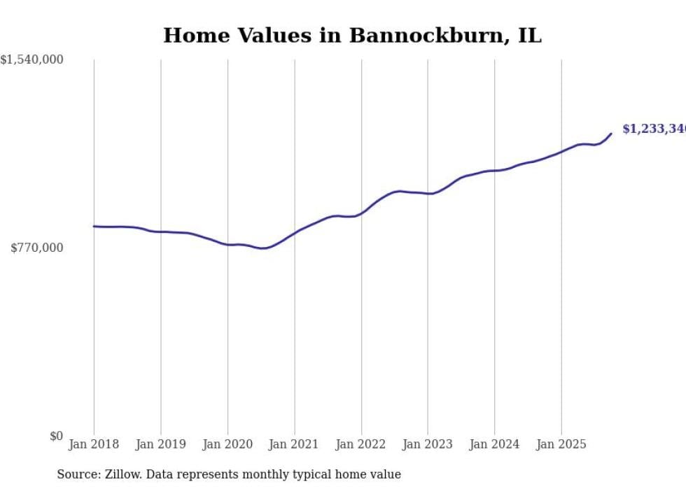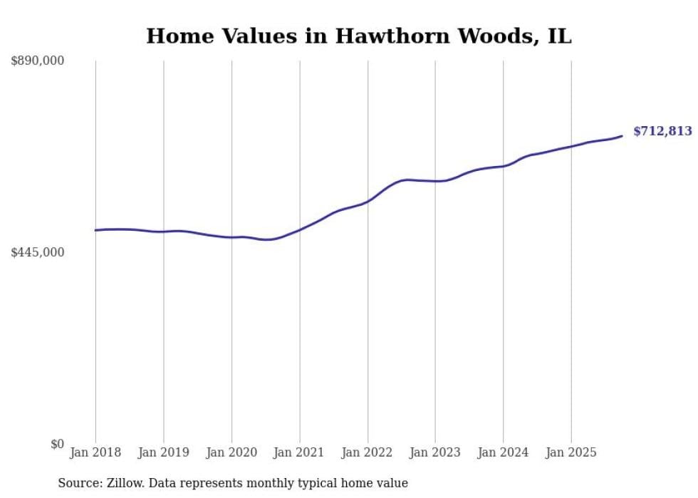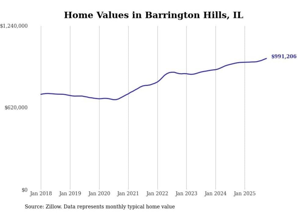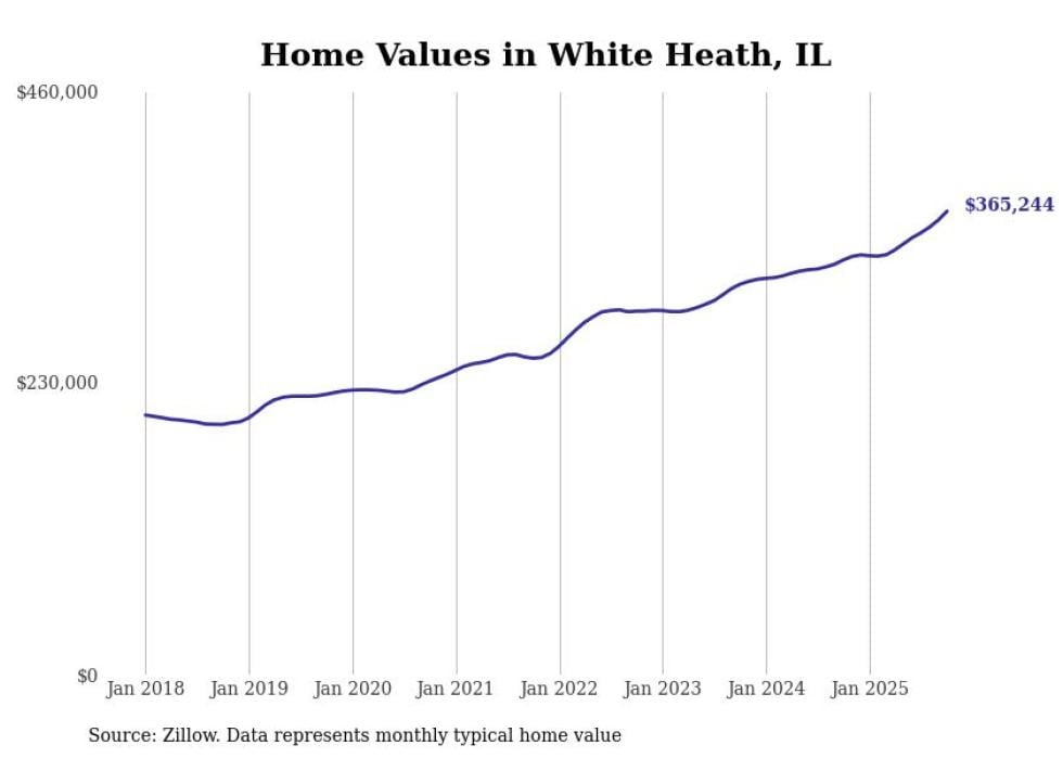 Stacker compiled a list of cities with the fastest-growing home prices in Illinois using data from Zillow. Cities are ranked by the dollar change in the Zillow Home Values Index for all homes from the 12 months ending October 2025. The charts in this story were created automatically using Matplotlib. Data was available for 50 cities and towns in Illinois.