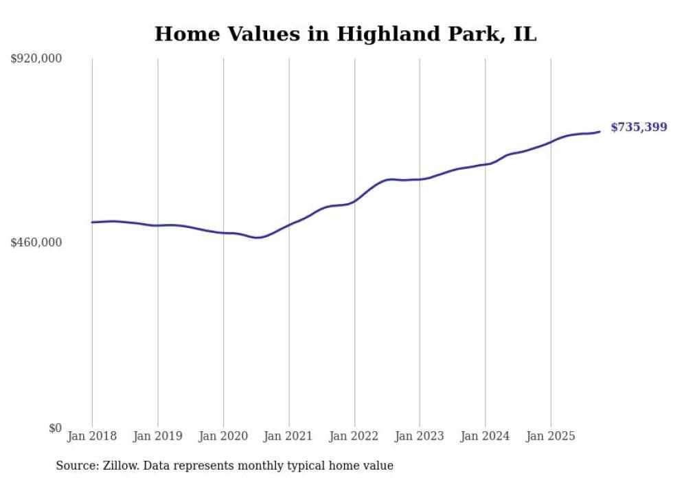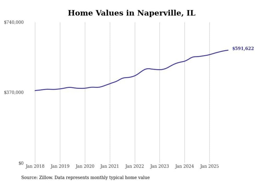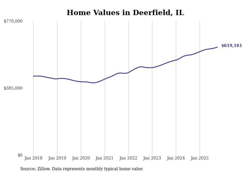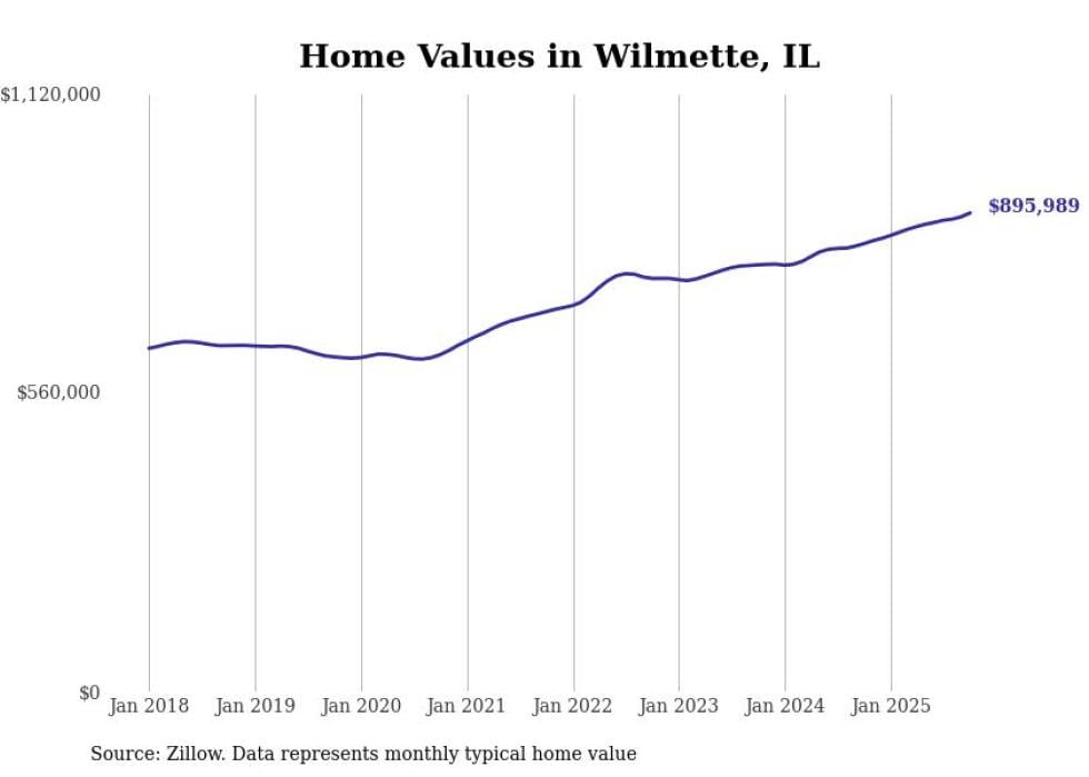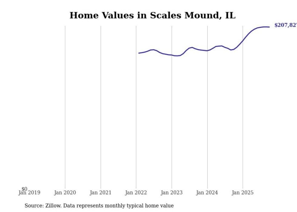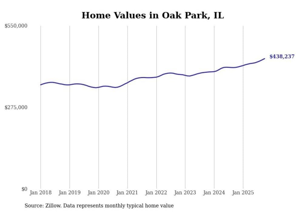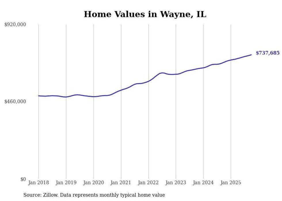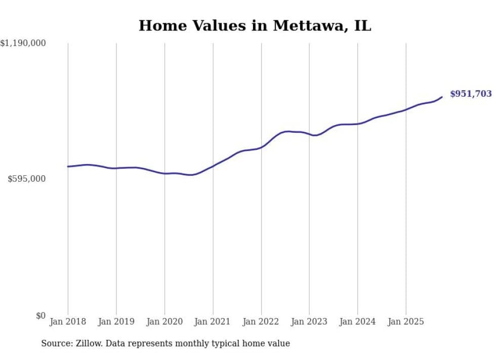 Stacker compiled a list of cities with the fastest-growing home prices in Illinois using data from Zillow. Cities are ranked by the dollar change in the Zillow Home Values Index for all homes from the 12 months ending October 2025. The charts in this story were created automatically using Matplotlib. Data was available for 50 cities and towns in Illinois.