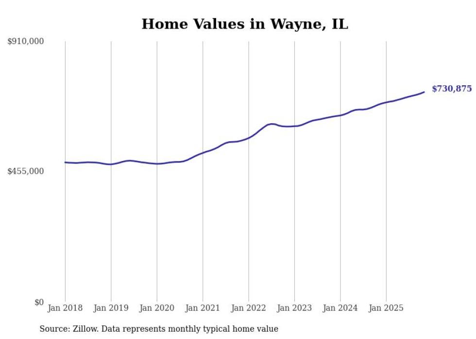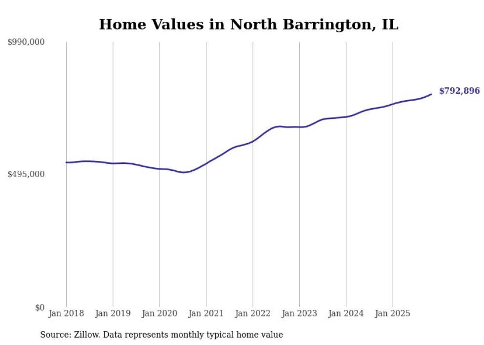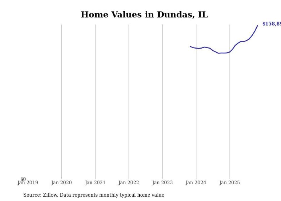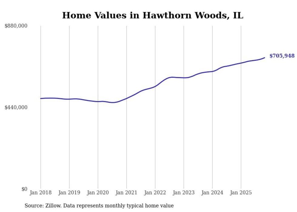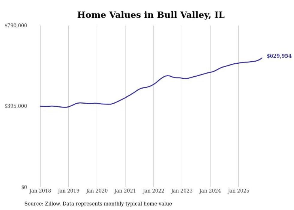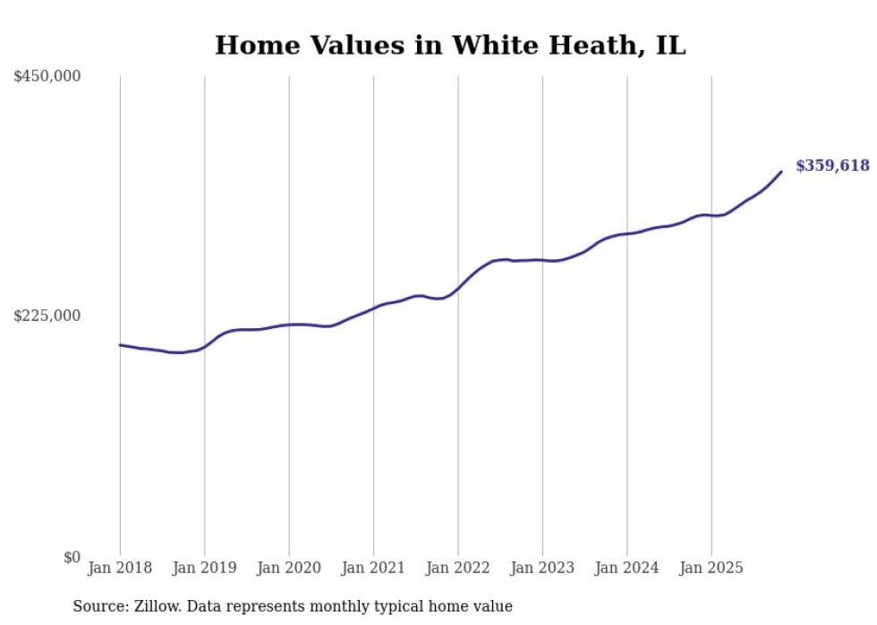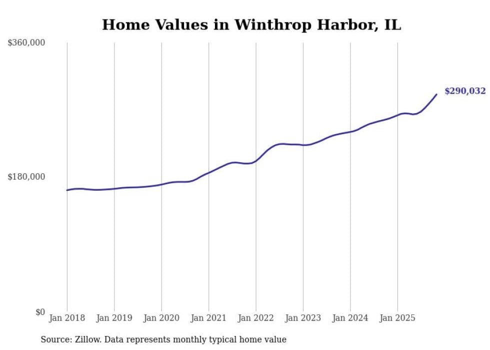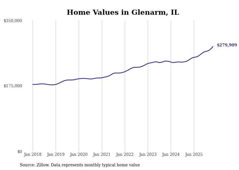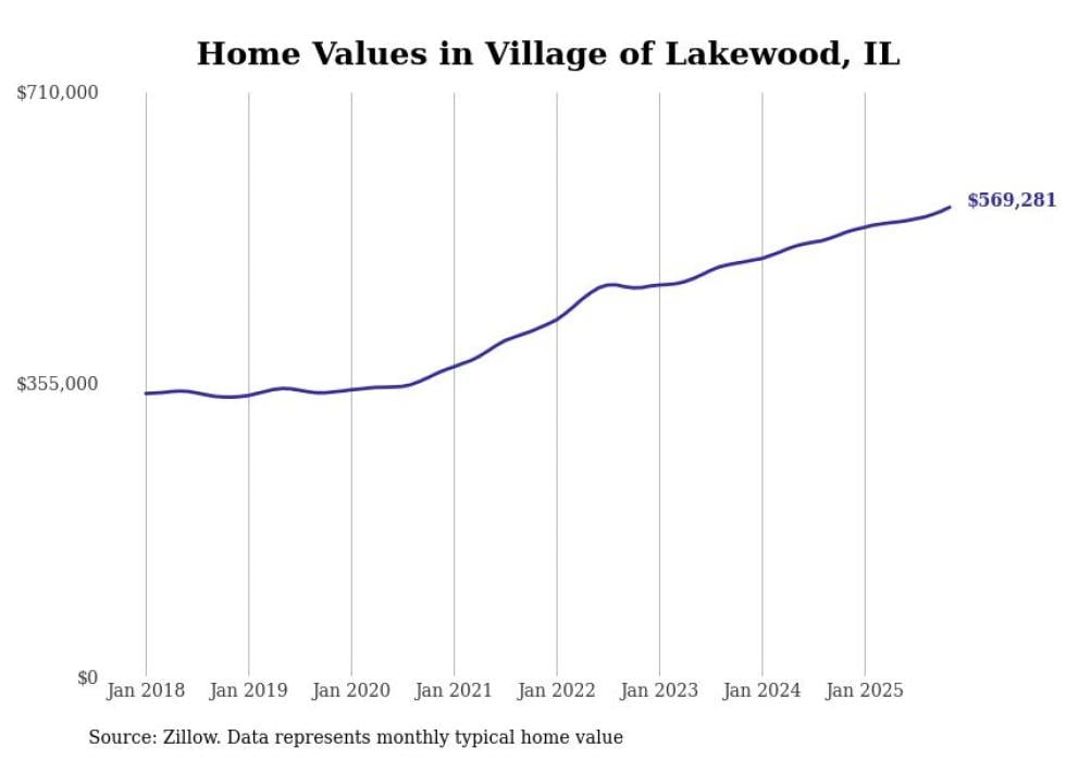 Stacker compiled a list of cities with the fastest-growing home prices in Illinois using data from Zillow. Cities are ranked by the dollar change in the Zillow Home Values Index for all homes from the 12 months ending November 2025. The charts in this story were created automatically using Matplotlib. Data was available for 50 cities and towns in Illinois.