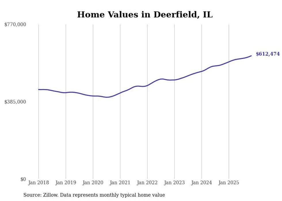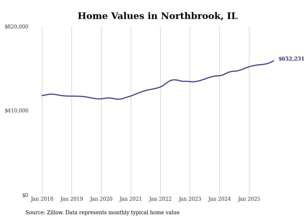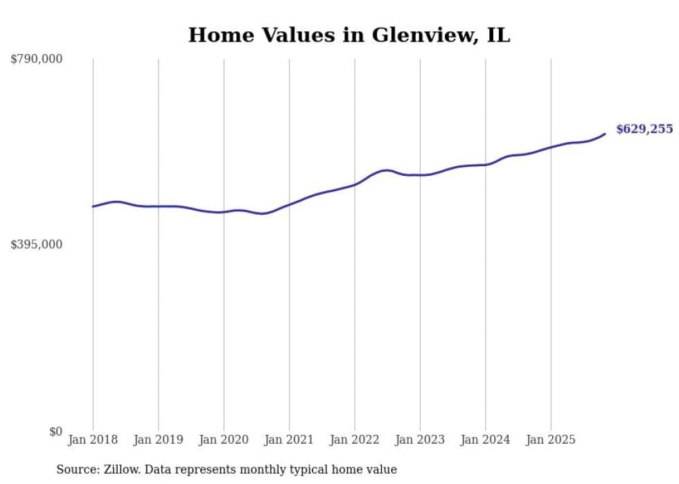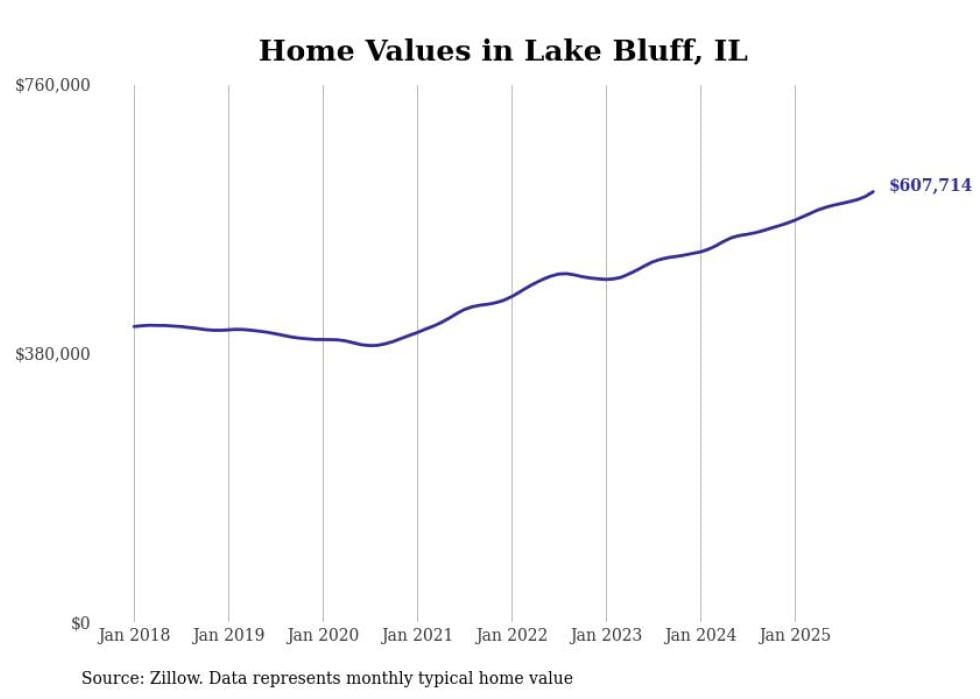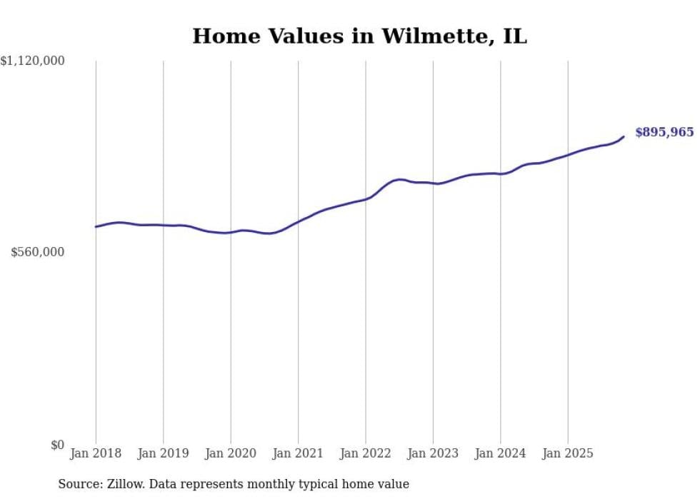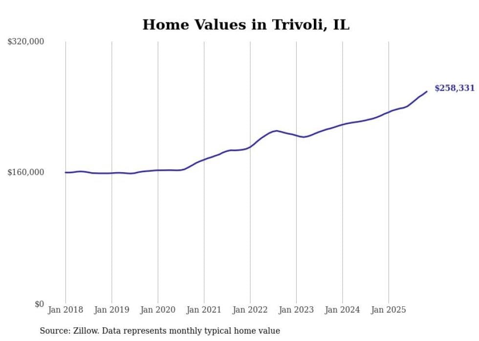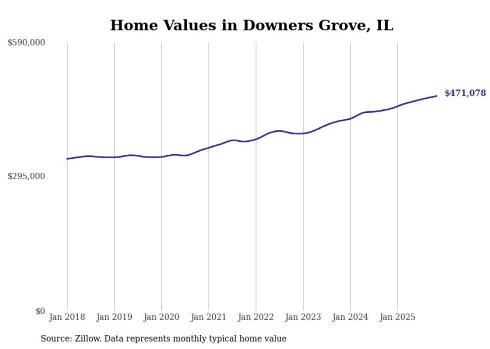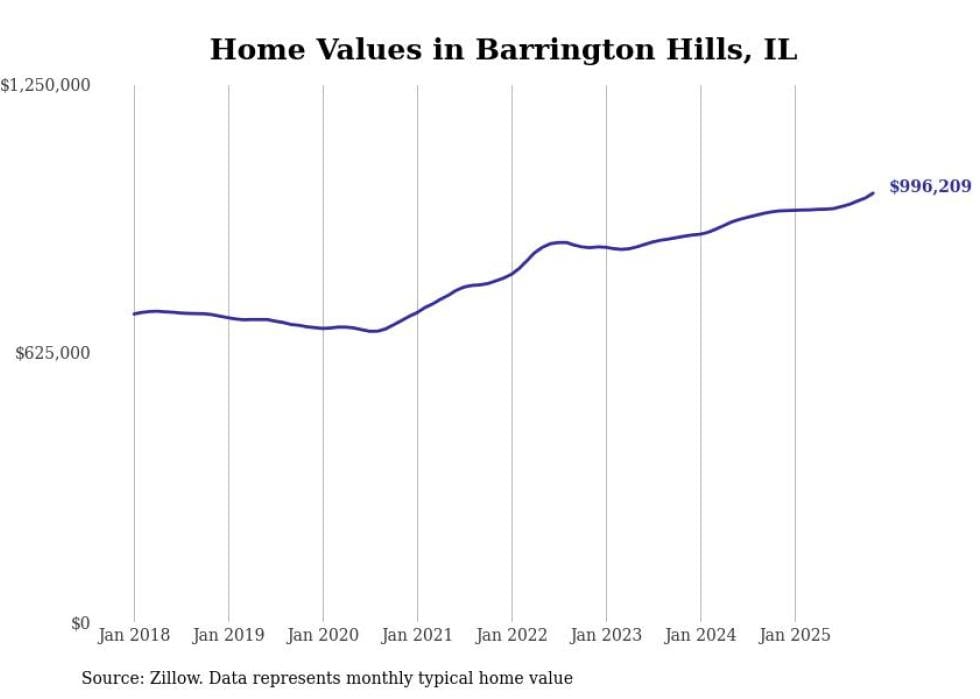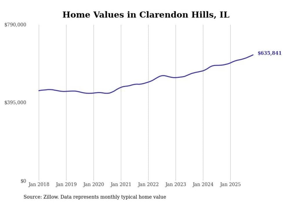 Stacker compiled a list of cities with the fastest-growing home prices in Illinois using data from Zillow. Cities are ranked by the dollar change in the Zillow Home Values Index for all homes from the 12 months ending November 2025. The charts in this story were created automatically using Matplotlib. Data was available for 50 cities and towns in Illinois.