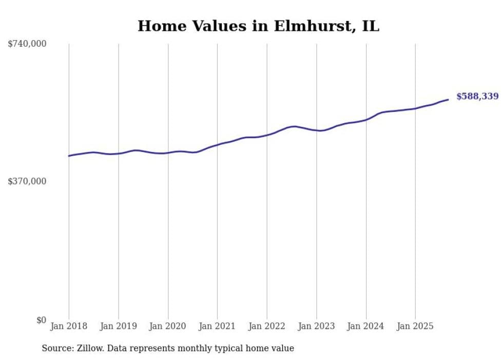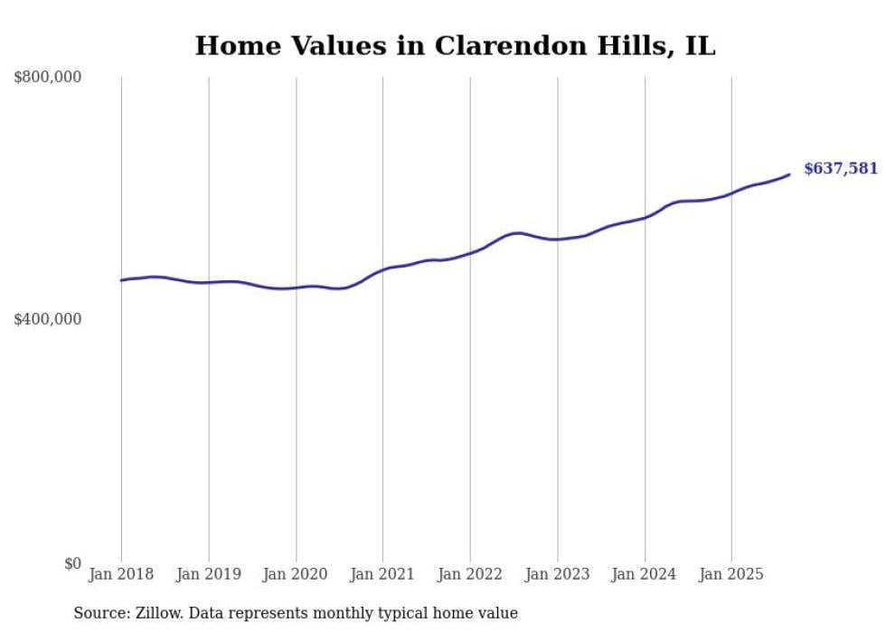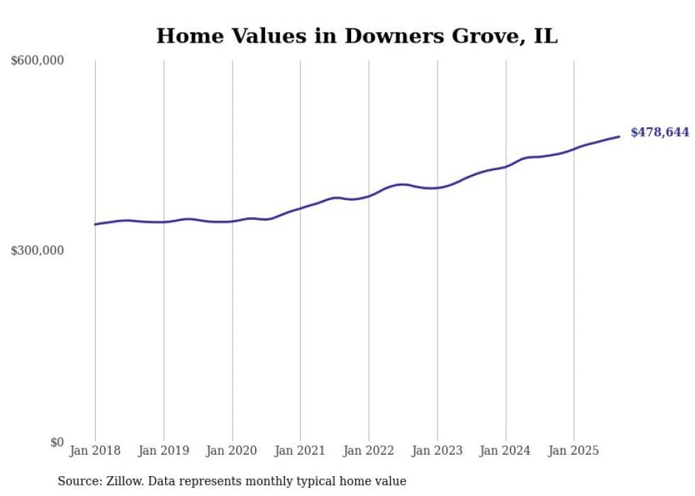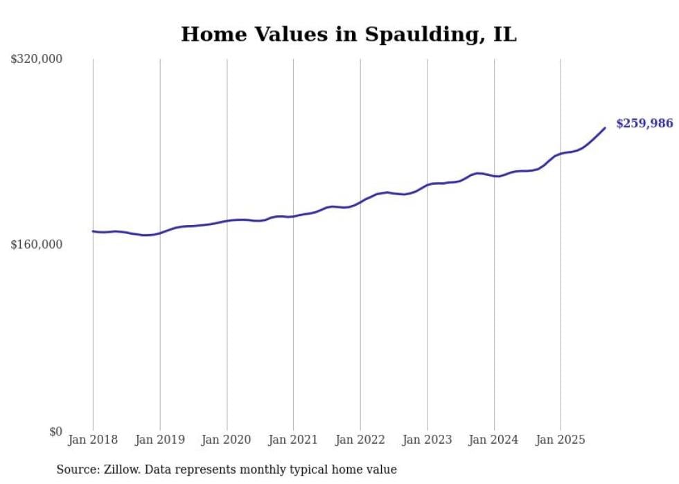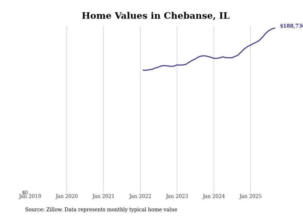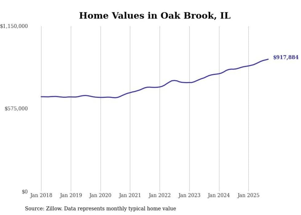 Stacker compiled a list of cities with the fastest-growing home prices in Illinois using data from Zillow. Cities are ranked by the dollar change in the Zillow Home Values Index for all homes from the 12 months ending September 2025. The charts in this story were created automatically using Matplotlib. Data was available for 50 cities and towns in Illinois.