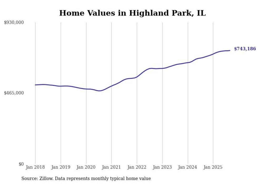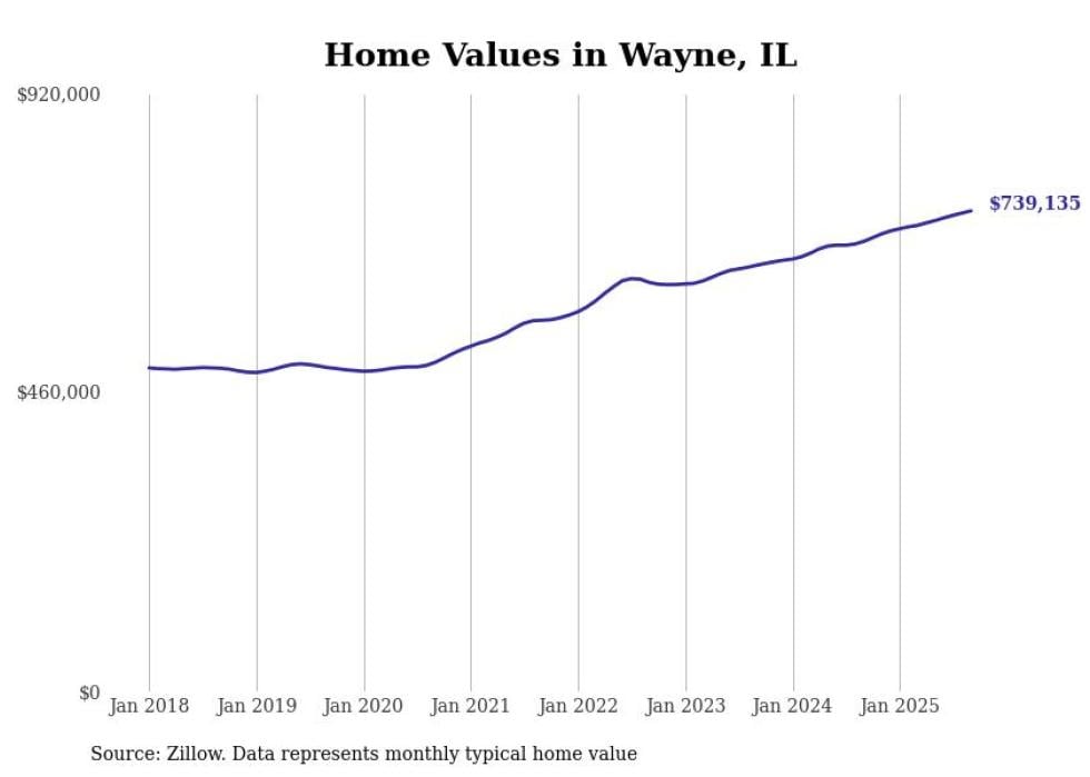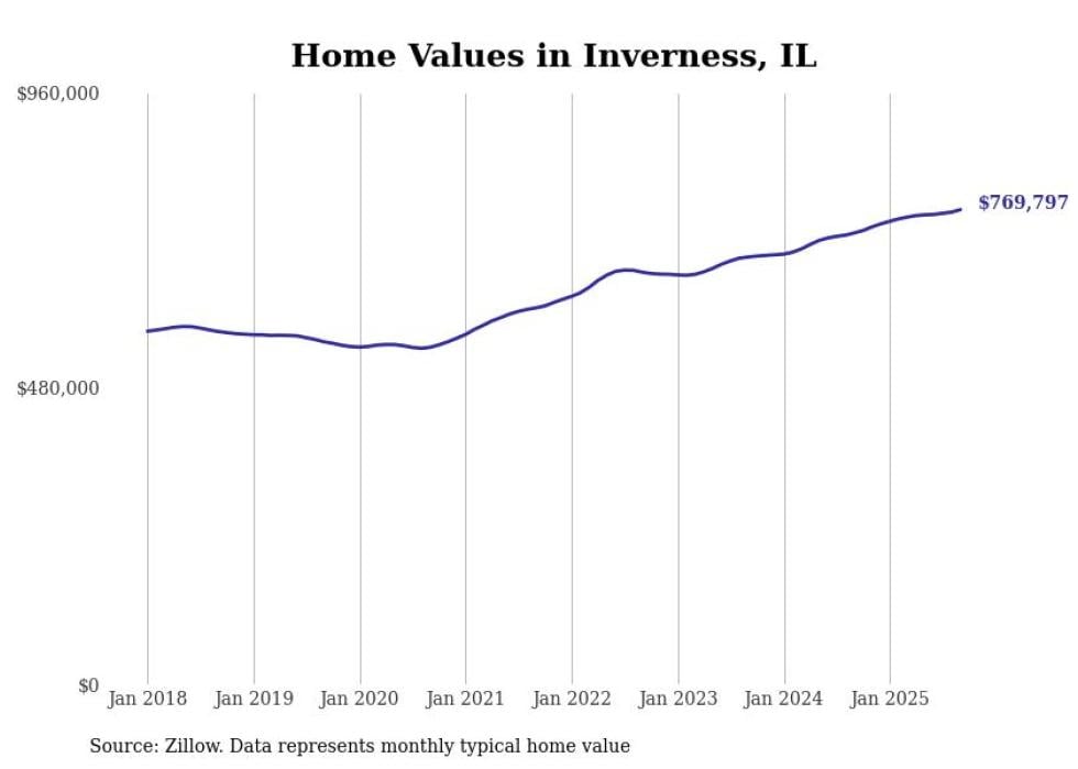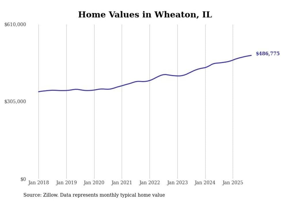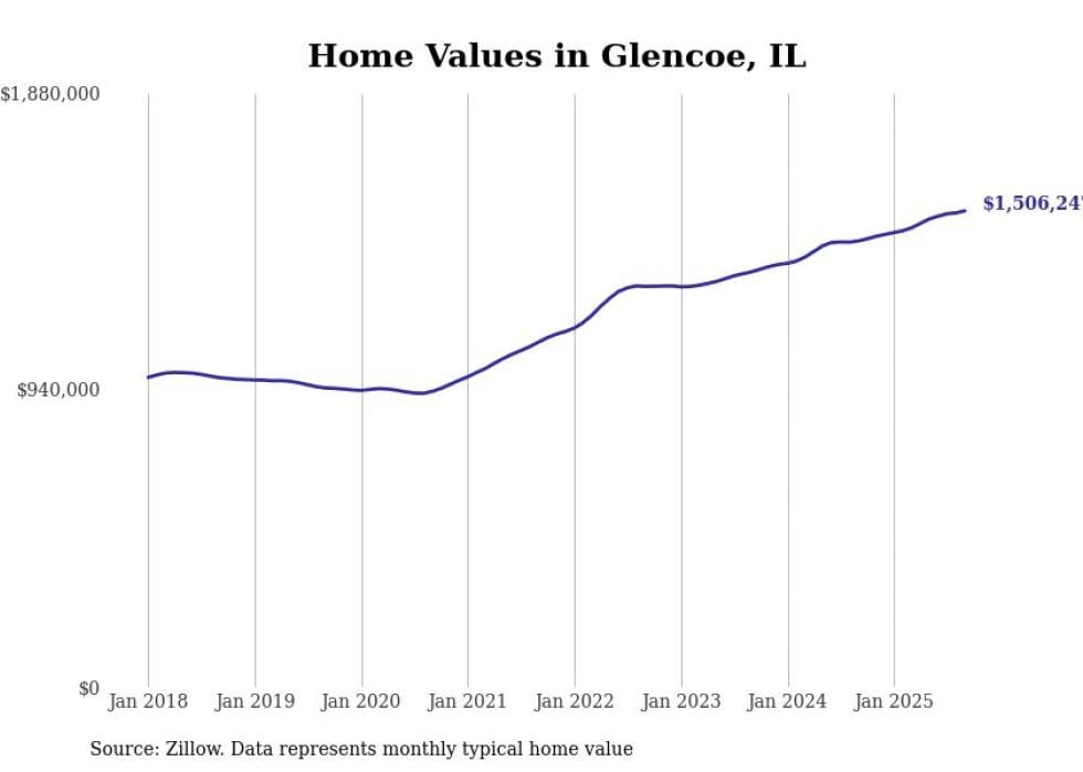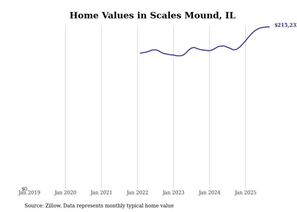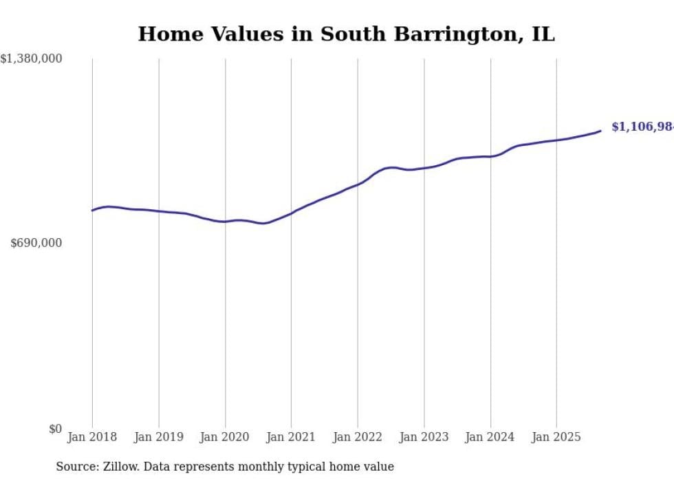 Stacker compiled a list of cities with the fastest-growing home prices in Illinois using data from Zillow. Cities are ranked by the dollar change in the Zillow Home Values Index for all homes from the 12 months ending September 2025. The charts in this story were created automatically using Matplotlib. Data was available for 50 cities and towns in Illinois.