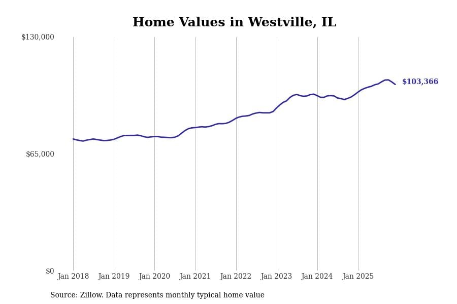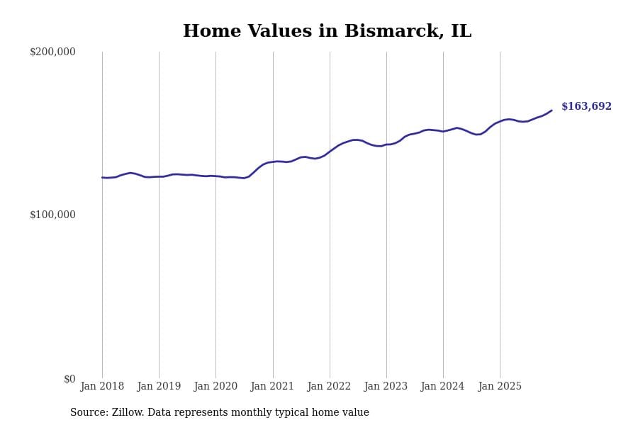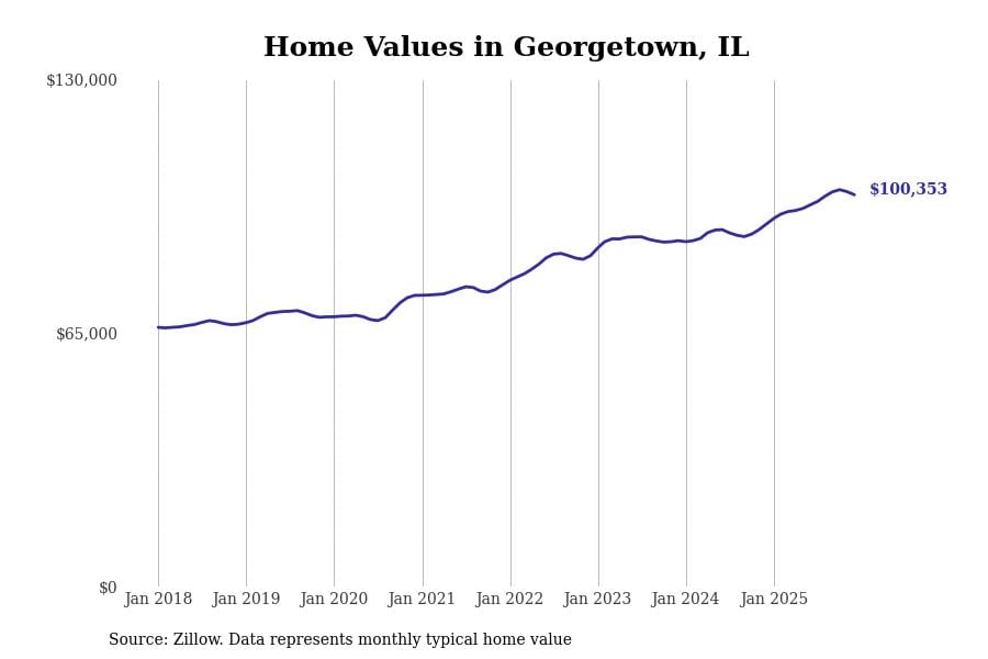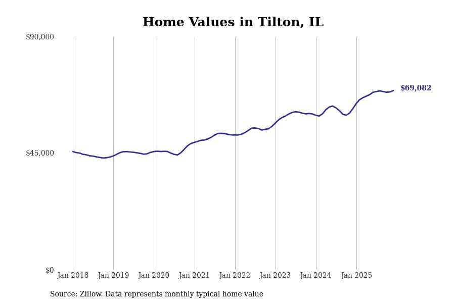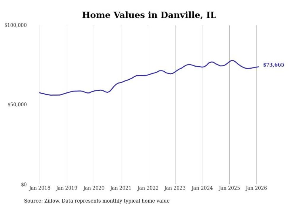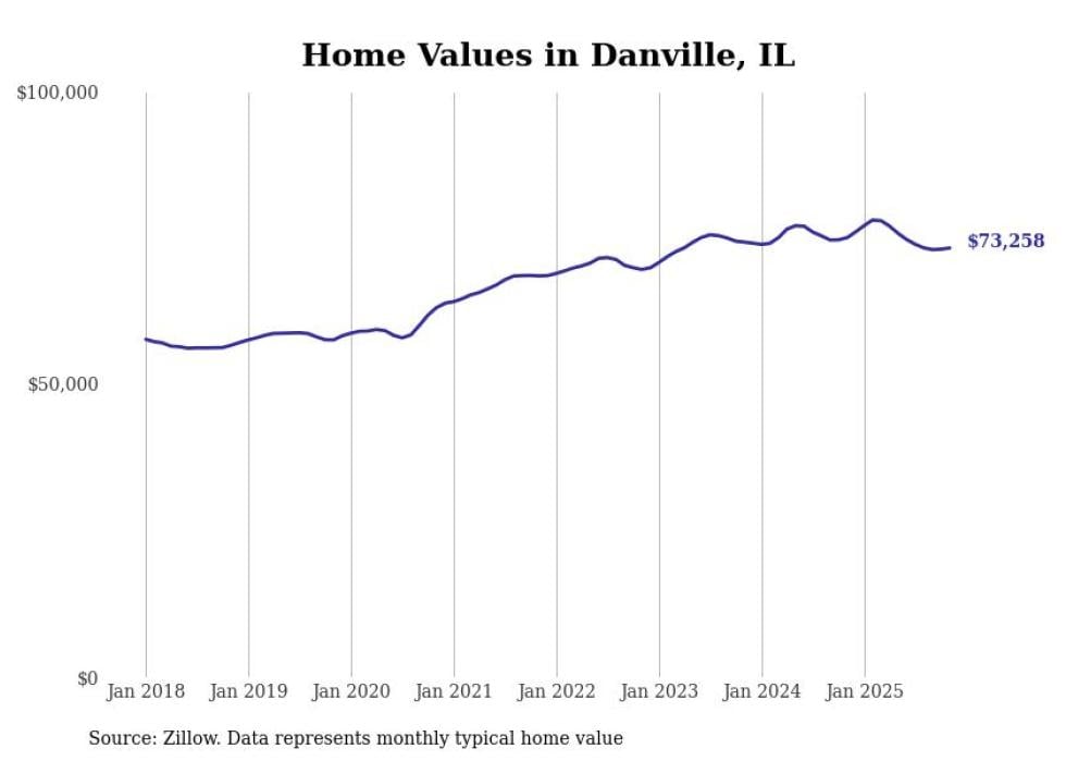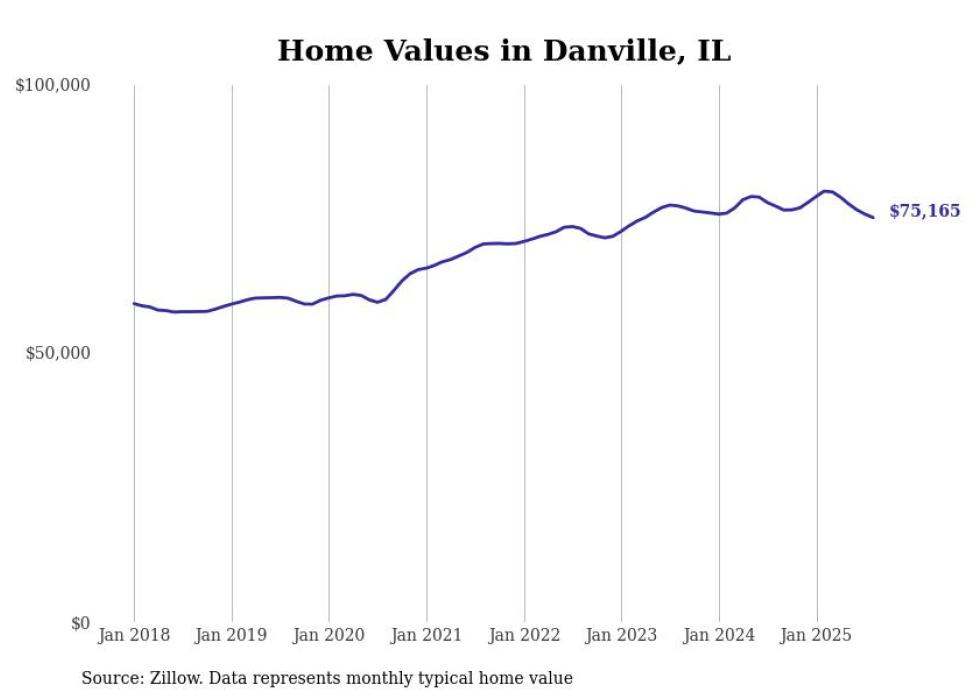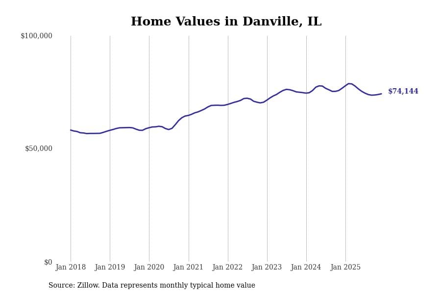 Stacker compiled a list of cities with the most expensive homes in the Danville, IL metro area using data from Zillow. Charts show the monthly typical home value since January 2018.