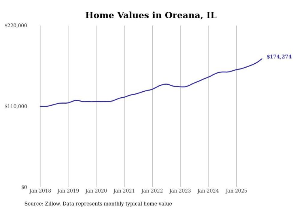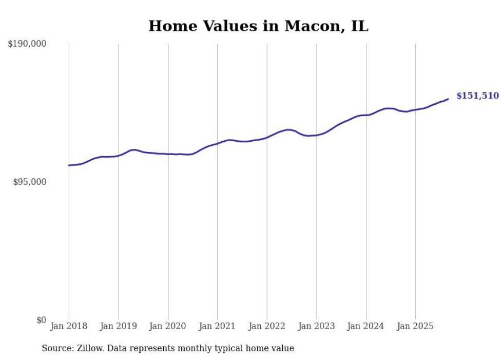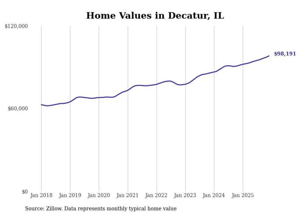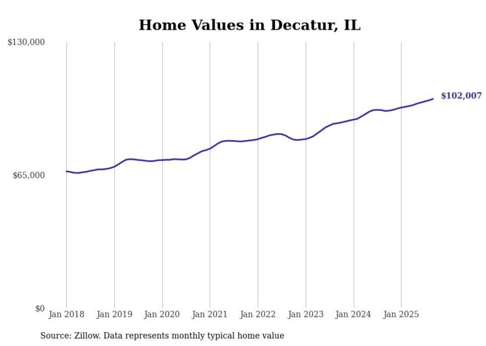 Stacker compiled a list of cities with the most expensive homes in the Decatur, Illinois metro area using data from Zillow. Charts show the monthly typical home value since January 2018. All 12 cities and towns with data available were included in the list.