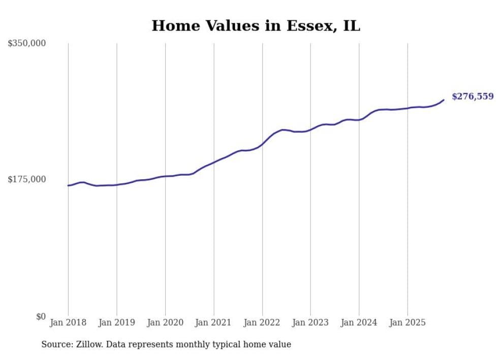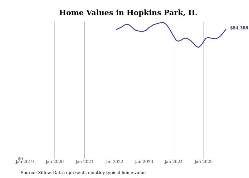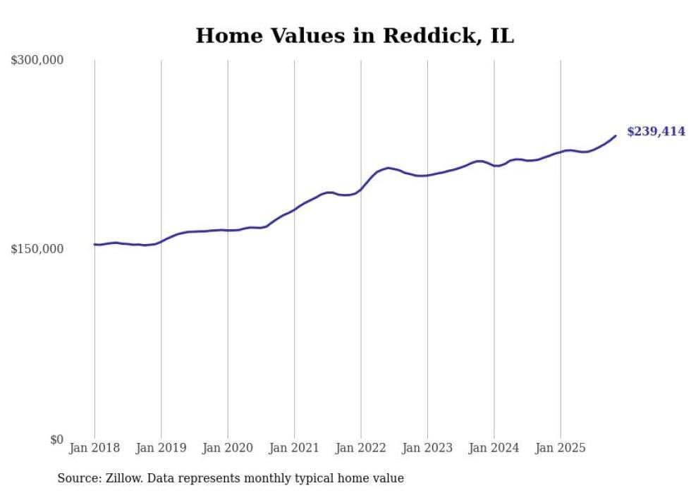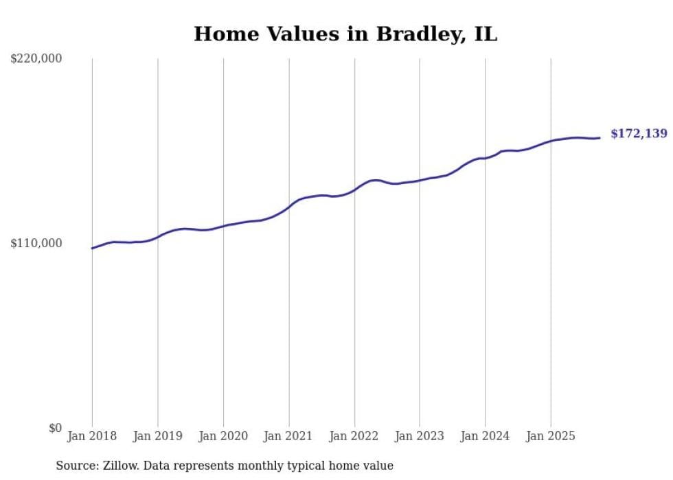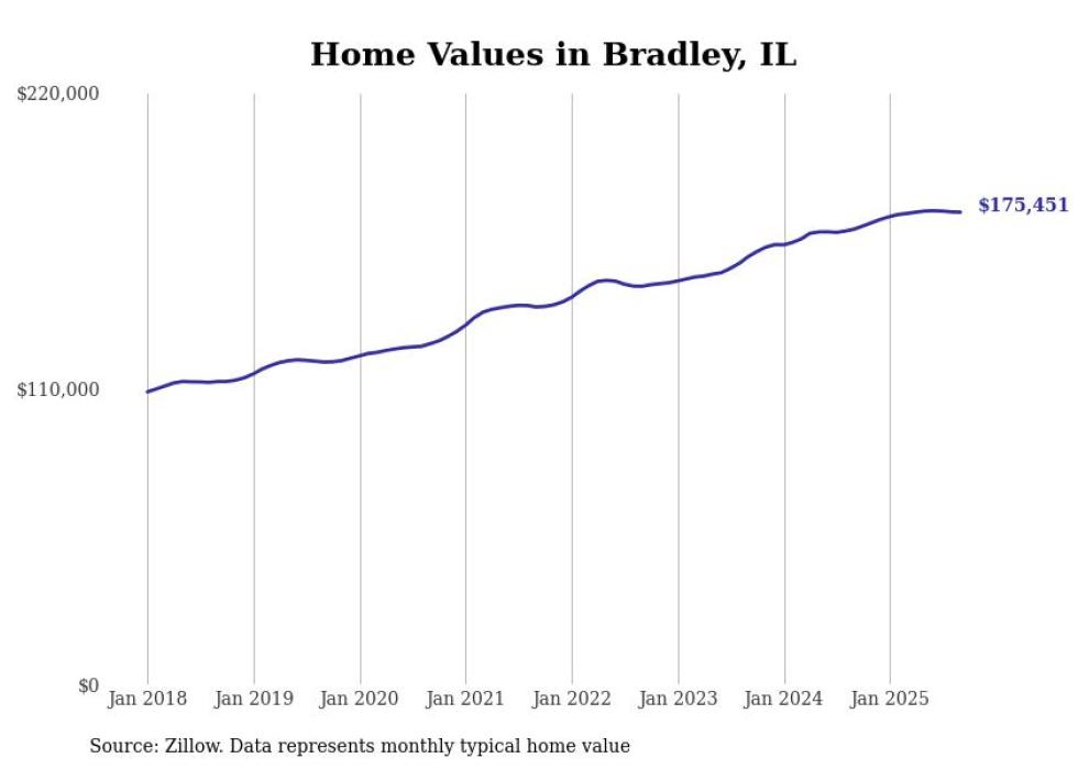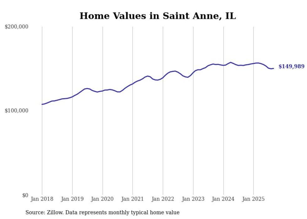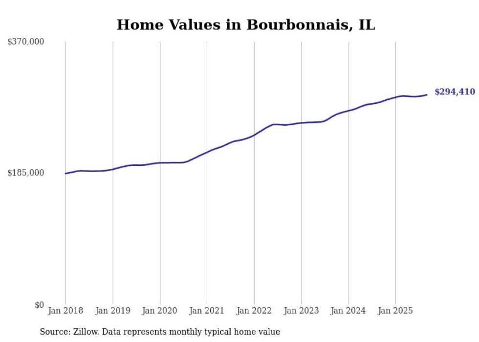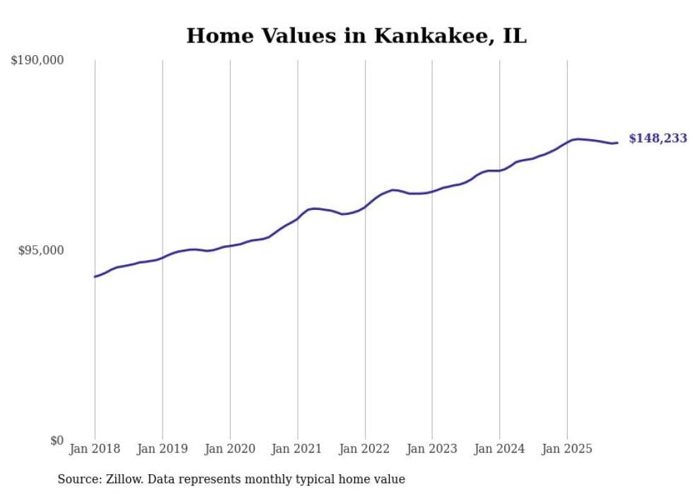 Stacker compiled a list of cities with the most expensive homes in the Kankakee metro area using data from Zillow. Charts show the monthly typical home value since January 2018. All 15 cities and towns with data available were included in the list.