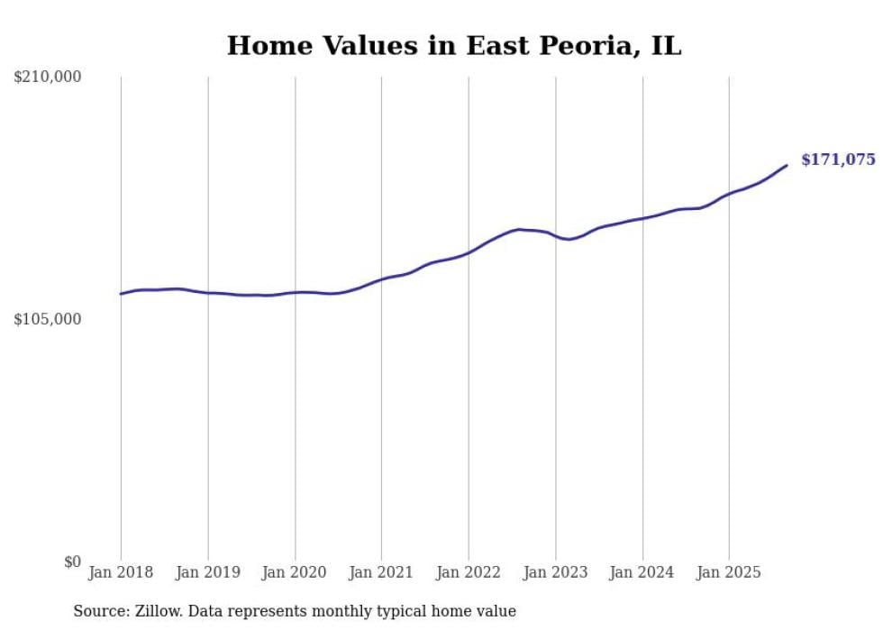 Stacker compiled a list of cities with the most expensive homes in the Peoria, IL metro area using data from Zillow. Charts show the monthly typical home value since January 2018.