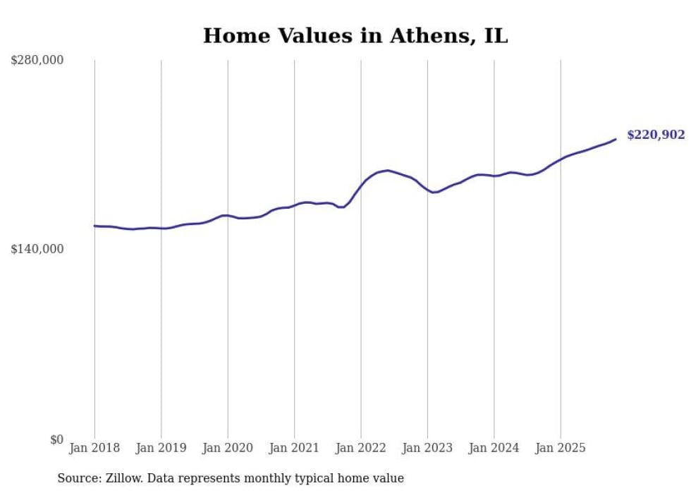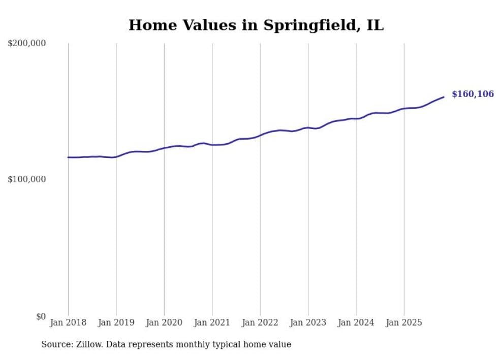 Stacker compiled a list of cities with the most expensive homes in the Springfield, Illinois metro area using data from Zillow. Charts show the monthly typical home value since January 2018. All 28 cities and towns with data available were included in the list.