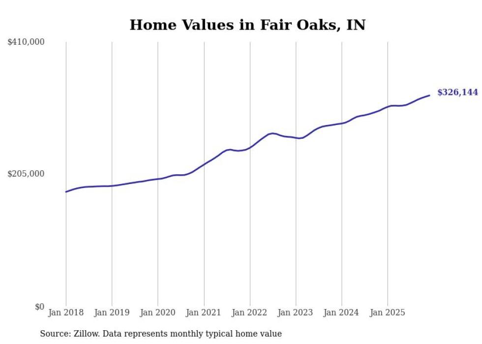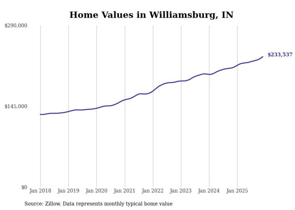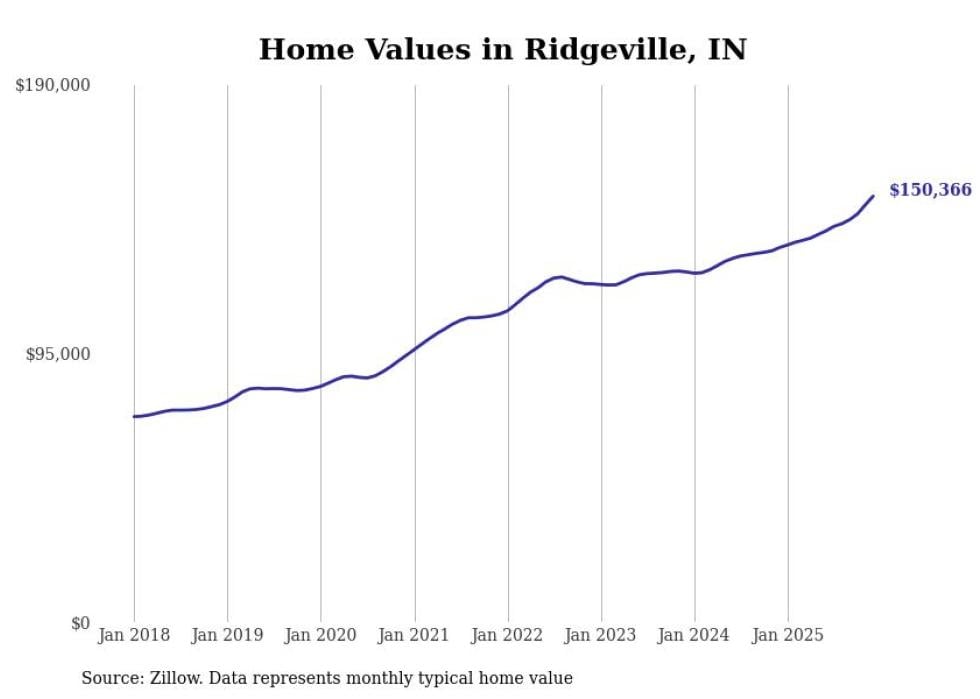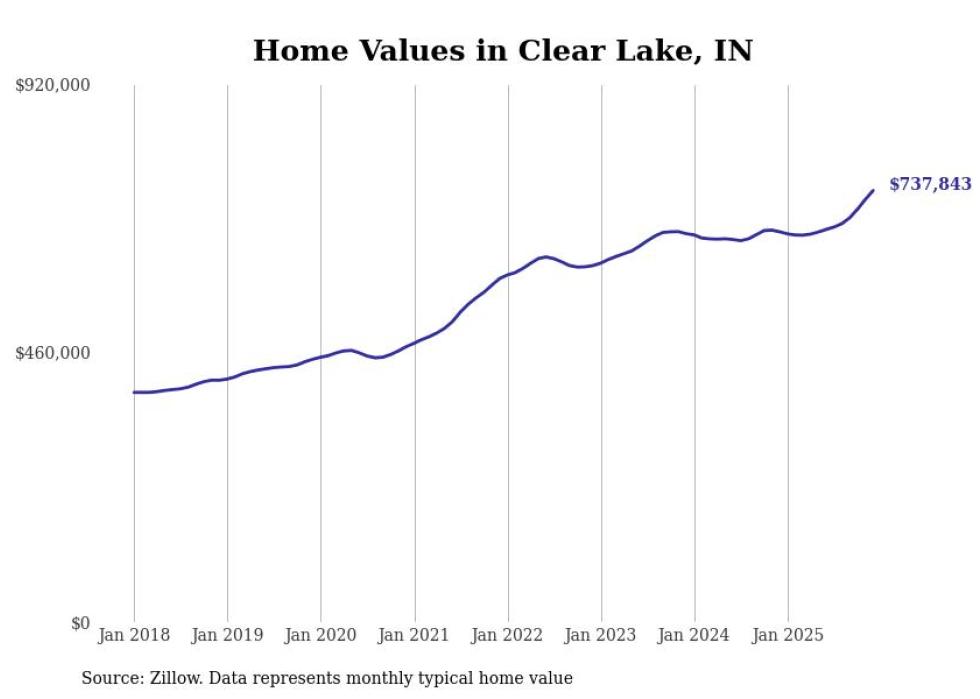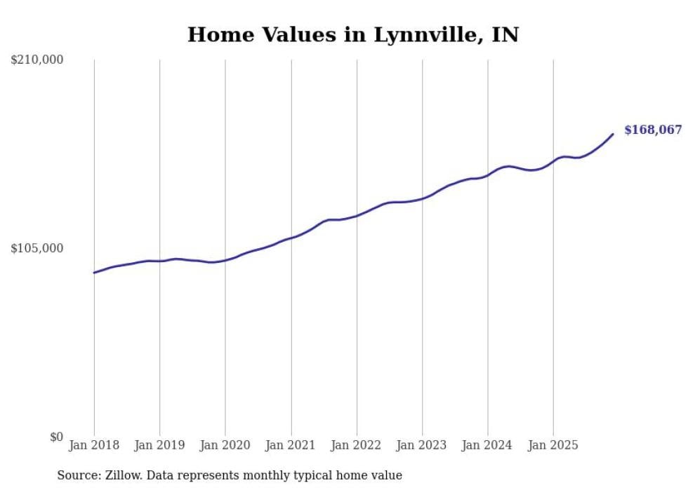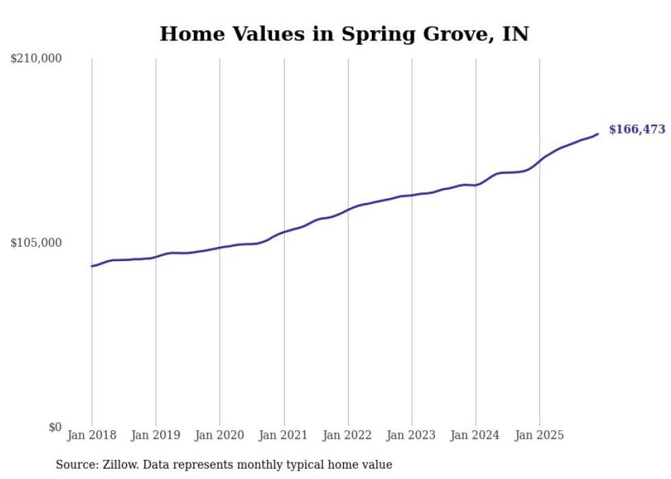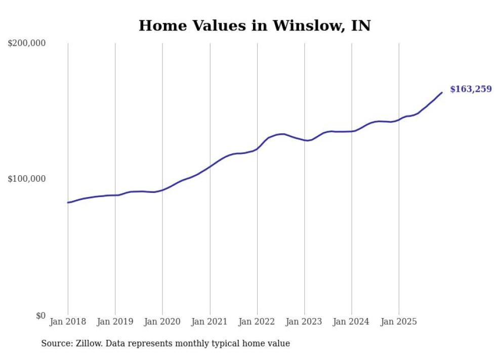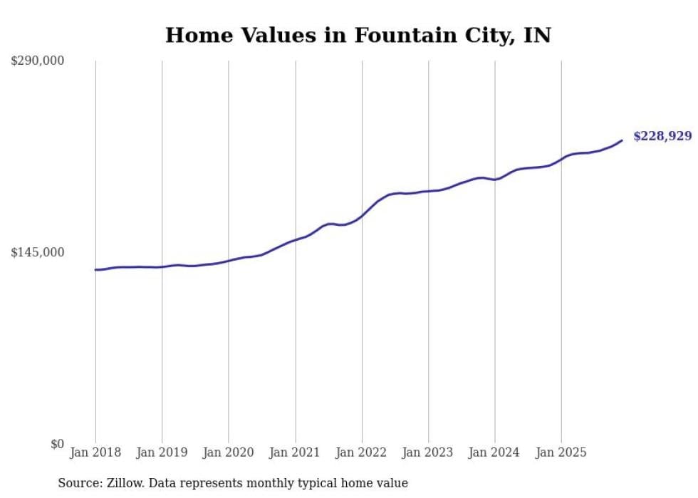 Stacker compiled a list of cities with the fastest-growing home prices in Indiana using data from Zillow. Cities are ranked by the dollar change in the Zillow Home Values Index for all homes from the 12 months ending December 2025. The charts in this story were created automatically using Matplotlib. Data was available for 50 cities and towns in Indiana.