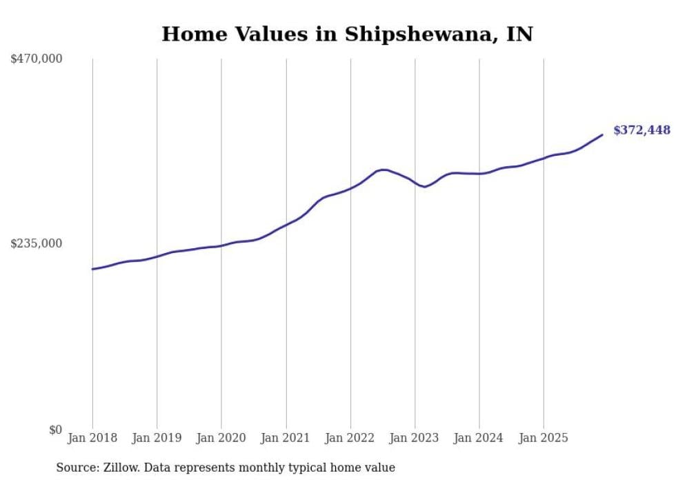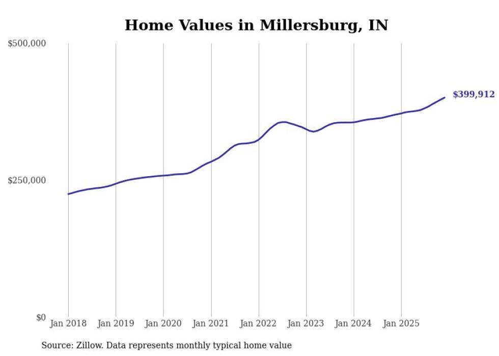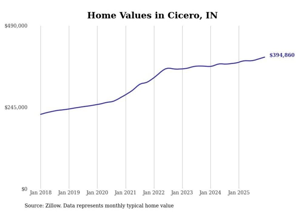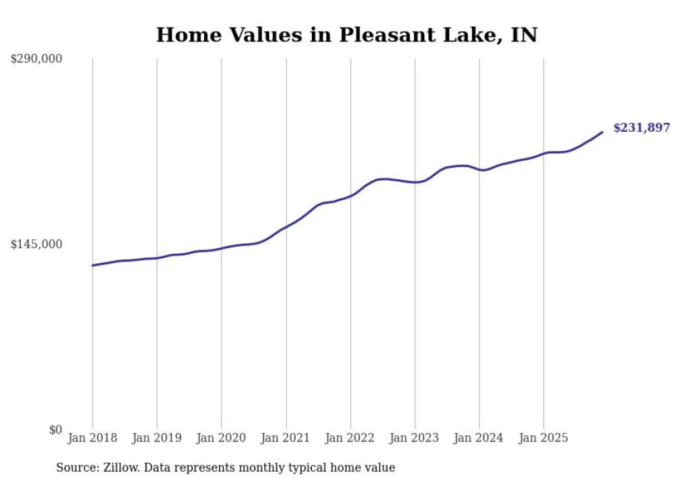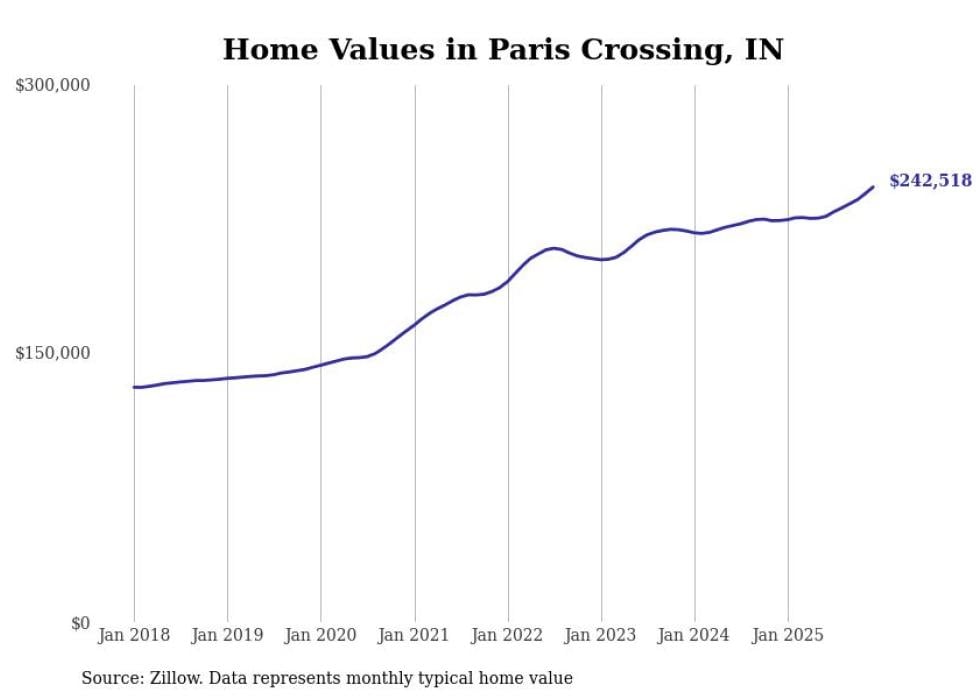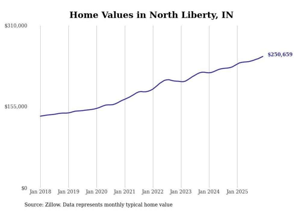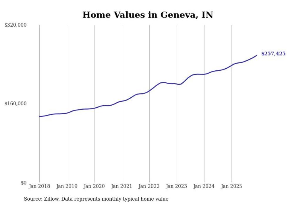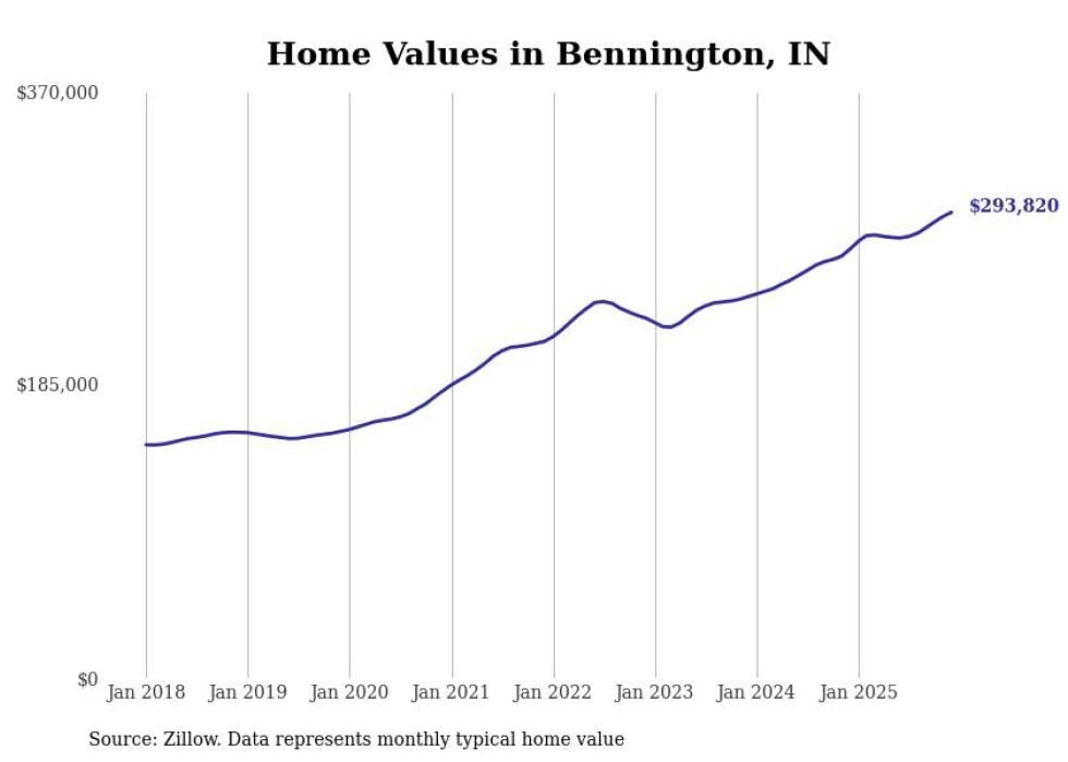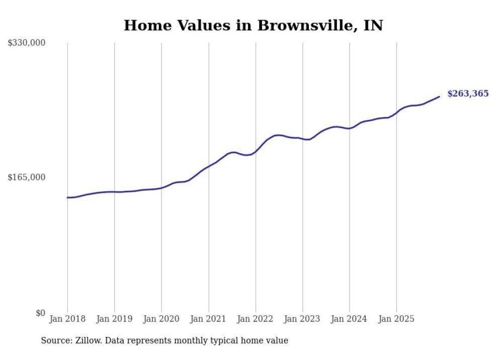 Stacker compiled a list of cities with the fastest-growing home prices in Indiana using data from Zillow. Cities are ranked by the dollar change in the Zillow Home Values Index for all homes from the 12 months ending December 2025. The charts in this story were created automatically using Matplotlib. Data was available for 50 cities and towns in Indiana.