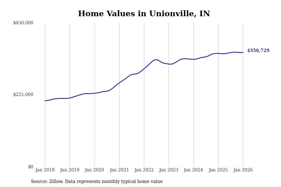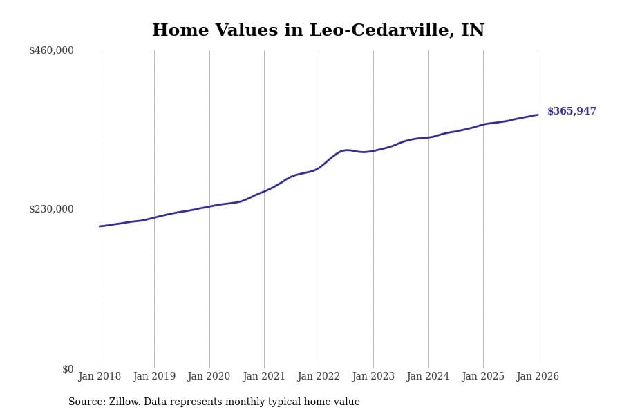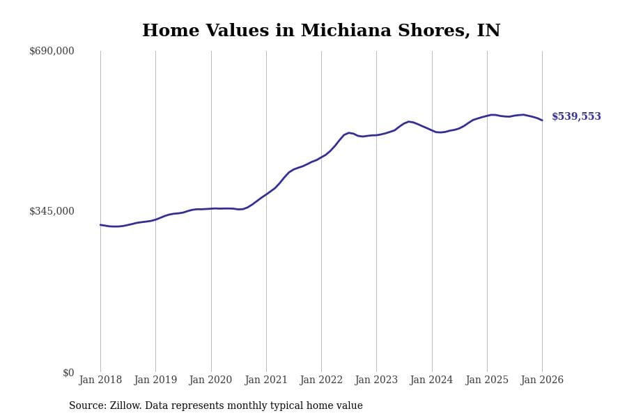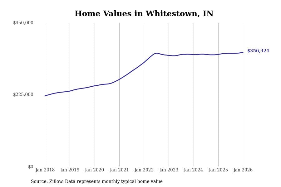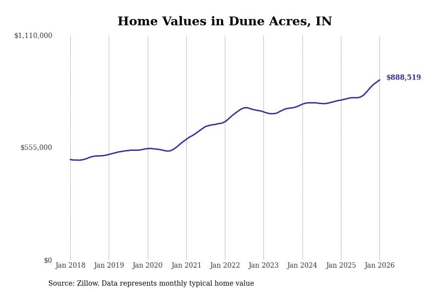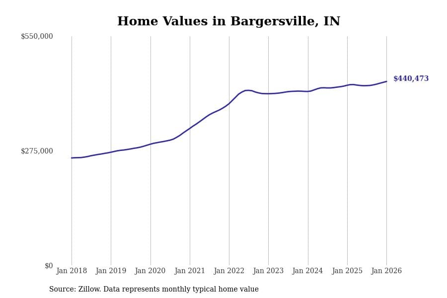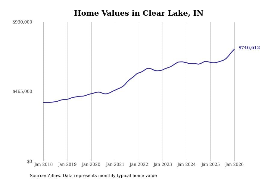 Stacker compiled a list of cities with the most expensive homes in Indiana using data from Zillow. Cities are ranked by the Zillow Home Values Index for all homes as of January 2026. The charts in this story were created automatically using Matplotlib.