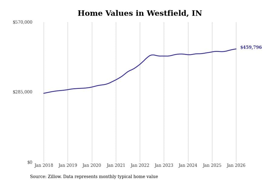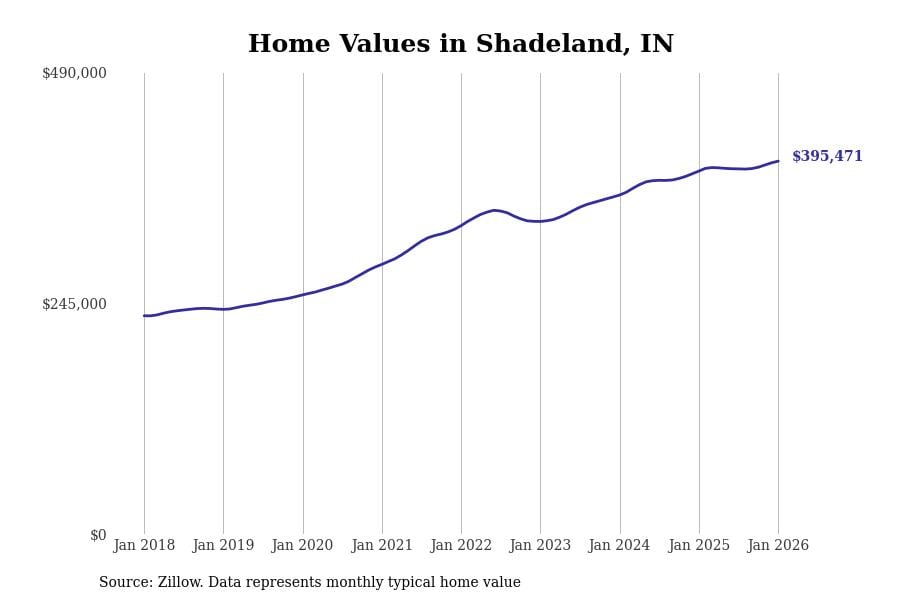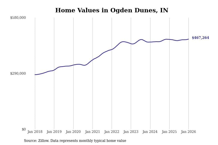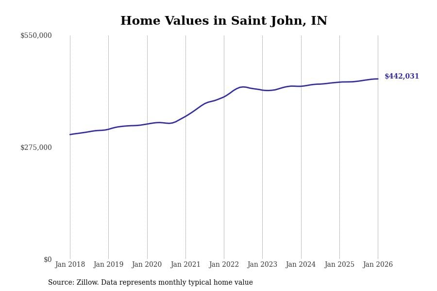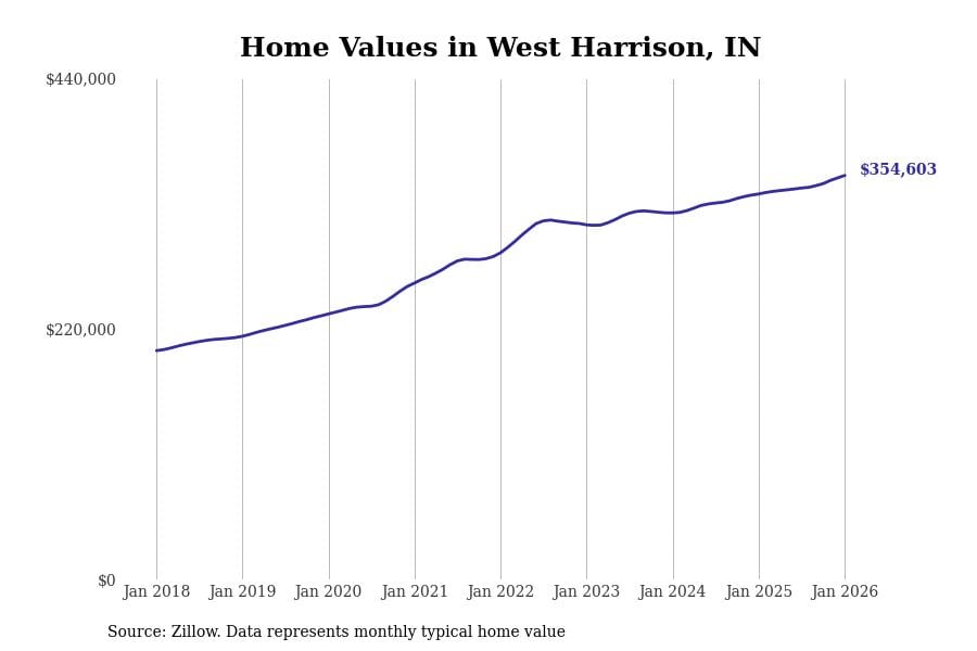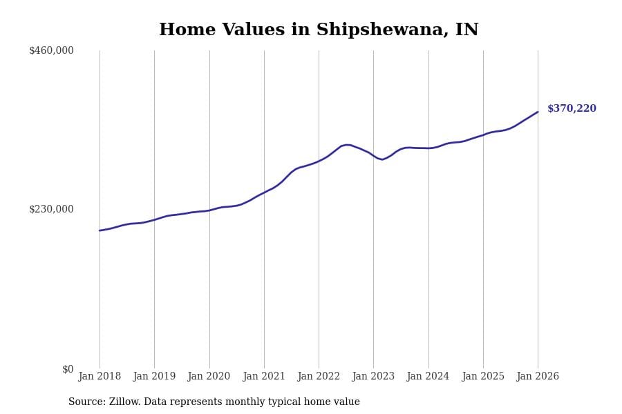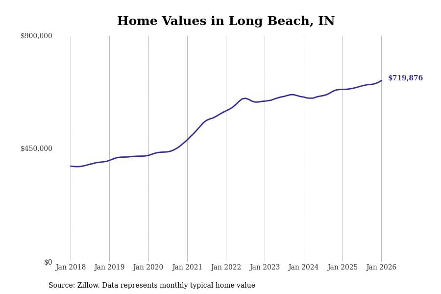 Stacker compiled a list of cities with the most expensive homes in Indiana using data from Zillow. Cities are ranked by the Zillow Home Values Index for all homes as of January 2026. The charts in this story were created automatically using Matplotlib.
