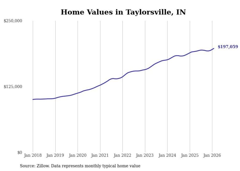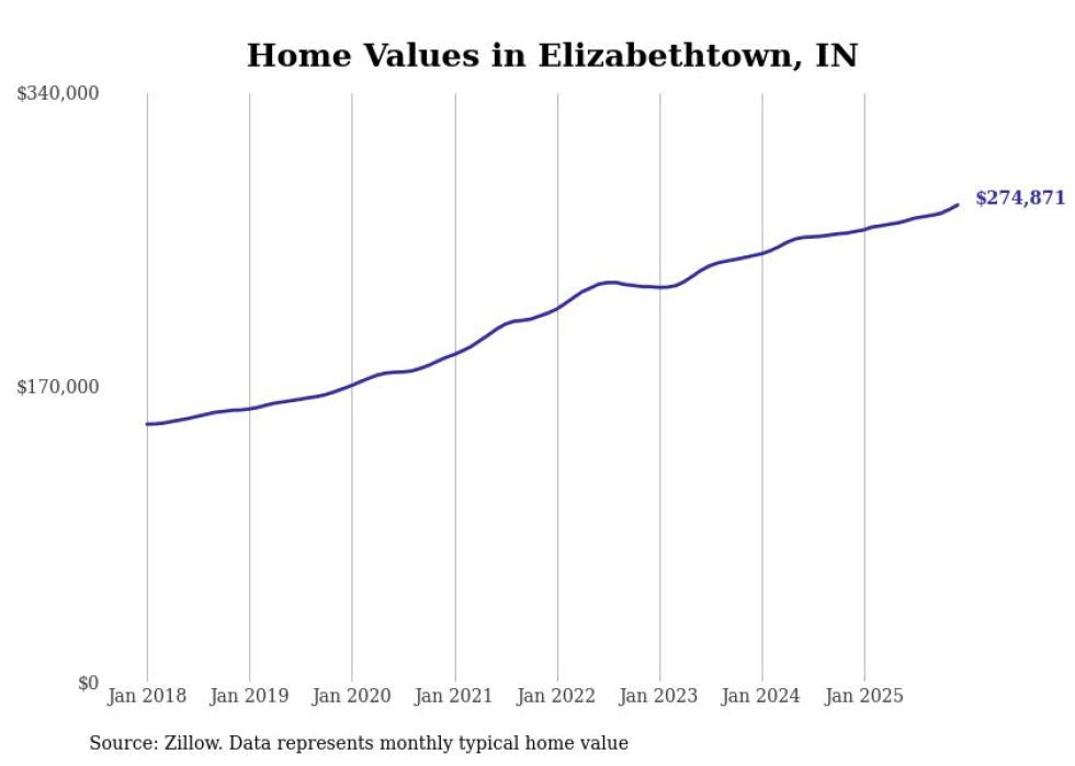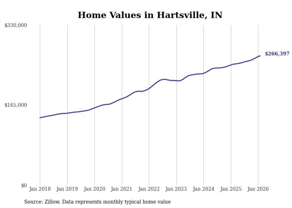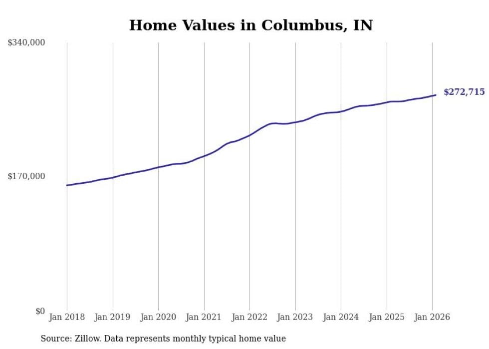 Stacker compiled a list of cities with the most expensive homes in the Columbus, Indiana metro area using data from Zillow. Charts show the monthly typical home value since January 2018. All 5 cities and towns with data available were included in the list.