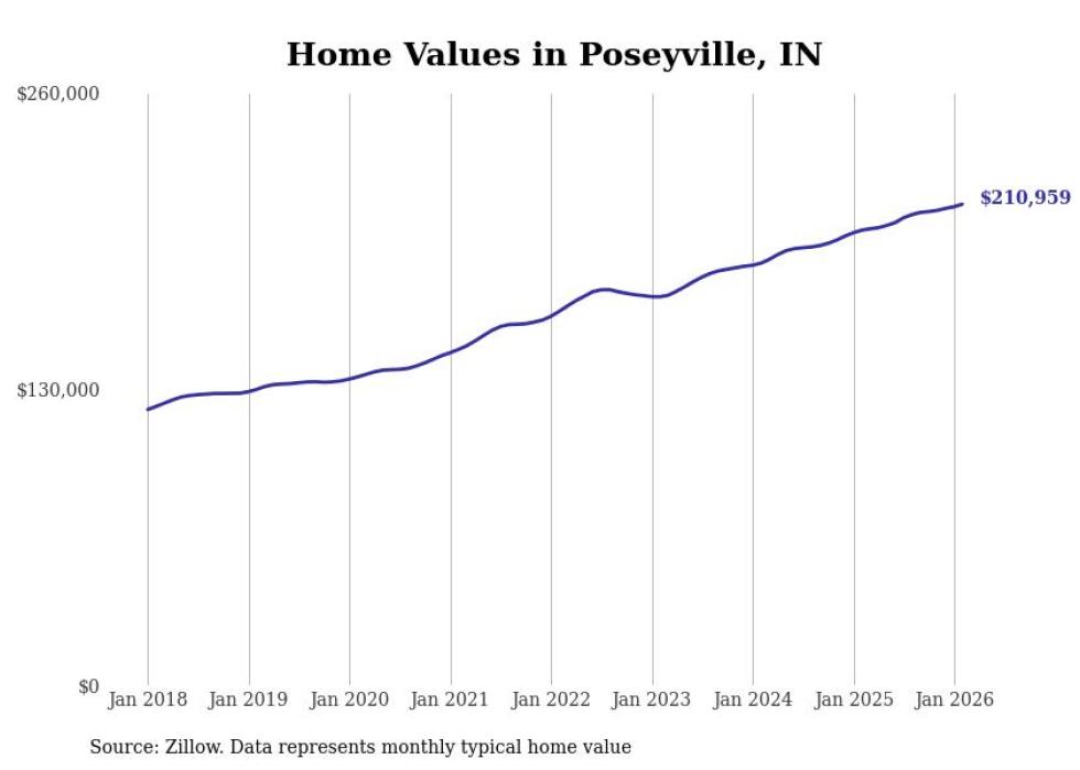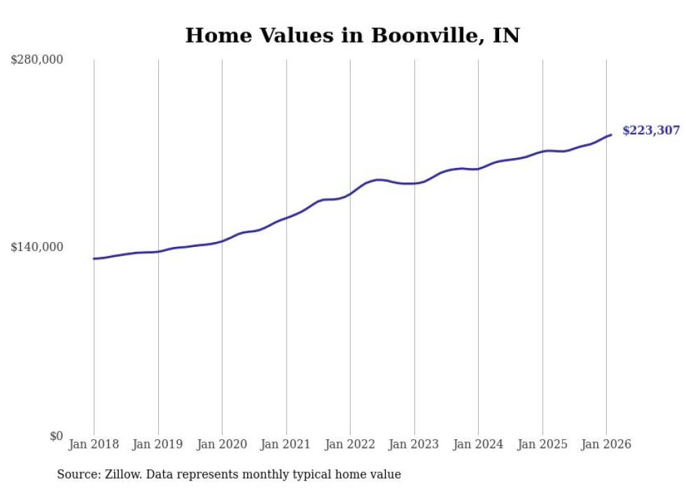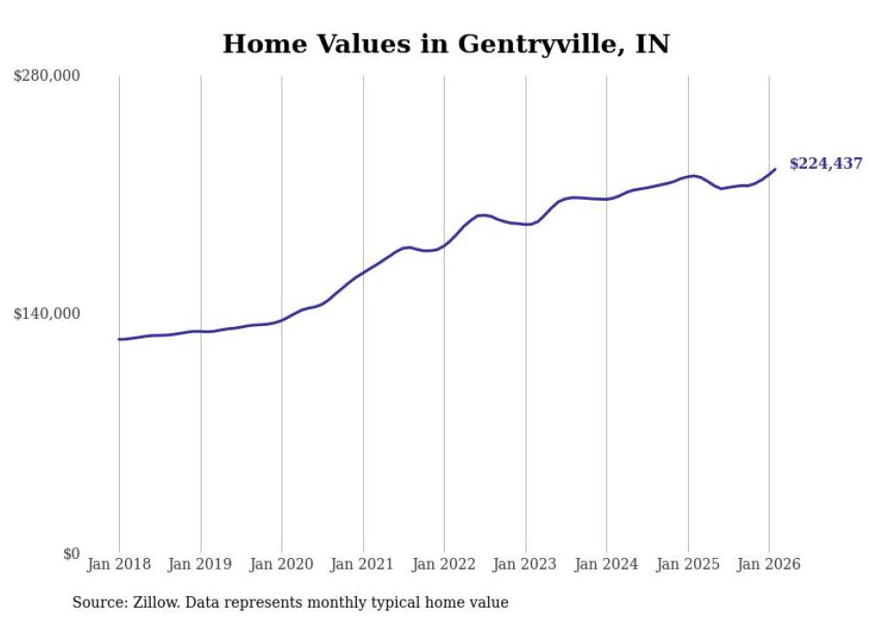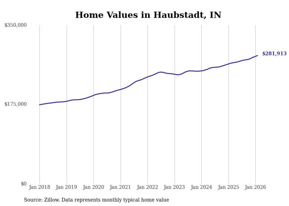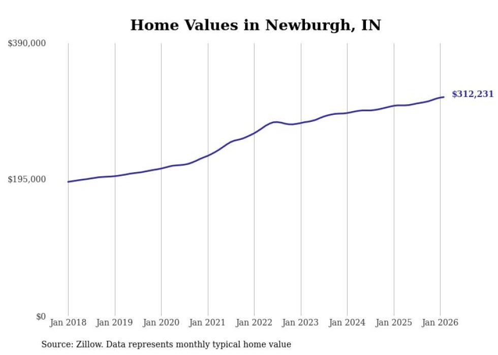 Stacker compiled a list of cities with the most expensive homes in the Evansville, IN-KY metro area using data from Zillow. Charts show the monthly typical home value since January 2018.