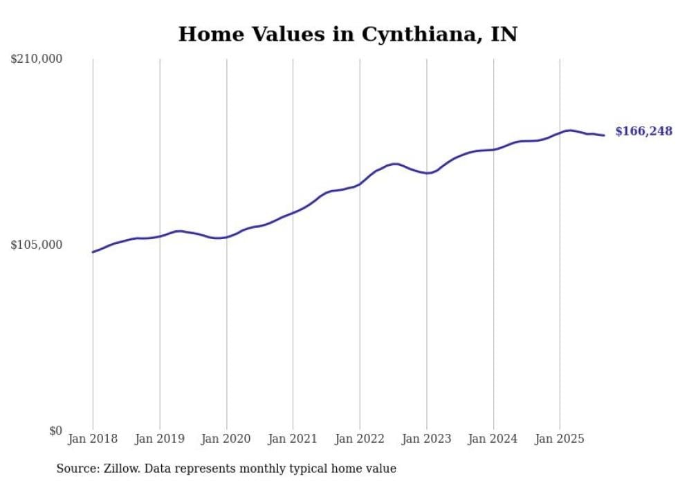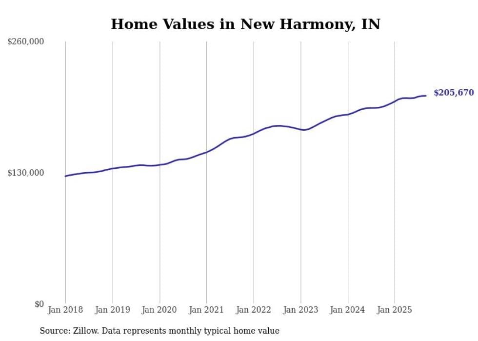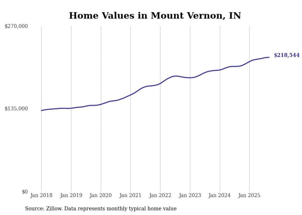 Stacker compiled a list of cities with the most expensive homes in the Evansville metro area using data from Zillow. Charts show the monthly typical home value since January 2018. All 23 cities and towns with data available were included in the list.