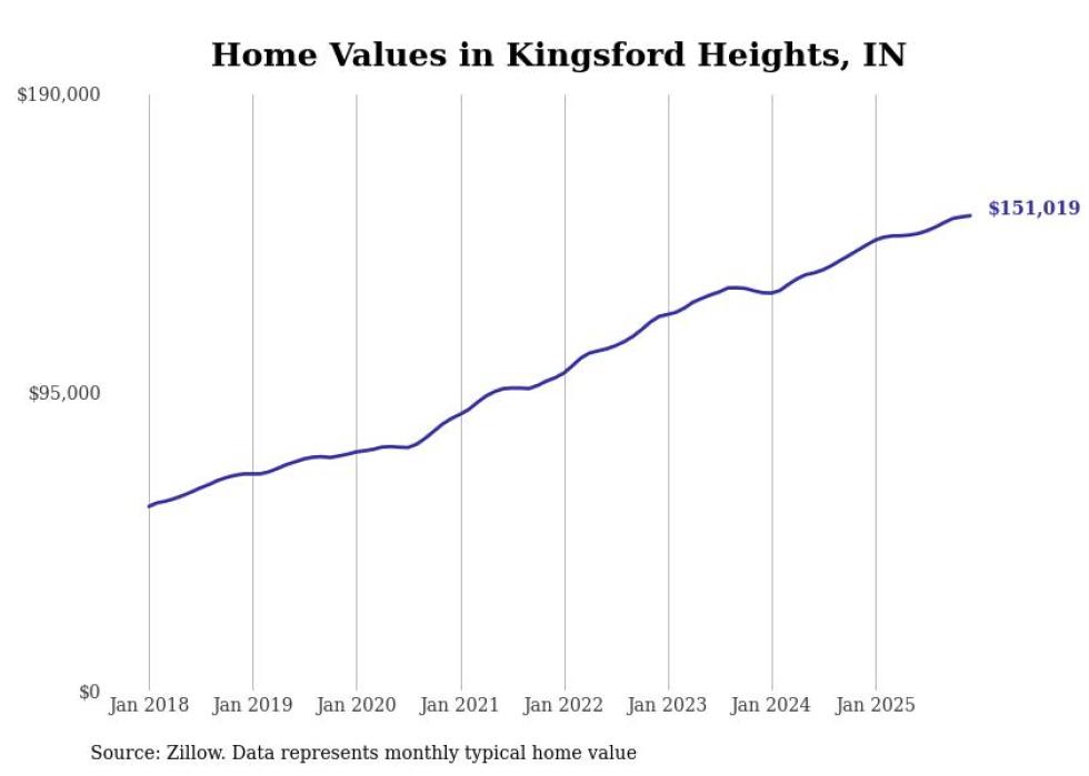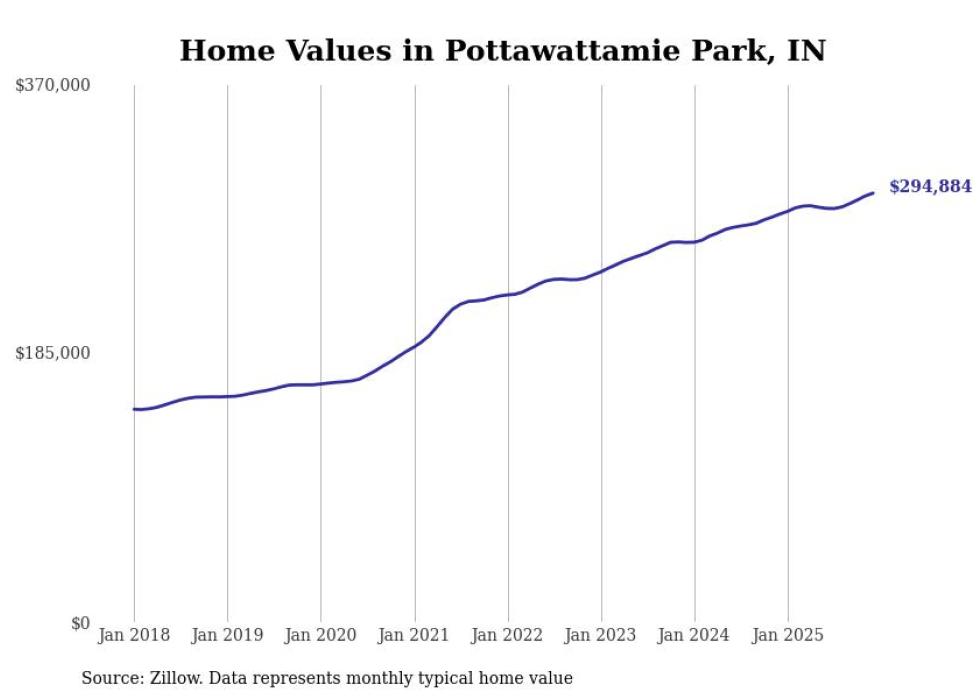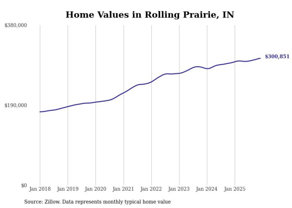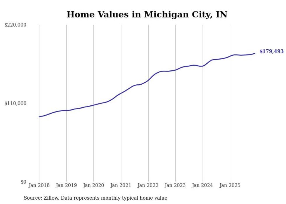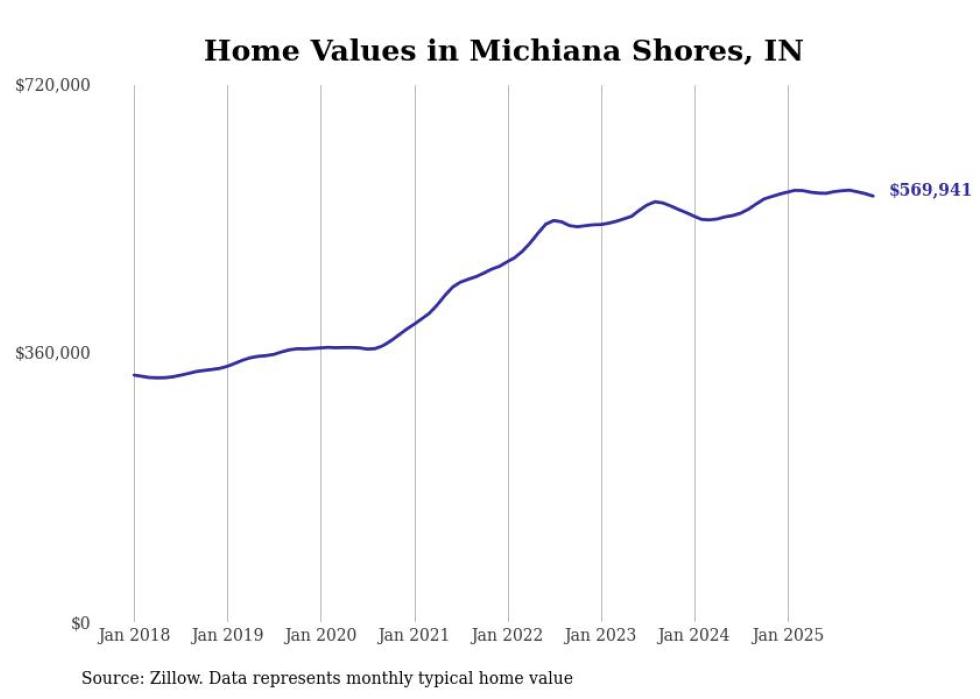 Stacker compiled a list of cities with the most expensive homes in the Michigan City metro area using data from Zillow. Charts show the monthly typical home value since January 2018. All 15 cities and towns with data available were included in the list.