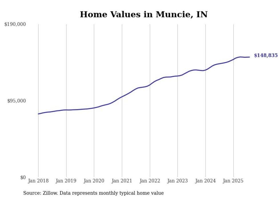 Stacker compiled a list of cities with the most expensive homes in the Muncie, IN metro area using data from Zillow. Charts show the monthly typical home value since January 2018.