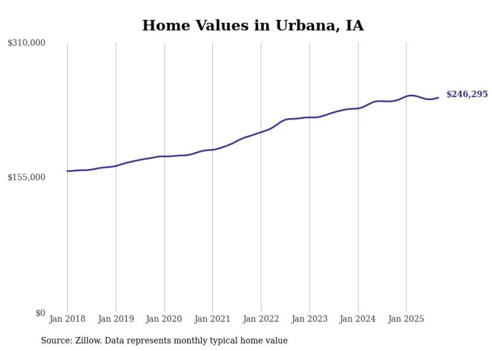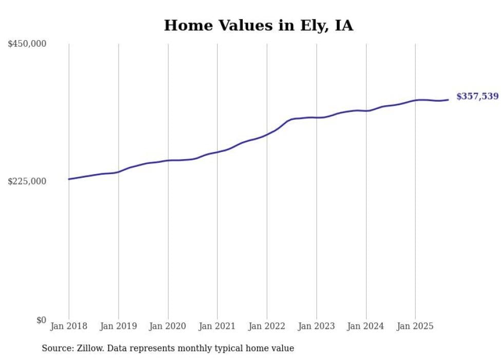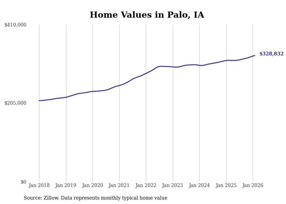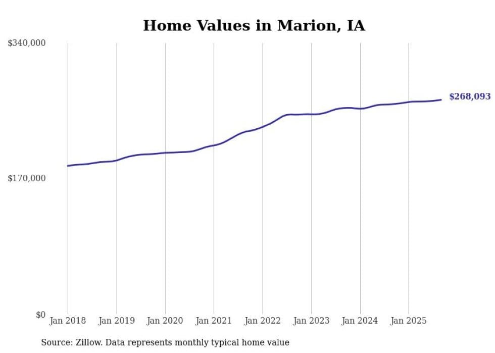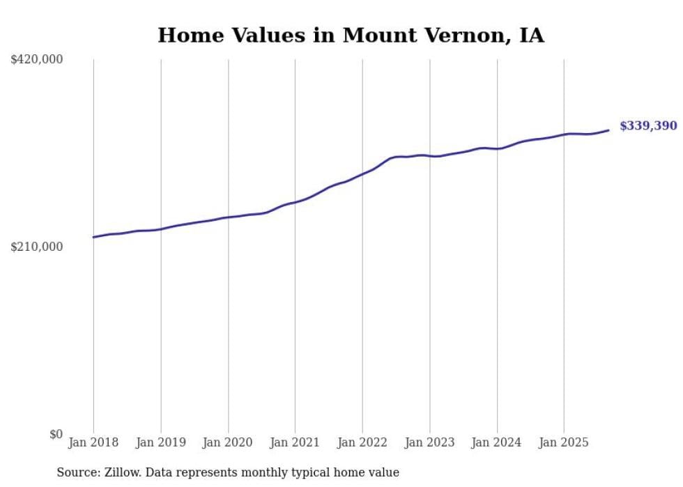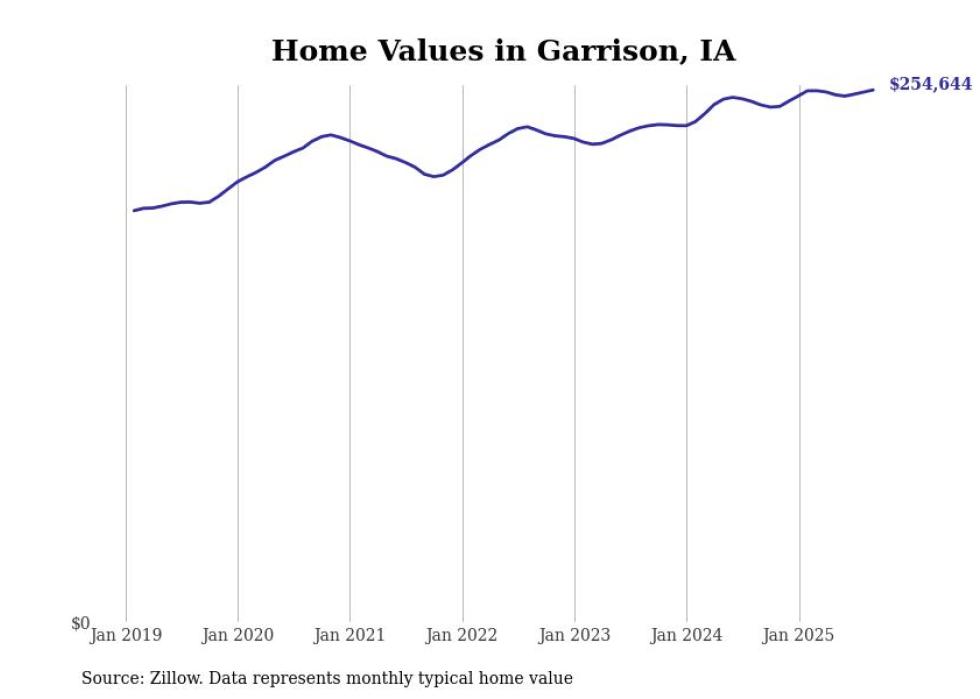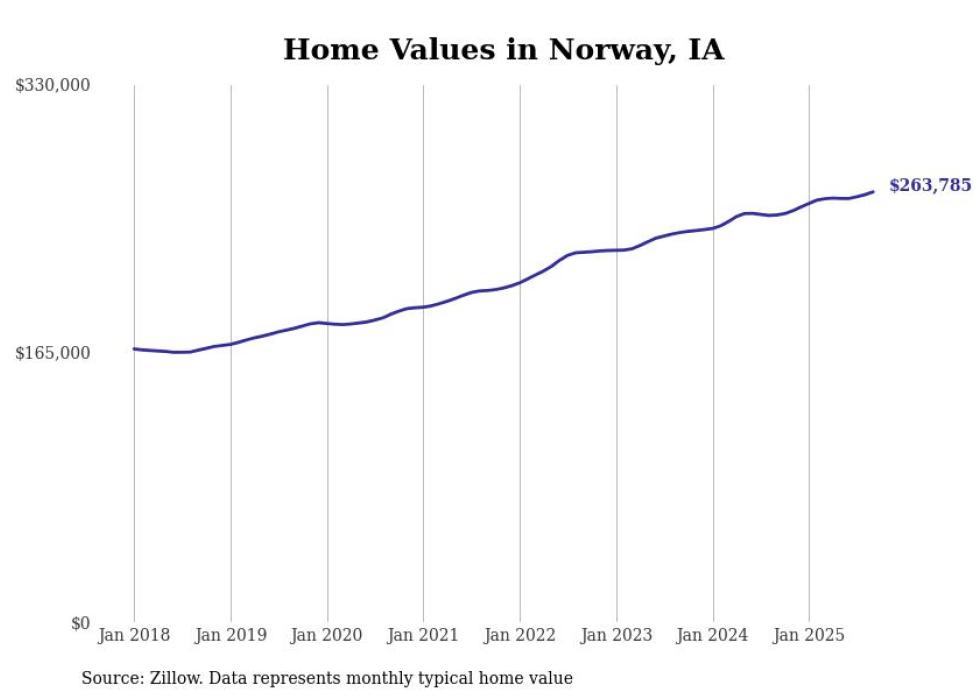 Stacker compiled a list of cities with the most expensive homes in the Cedar Rapids metro area using data from Zillow. Charts show the monthly typical home value since January 2018. Data was available for 46 cities and towns.