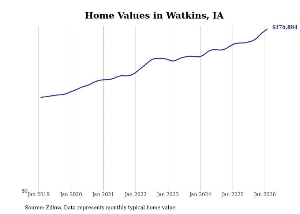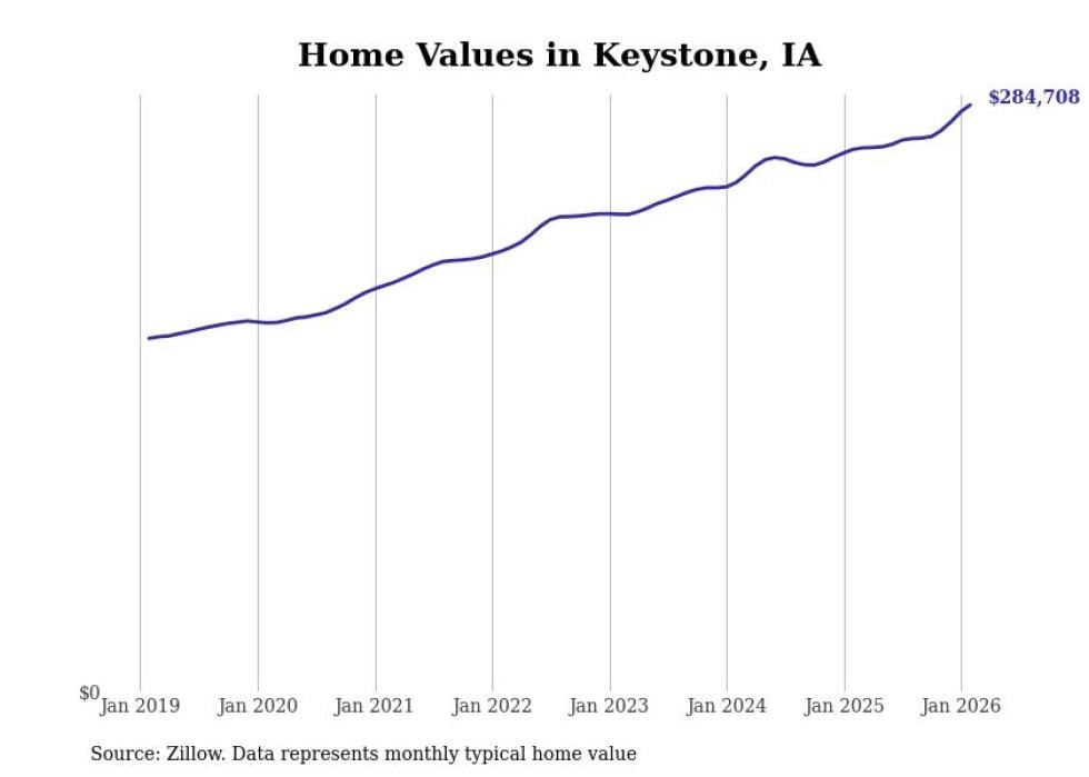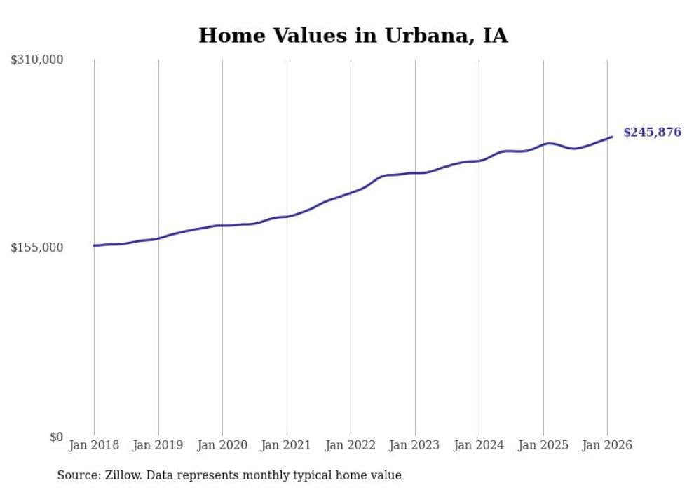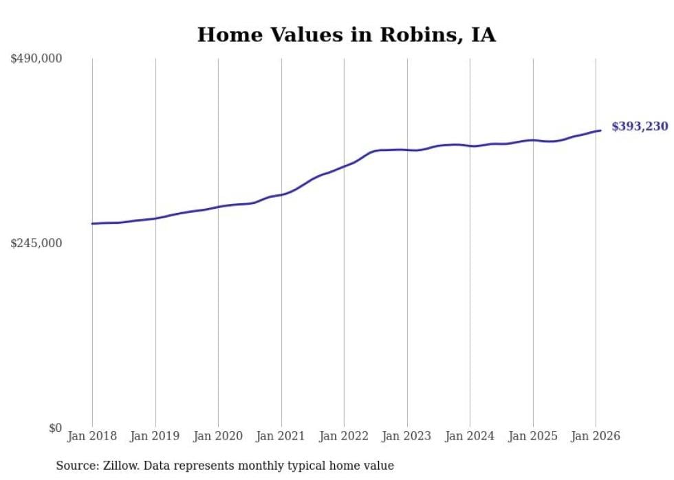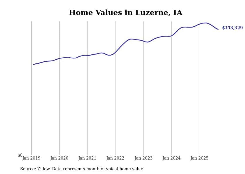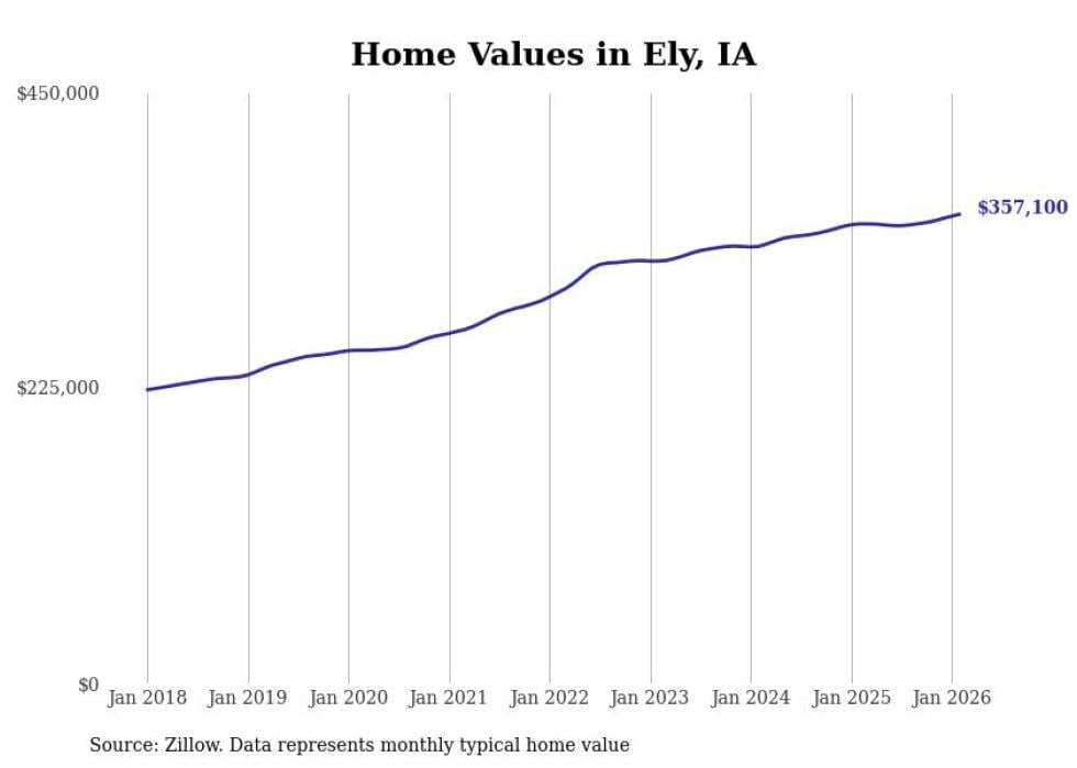 Stacker compiled a list of cities with the most expensive homes in the Cedar Rapids metro area using data from Zillow. Charts show the monthly typical home value since January 2018. Data was available for 46 cities and towns.