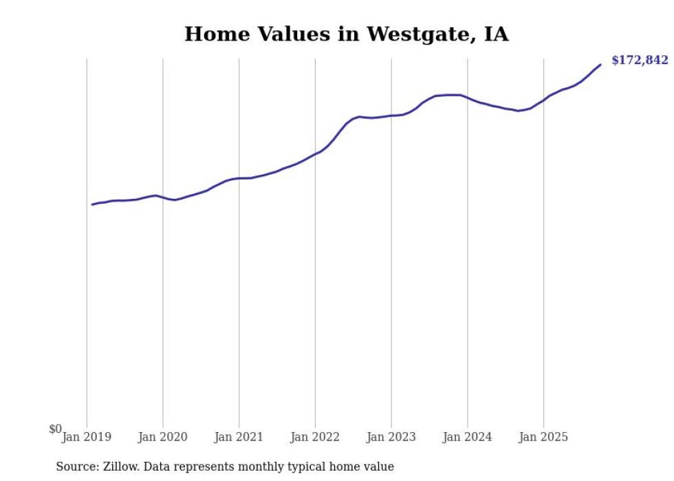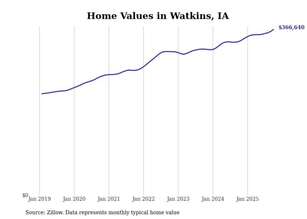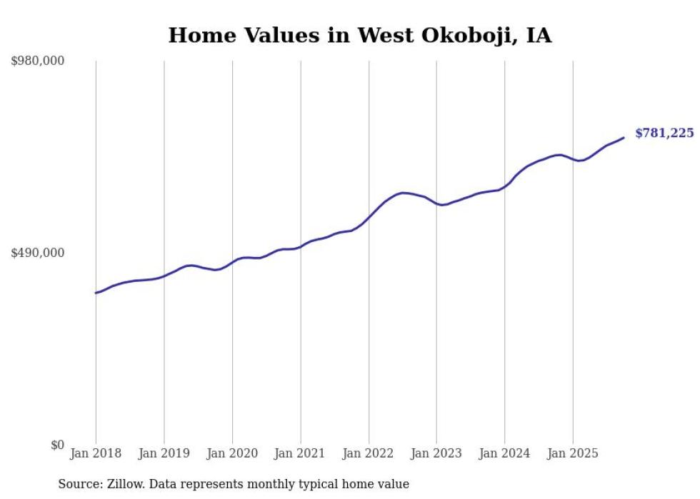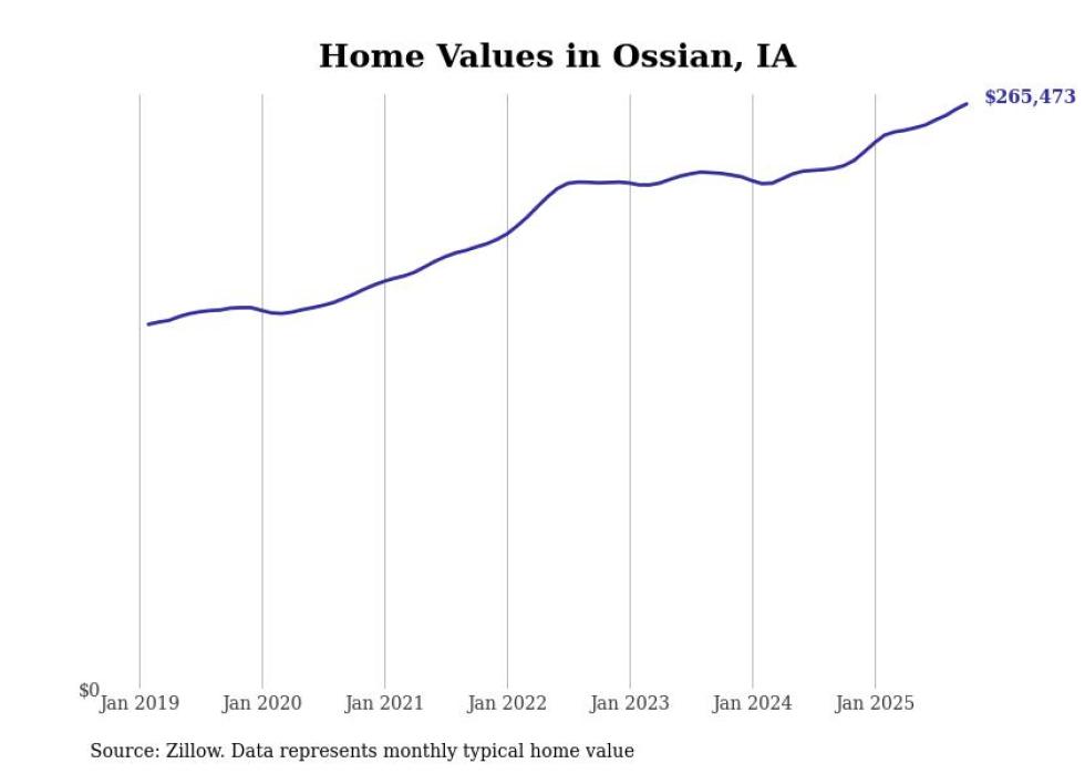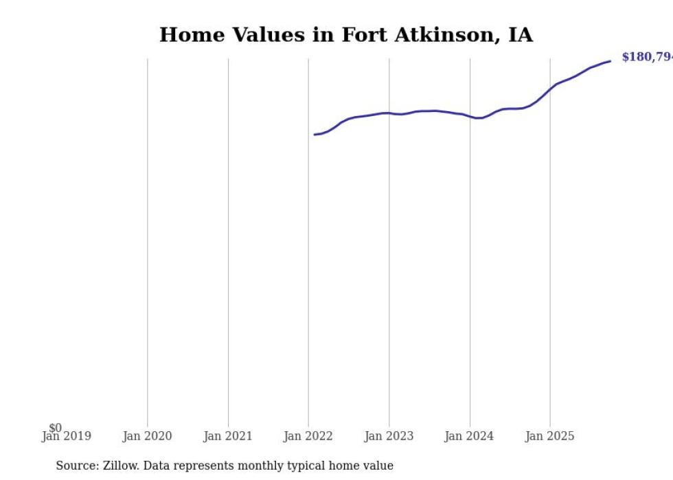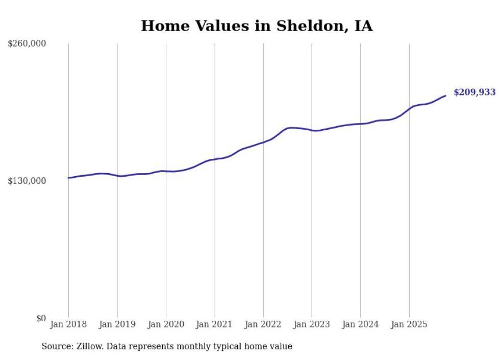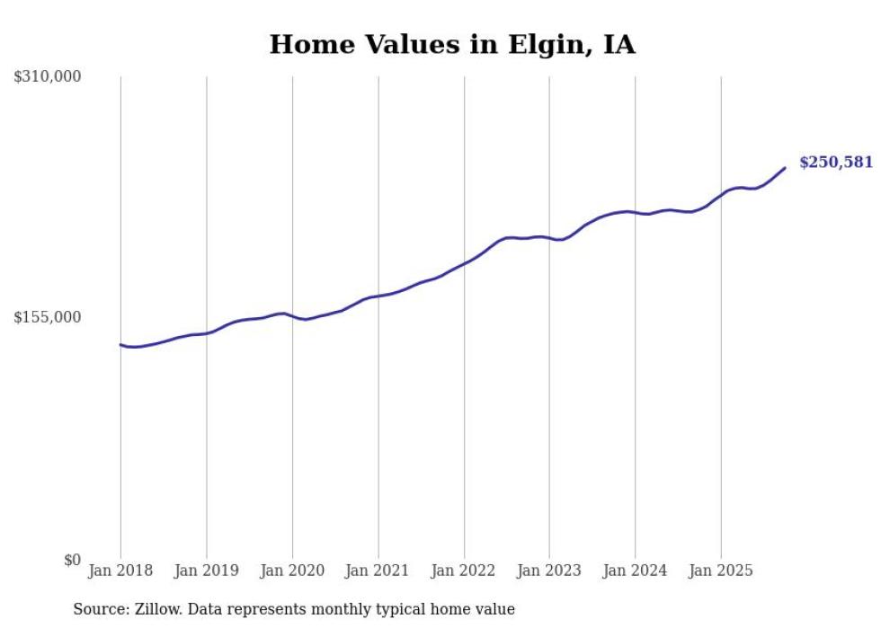 Stacker compiled a list of cities with the fastest-growing home prices in Iowa using data from Zillow. Cities are ranked by the dollar change in the Zillow Home Values Index for all homes from the 12 months ending October 2025. The charts in this story were created automatically using Matplotlib. Data was available for 50 cities and towns in Iowa.