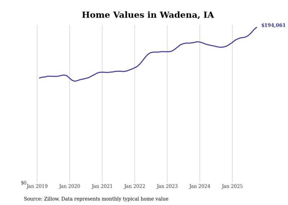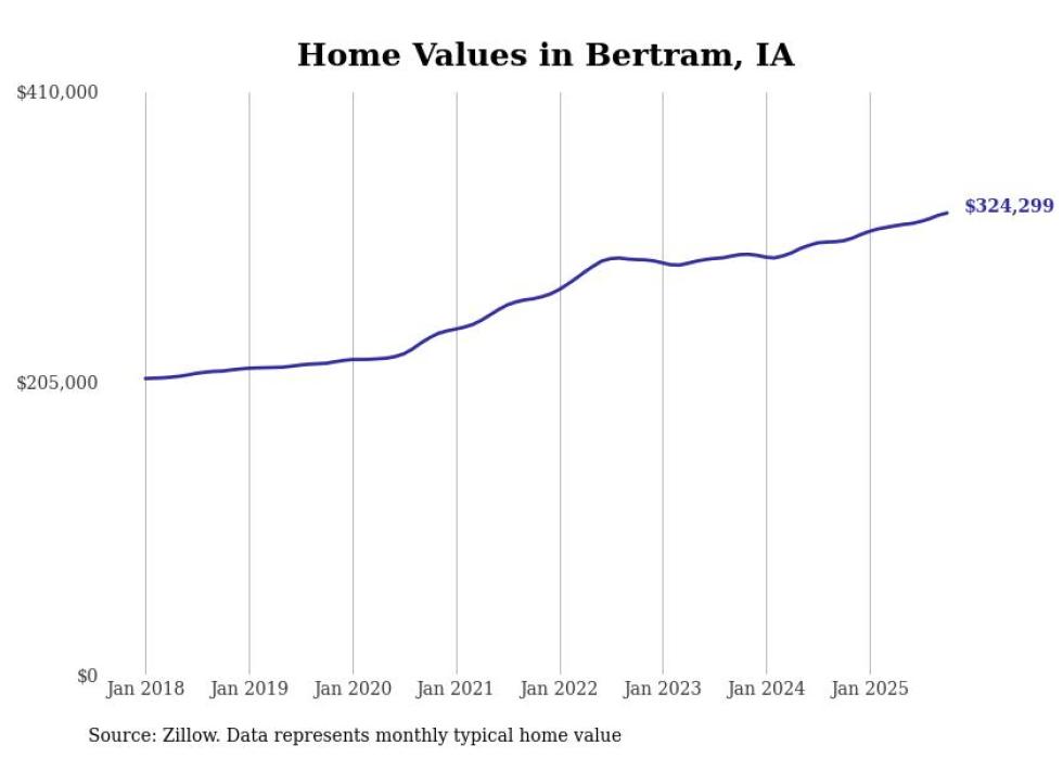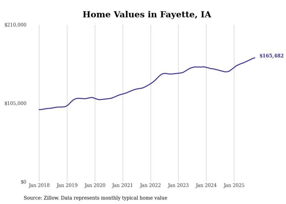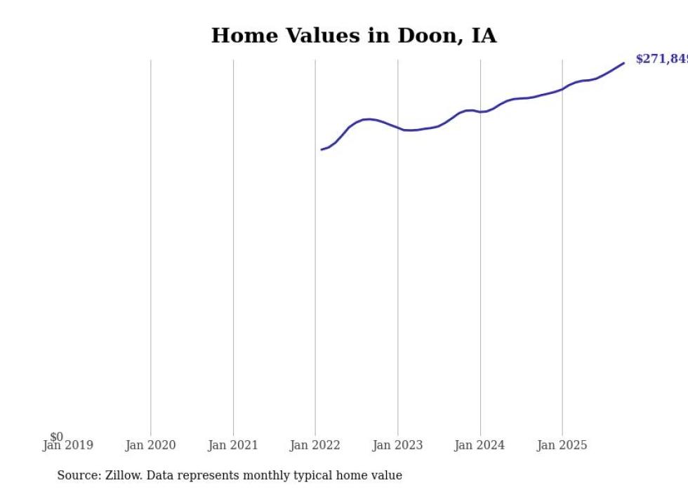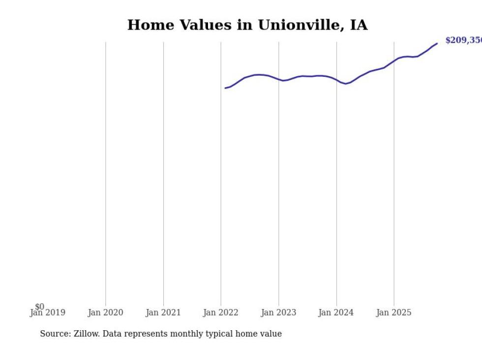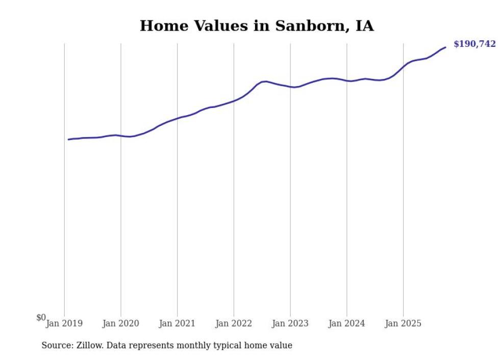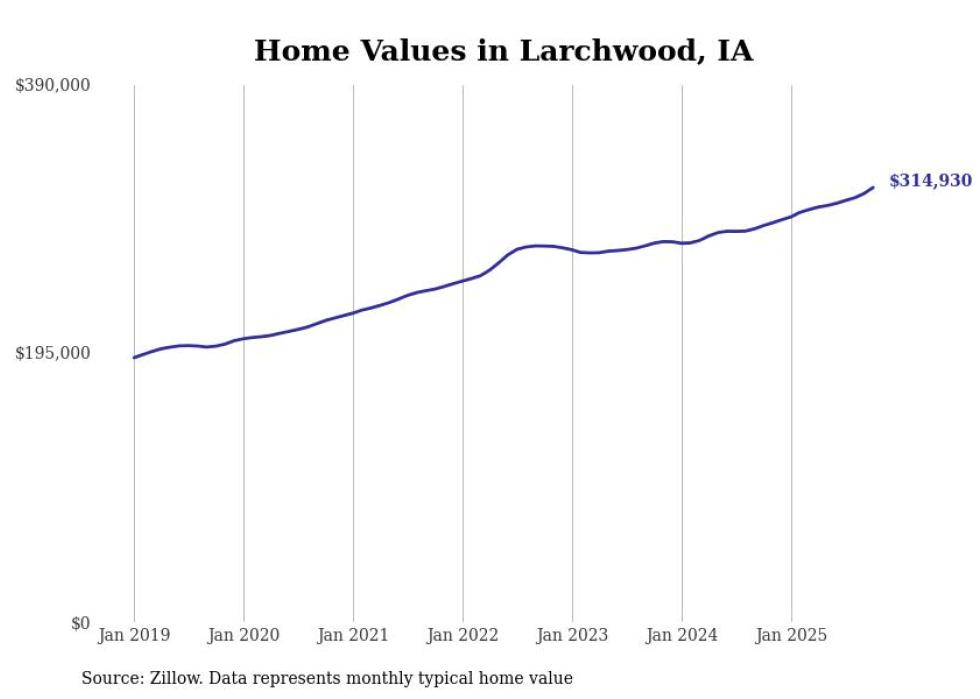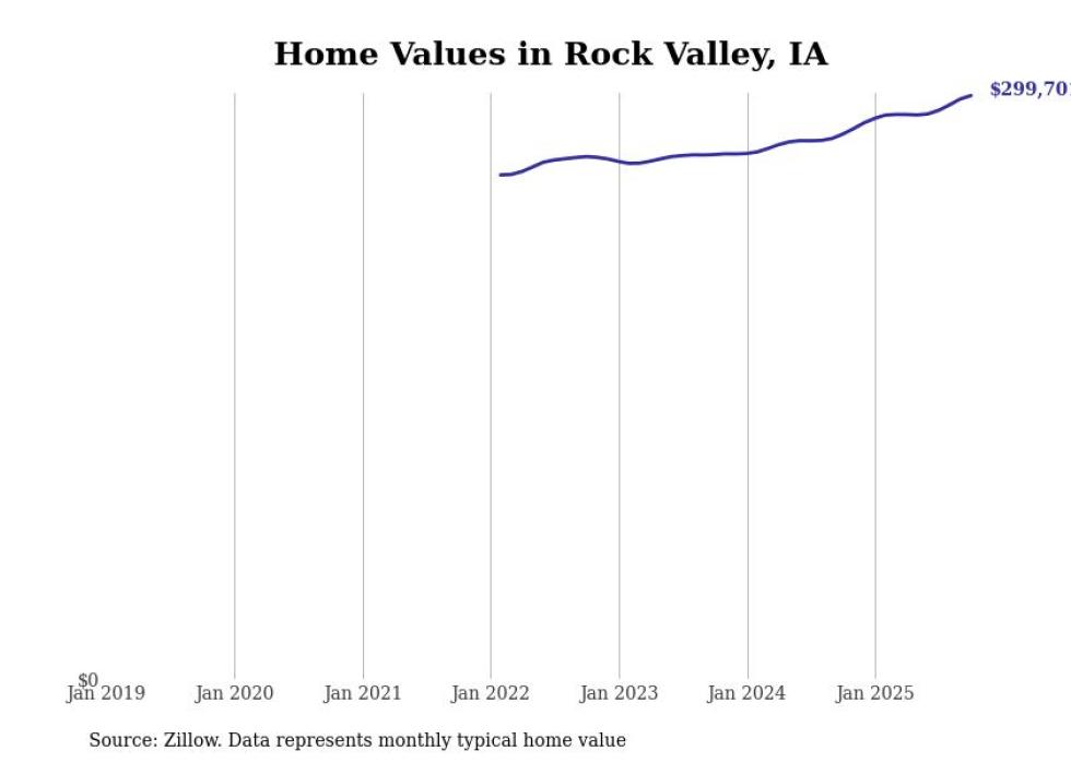 Stacker compiled a list of cities with the fastest-growing home prices in Iowa using data from Zillow. Cities are ranked by the dollar change in the Zillow Home Values Index for all homes from the 12 months ending October 2025. The charts in this story were created automatically using Matplotlib. Data was available for 50 cities and towns in Iowa.