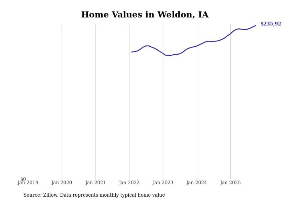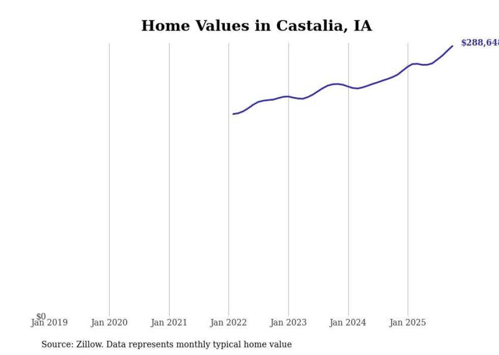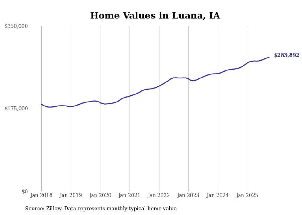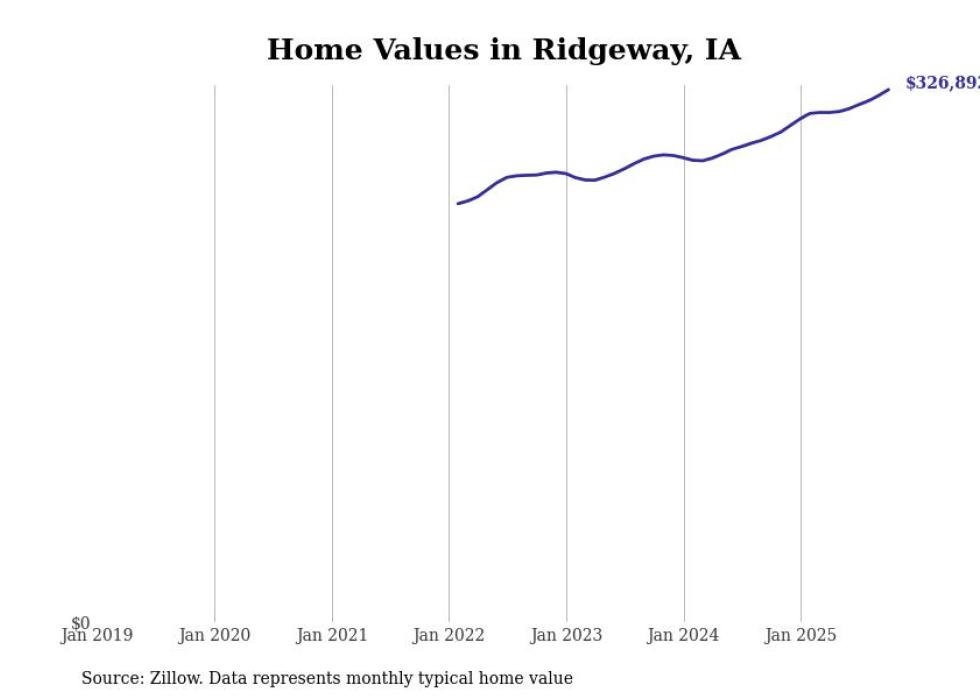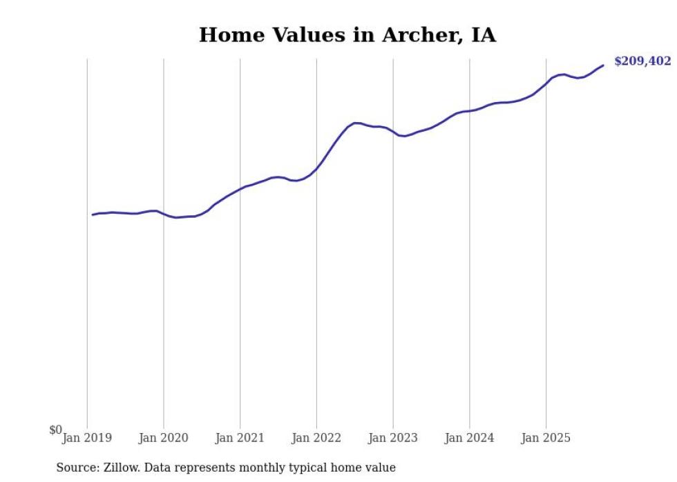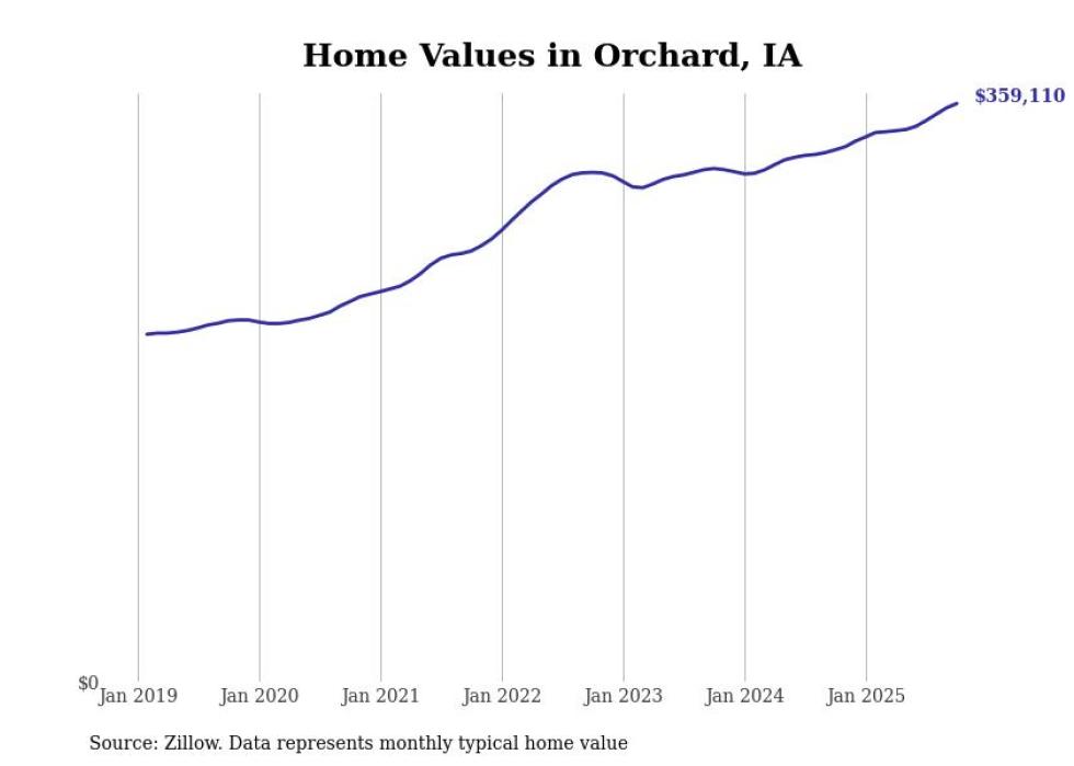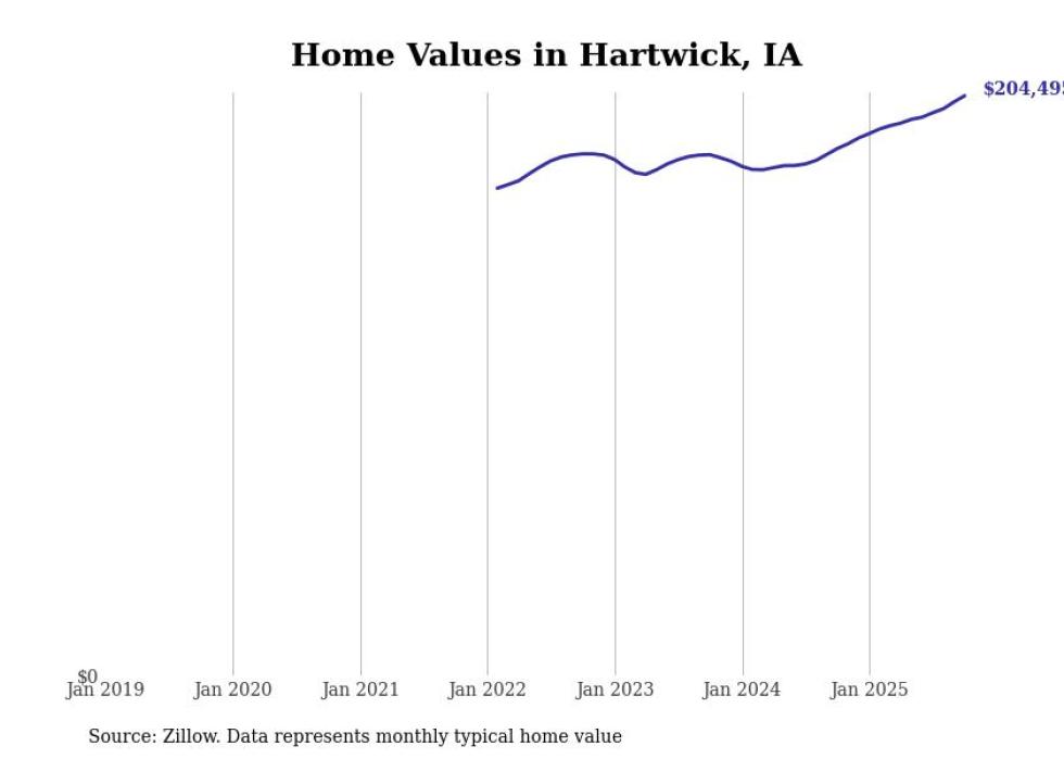 Stacker compiled a list of cities with the fastest-growing home prices in Iowa using data from Zillow. Cities are ranked by the dollar change in the Zillow Home Values Index for all homes from the 12 months ending October 2025. The charts in this story were created automatically using Matplotlib. Data was available for 50 cities and towns in Iowa.