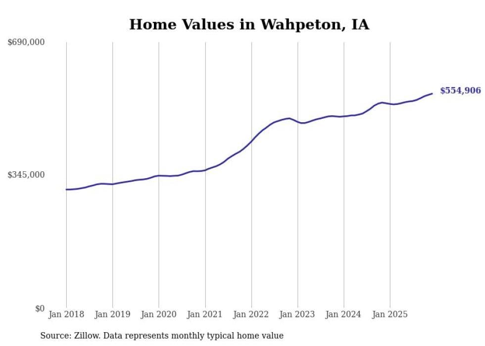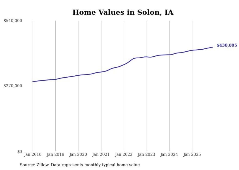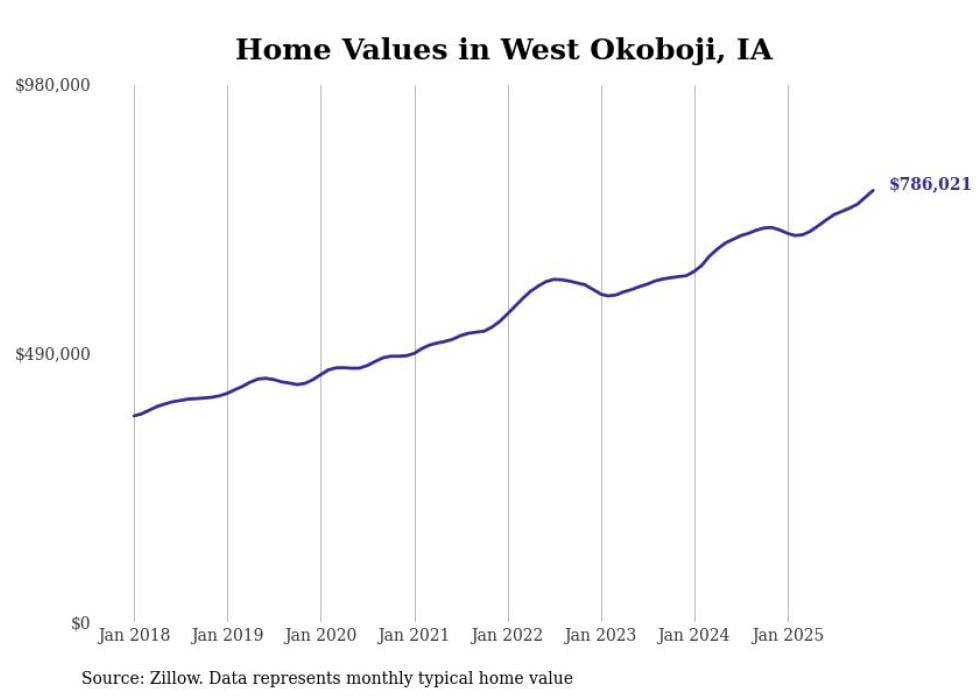 Stacker compiled a list of cities with the most expensive homes in Iowa using data from Zillow. Cities are ranked by the Zillow Home Values Index for all homes as of December 2025. The charts in this story were created automatically using Matplotlib.