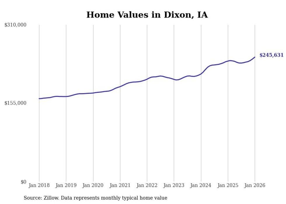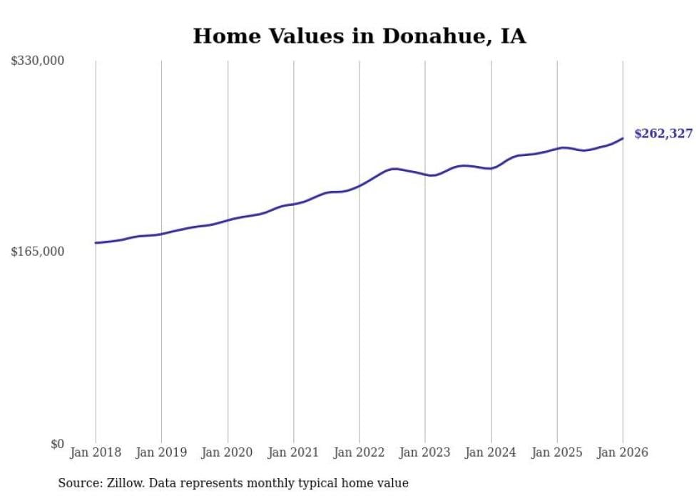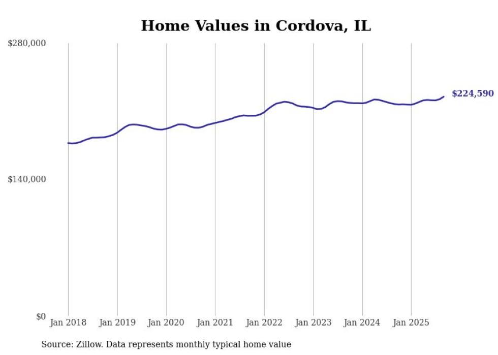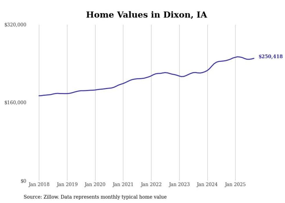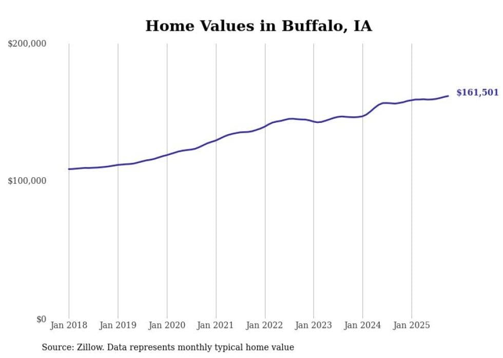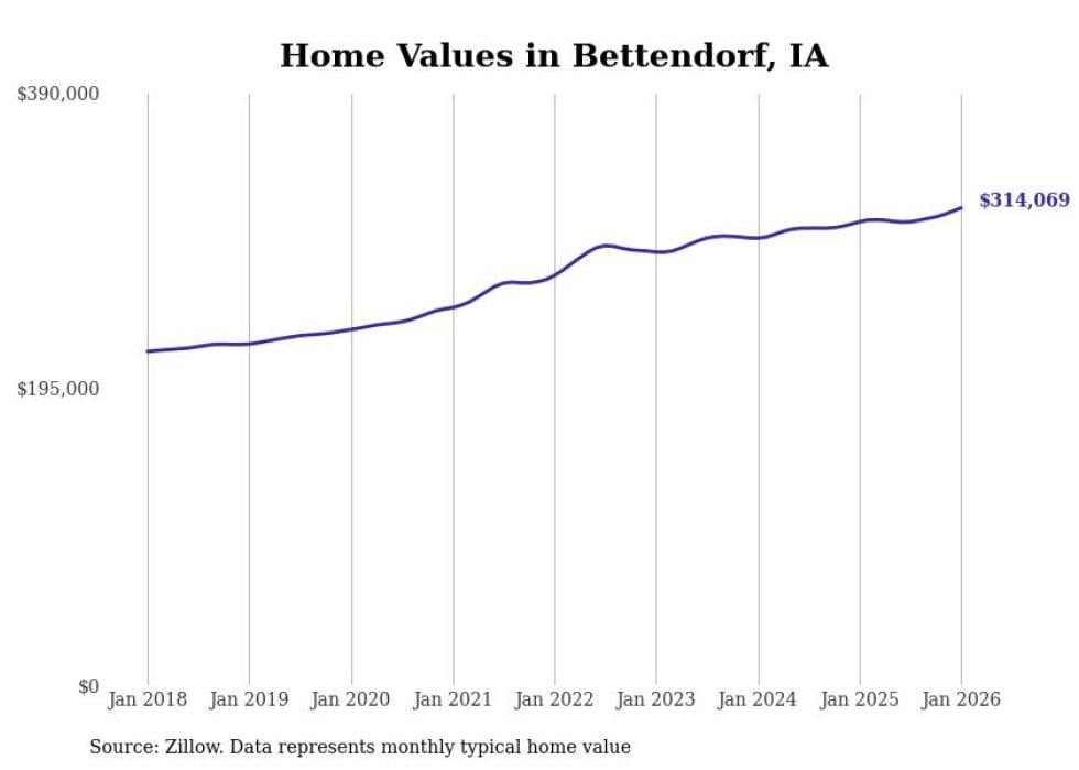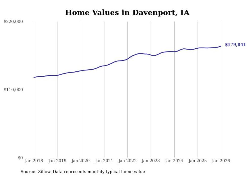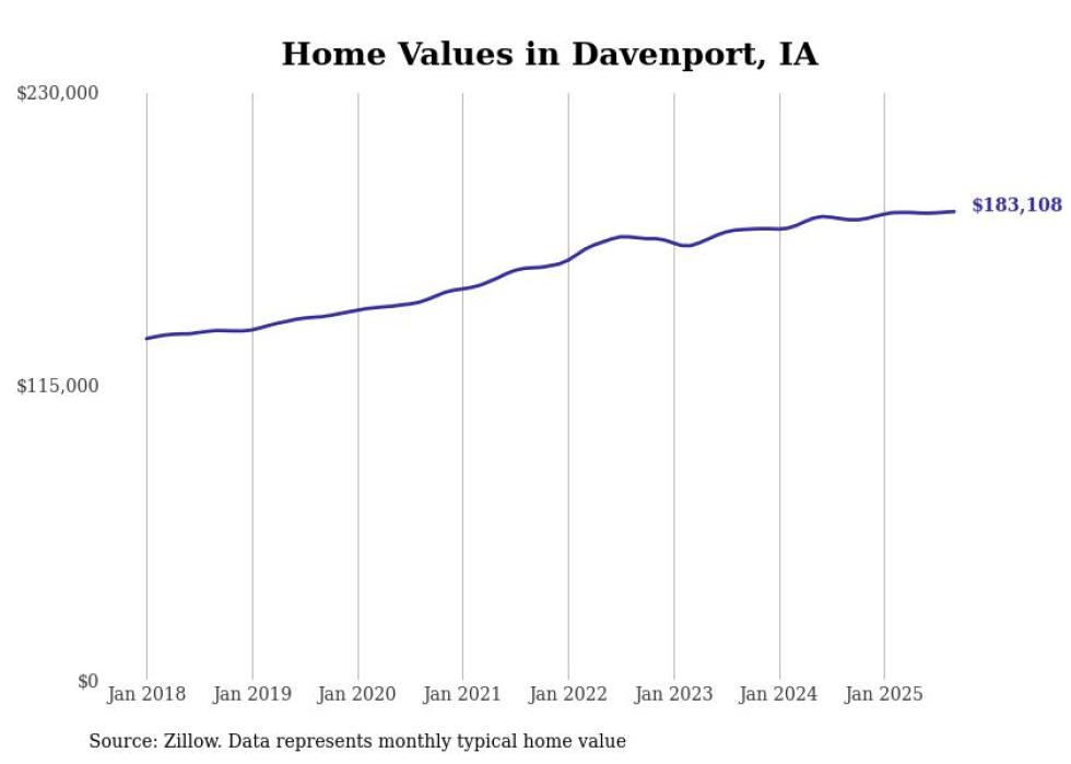 Stacker compiled a list of cities with the most expensive homes in the Davenport metro area using data from Zillow. Charts show the monthly typical home value since January 2018. Data was available for 47 cities and towns.