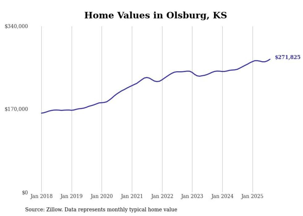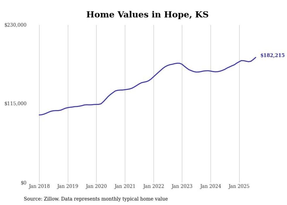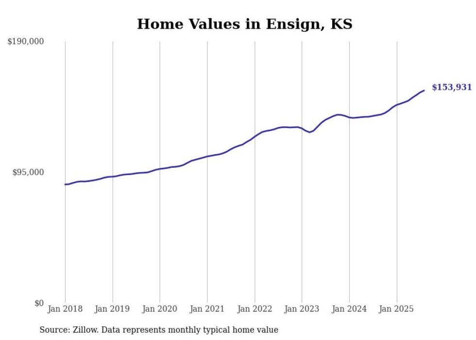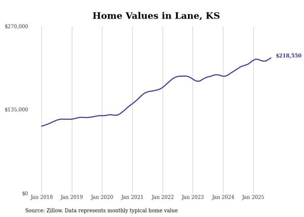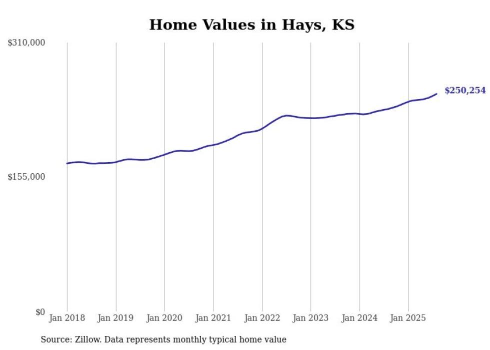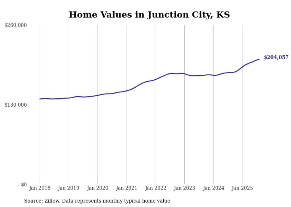 Stacker compiled a list of cities with the fastest-growing home prices in Kansas using data from Zillow. Cities are ranked by the dollar change in the Zillow Home Values Index for all homes from the 12 months ending August 2025. The charts in this story were created automatically using Matplotlib. Data was available for 50 cities and towns in Kansas.