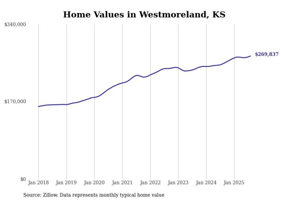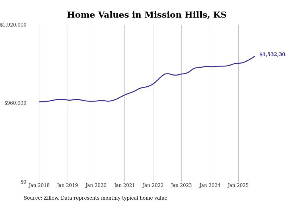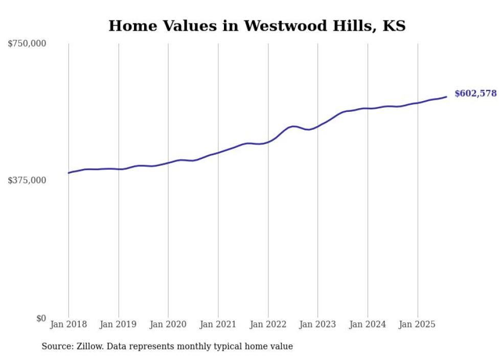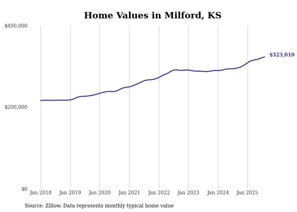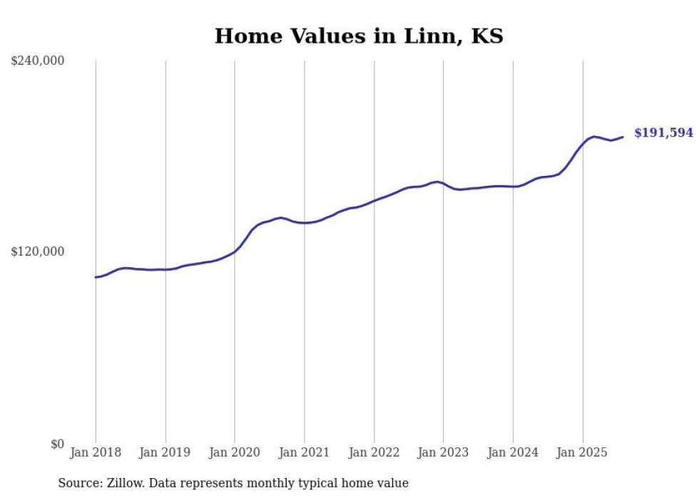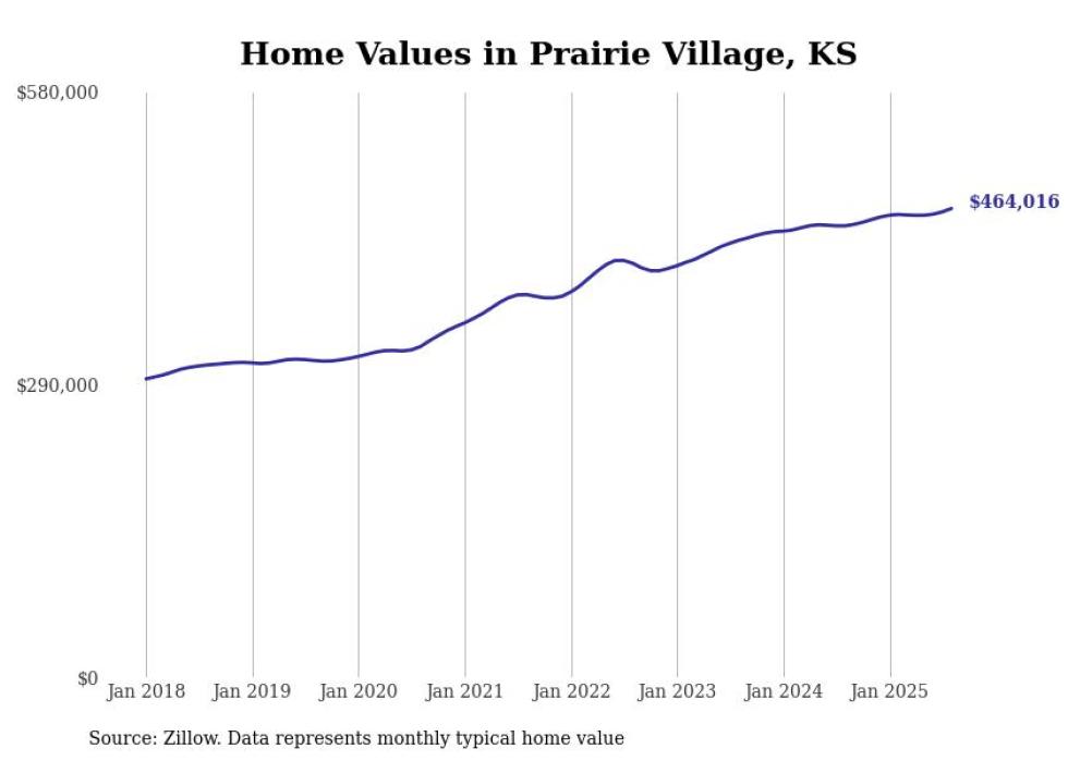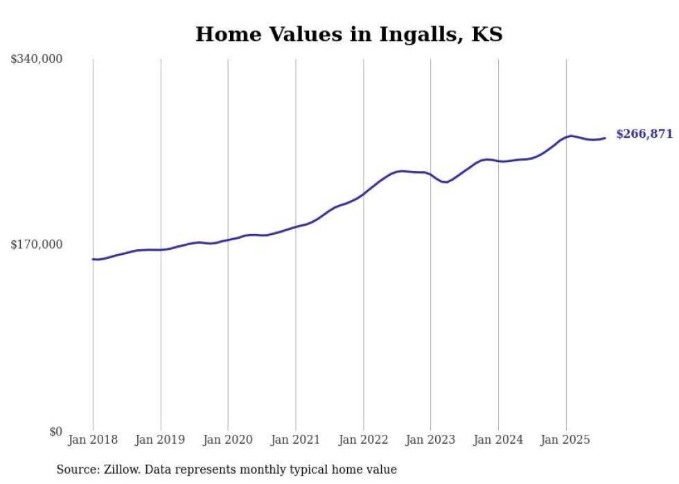 Stacker compiled a list of cities with the fastest-growing home prices in Kansas using data from Zillow. Cities are ranked by the dollar change in the Zillow Home Values Index for all homes from the 12 months ending August 2025. The charts in this story were created automatically using Matplotlib. Data was available for 50 cities and towns in Kansas.