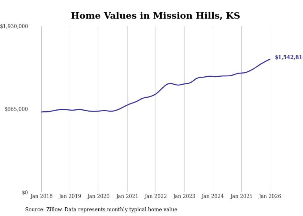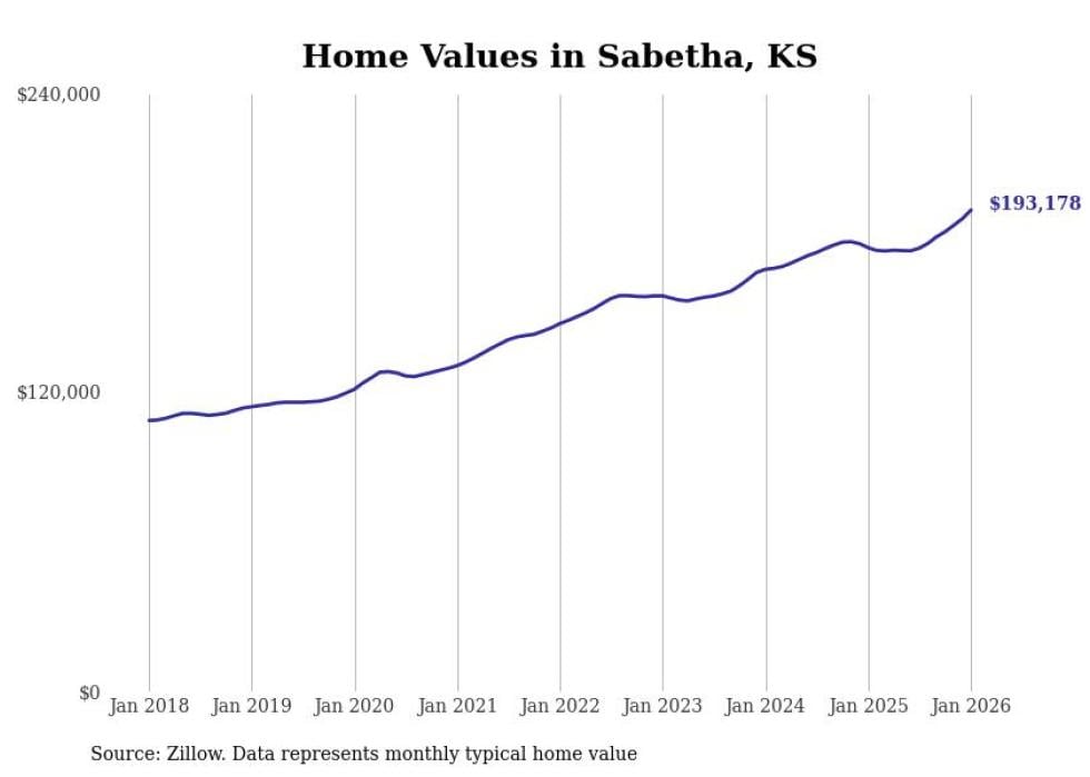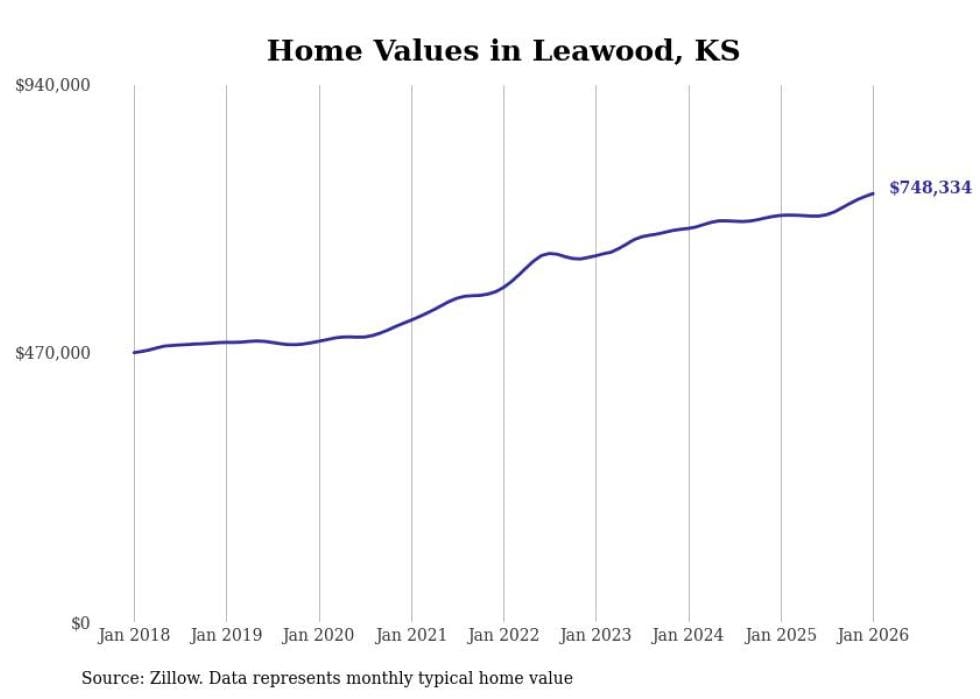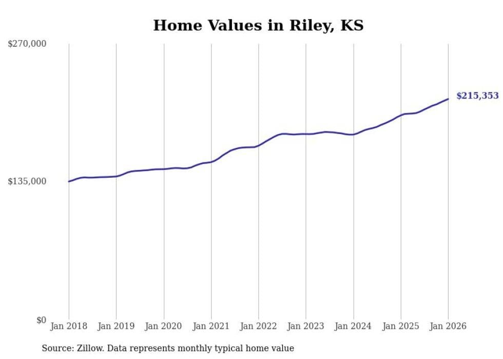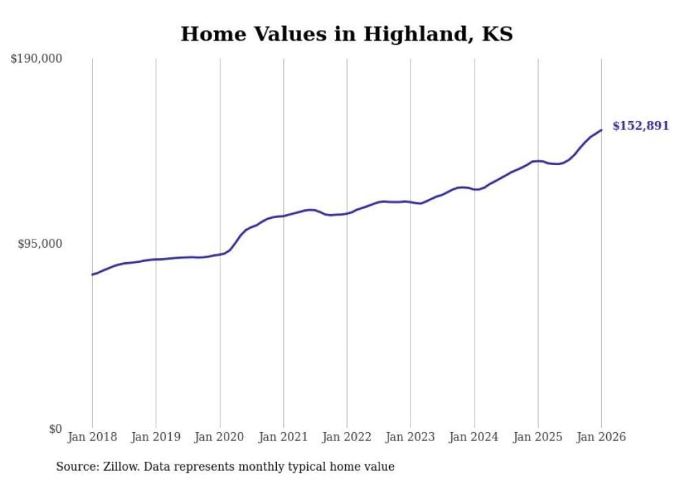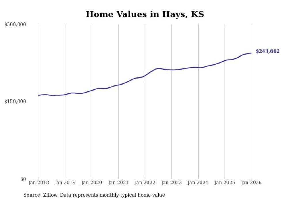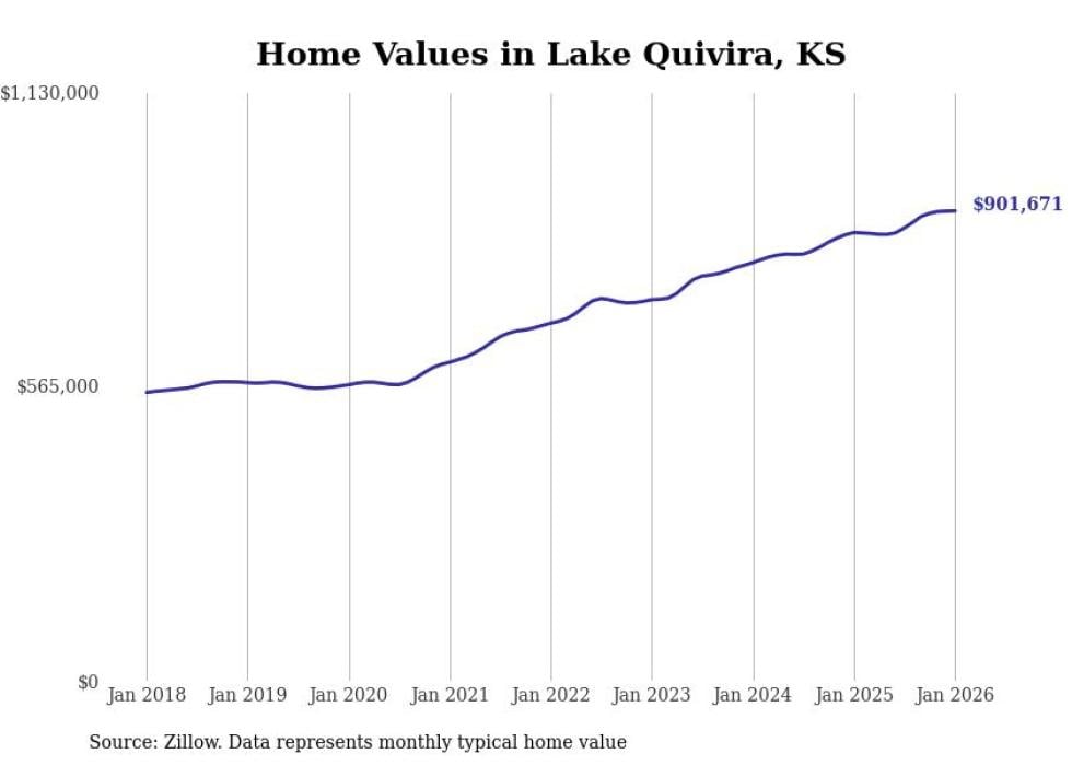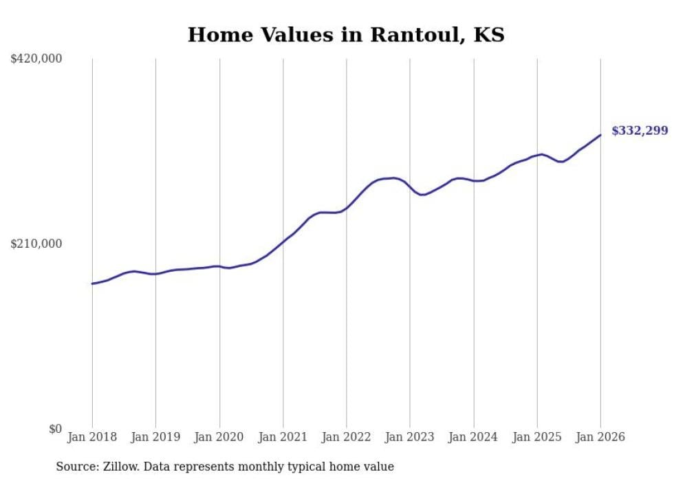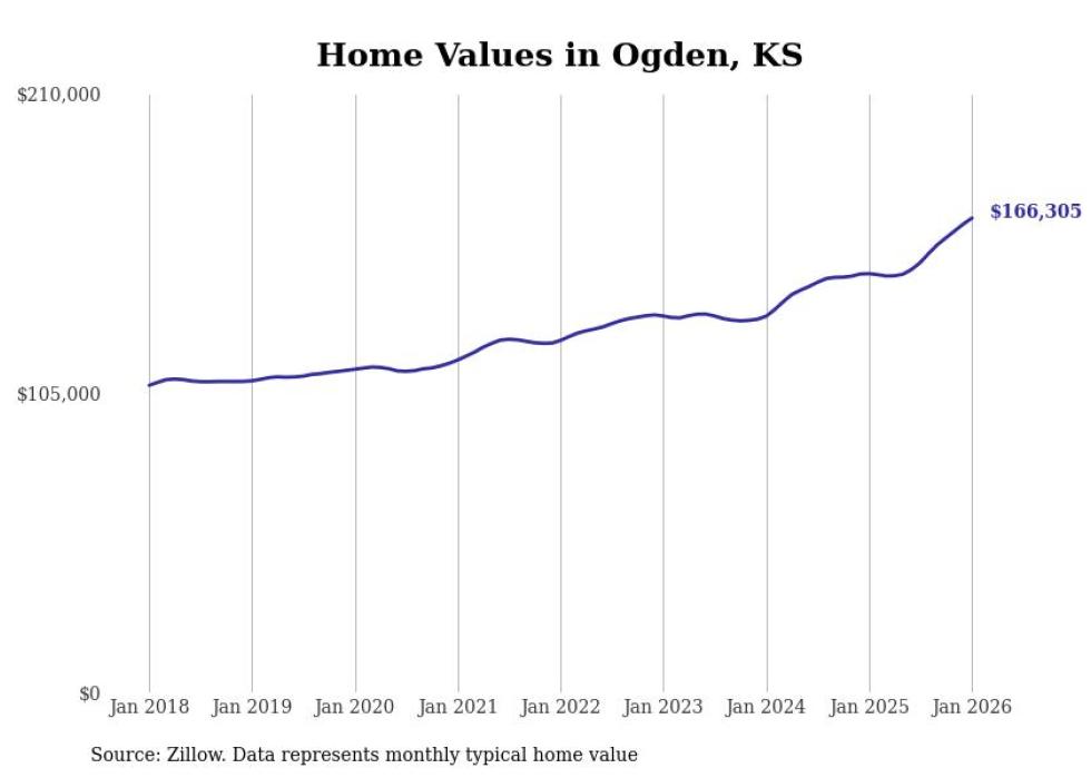 Stacker compiled a list of cities with the fastest-growing home prices in Kansas using data from Zillow. Cities are ranked by the dollar change in the Zillow Home Values Index for all homes from the 12 months ending January 2026. The charts in this story were created automatically using Matplotlib. Data was available for 50 cities and towns in Kansas.