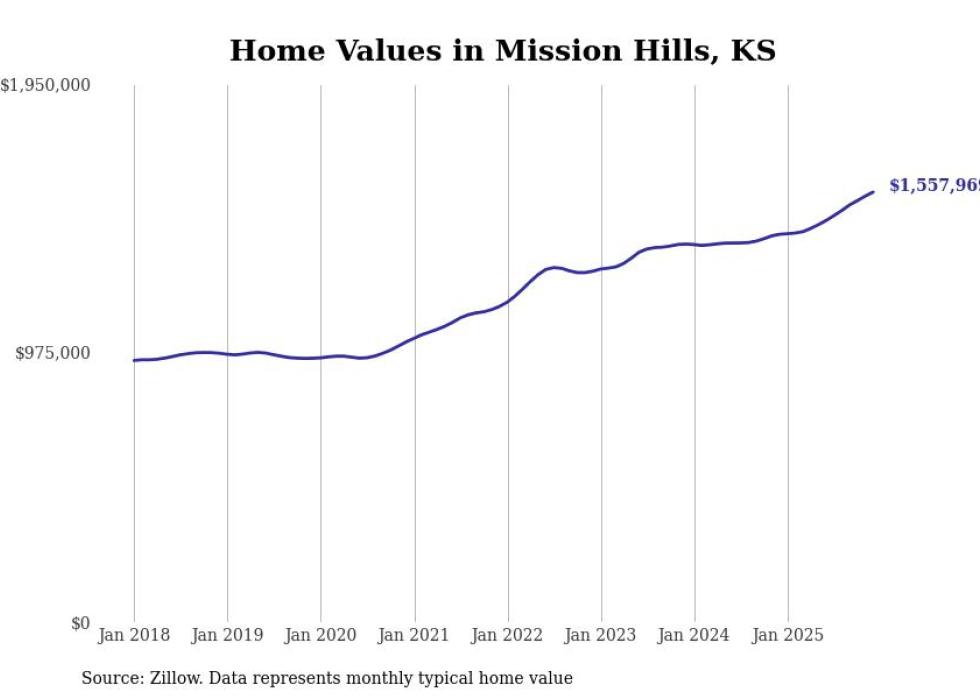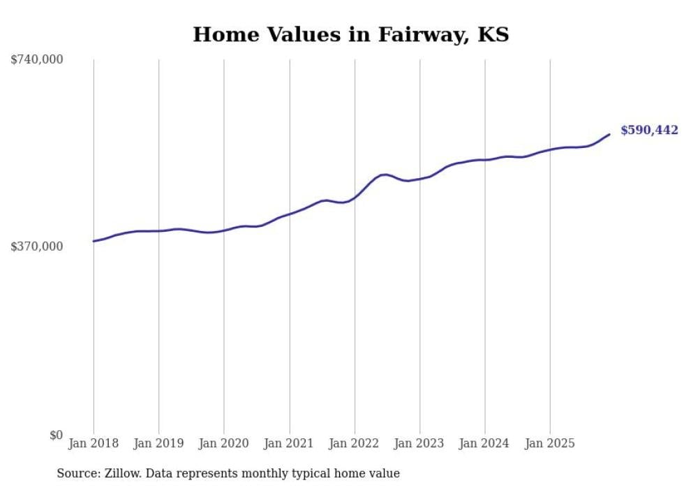 Stacker compiled a list of cities with the most expensive homes in Kansas using data from Zillow. Cities are ranked by the Zillow Home Values Index for all homes as of December 2025. The charts in this story were created automatically using Matplotlib.