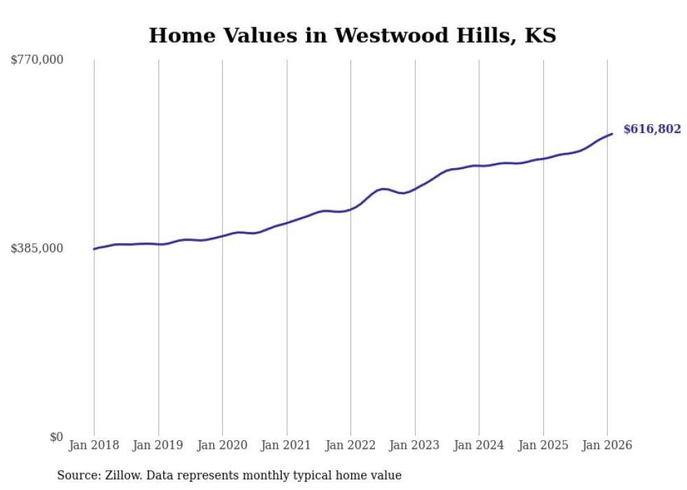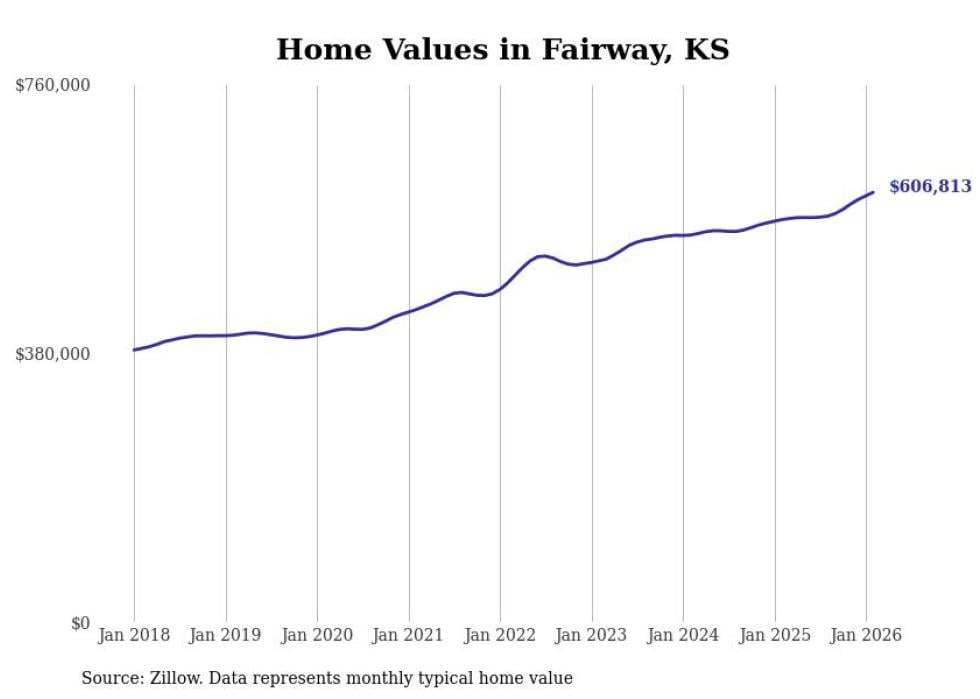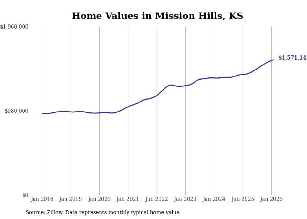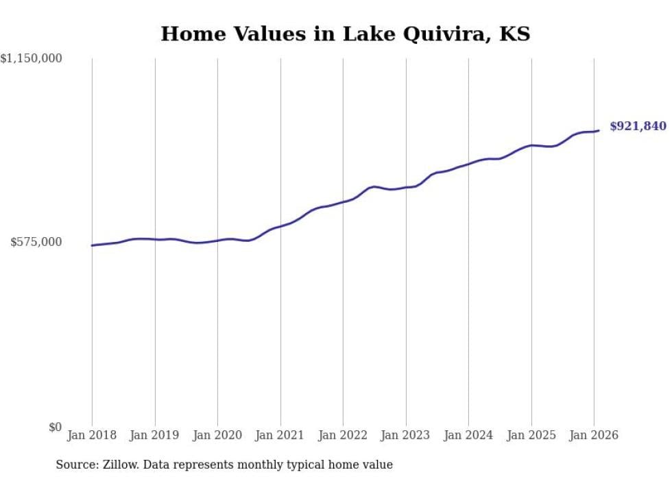 Stacker compiled a list of cities with the most expensive homes in Kansas using data from Zillow. Cities are ranked by the Zillow Home Values Index for all homes as of February 2026. The charts in this story were created automatically using Matplotlib.