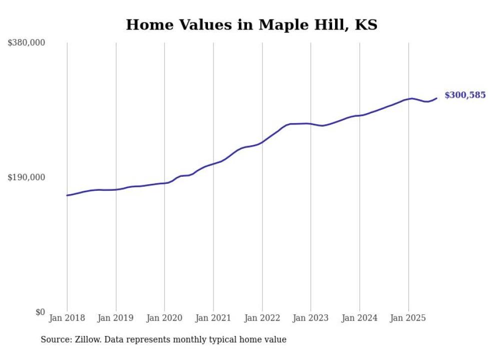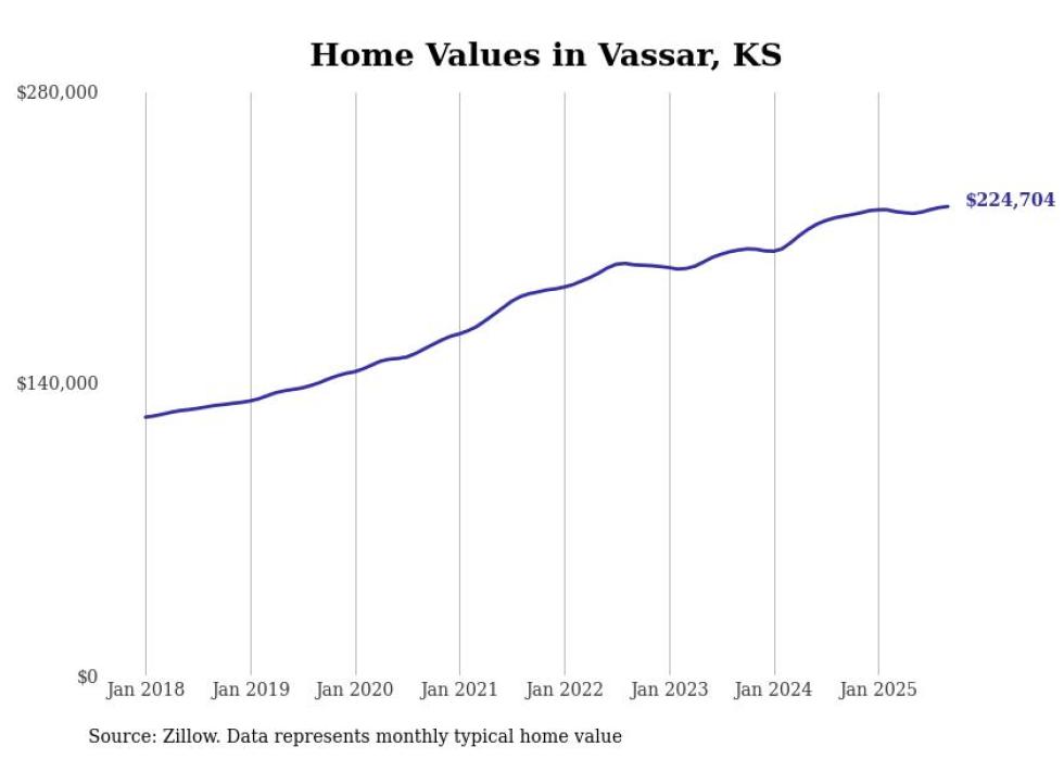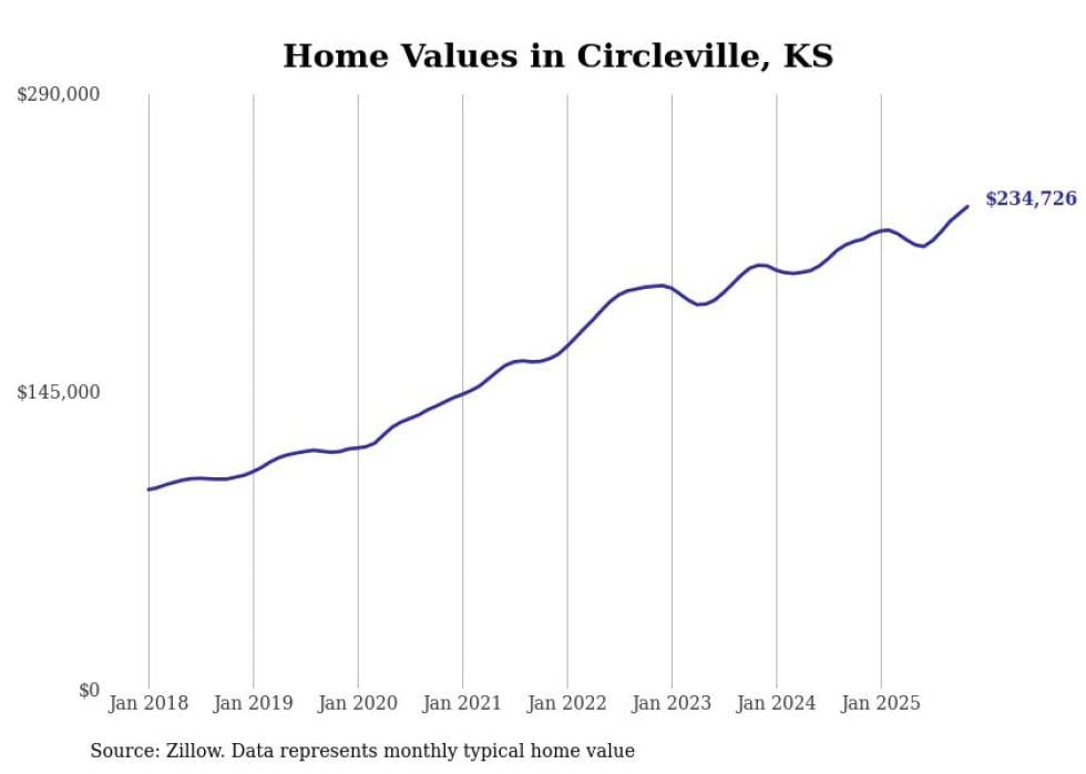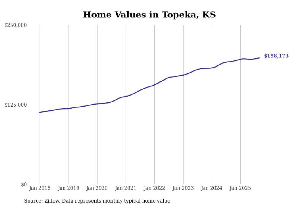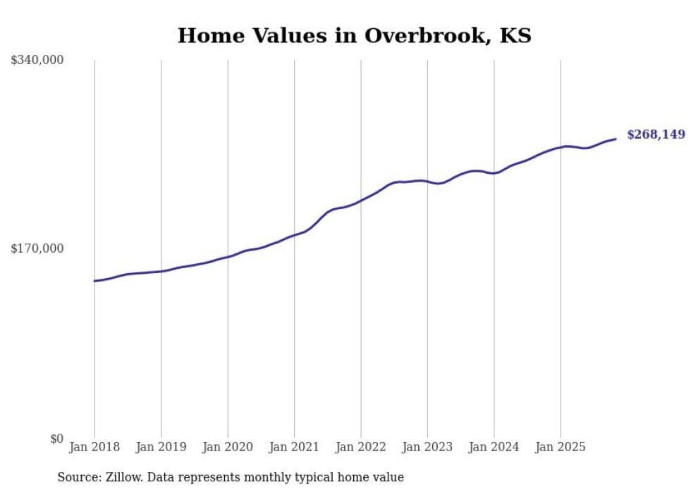 Stacker compiled a list of cities with the most expensive homes in the Topeka, KS metro area using data from Zillow. Charts show the monthly typical home value since January 2018.