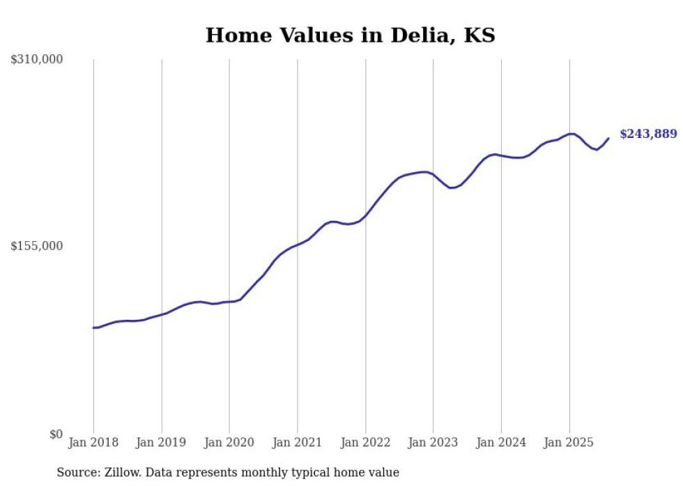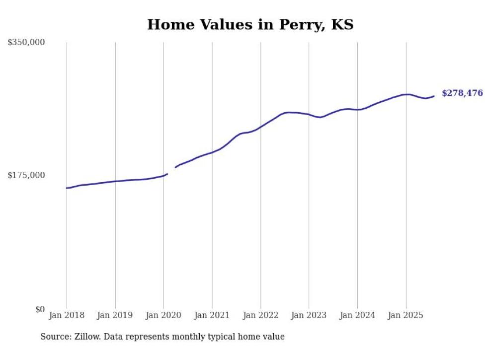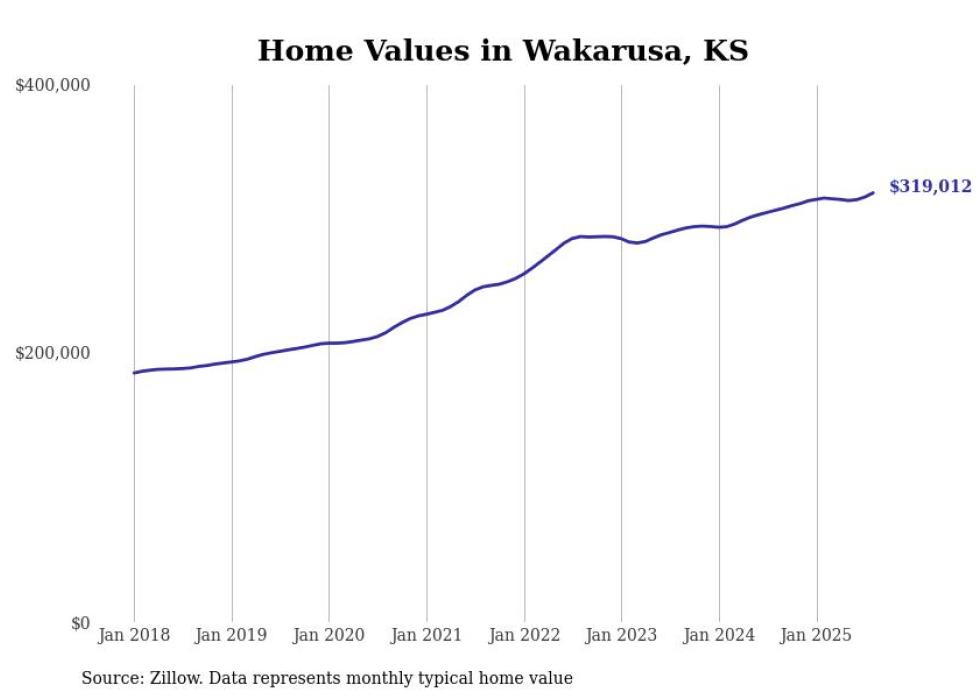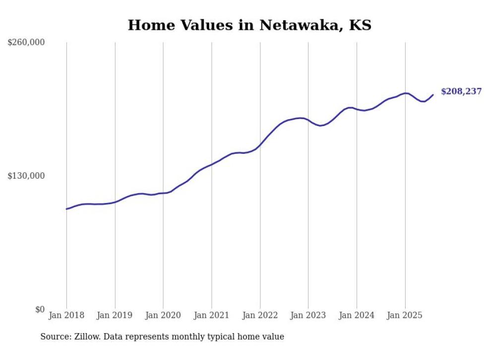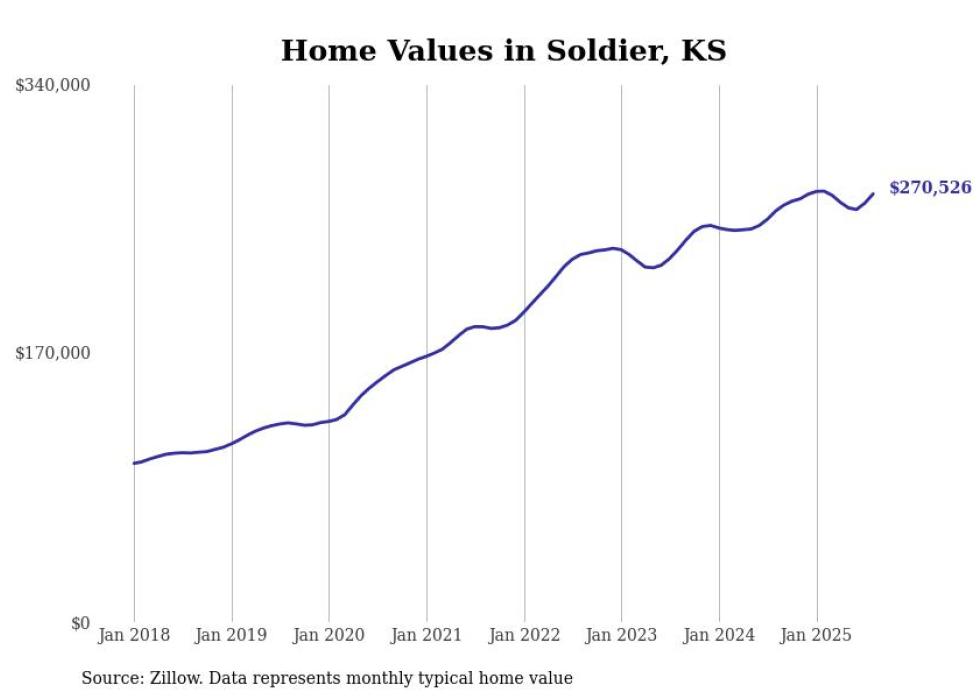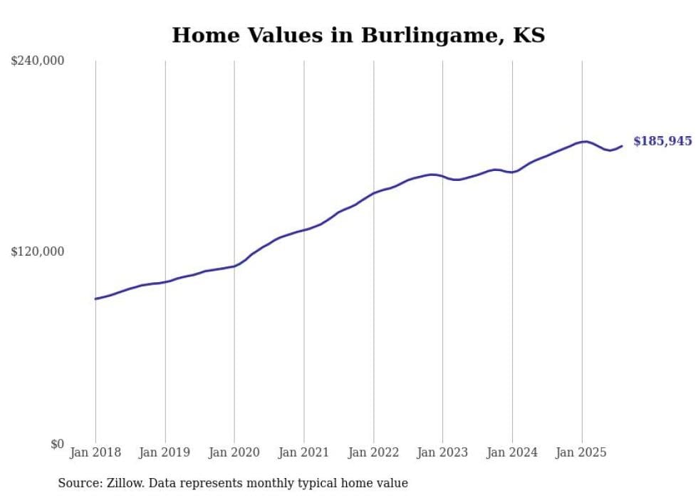 Stacker compiled a list of cities with the most expensive homes in the Topeka, KS metro area using data from Zillow. Charts show the monthly typical home value since January 2018.