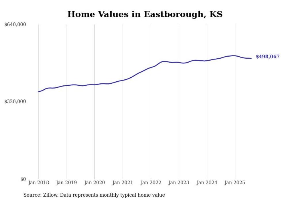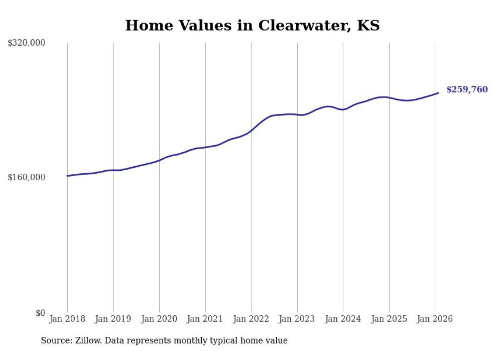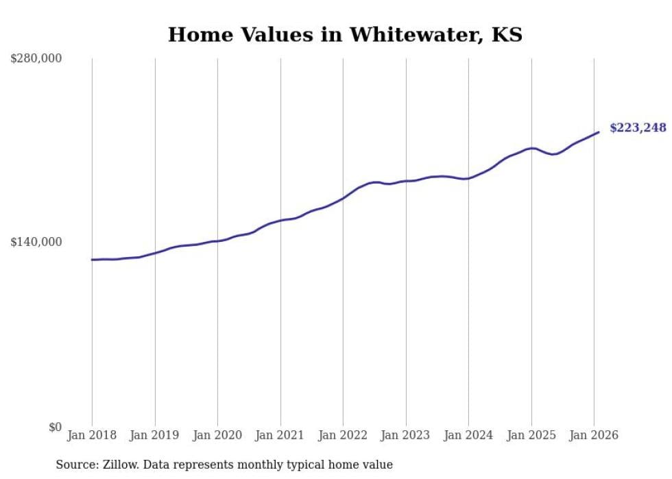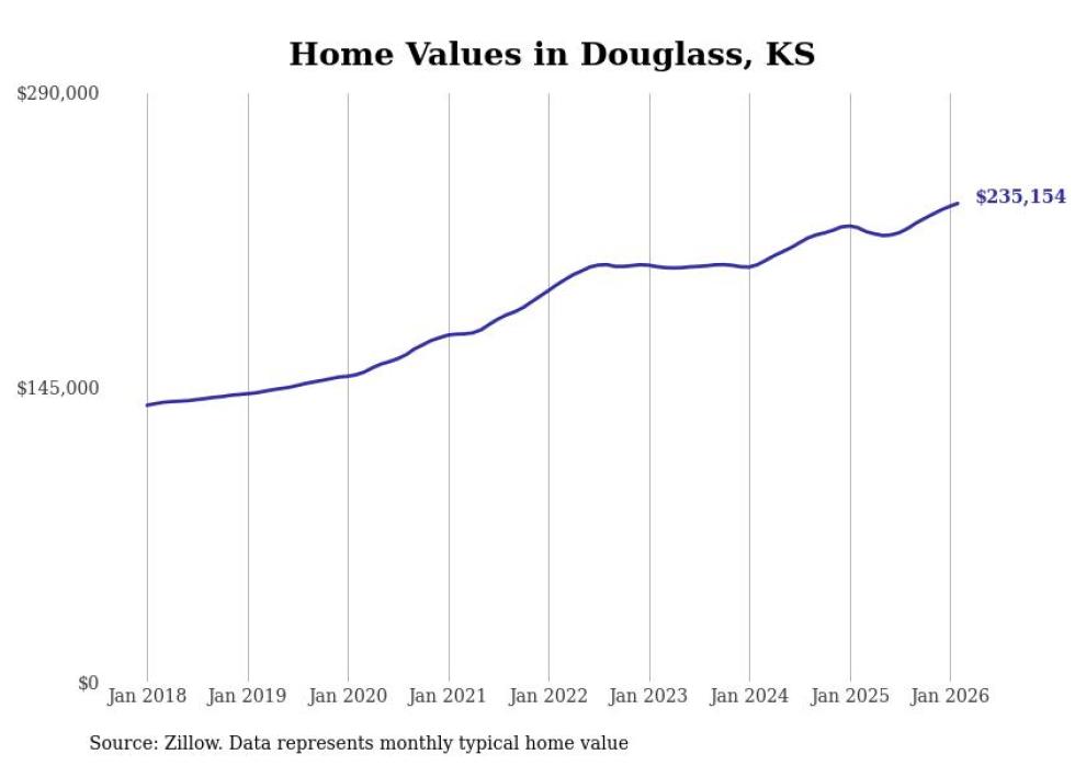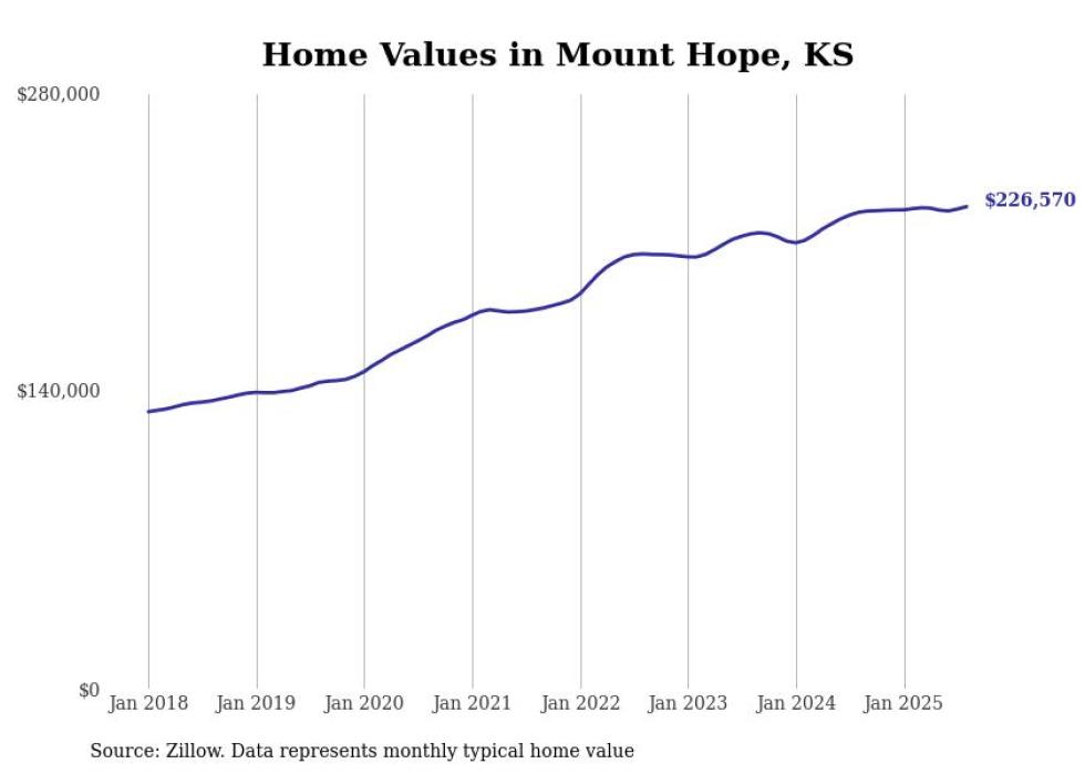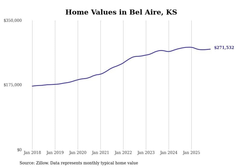 Stacker compiled a list of cities with the most expensive homes in the Wichita metro area using data from Zillow. Charts show the monthly typical home value since January 2018. Data was available for 47 cities and towns.