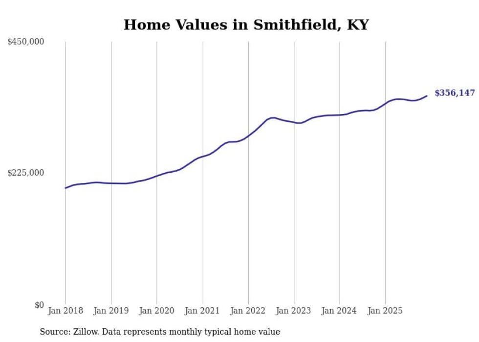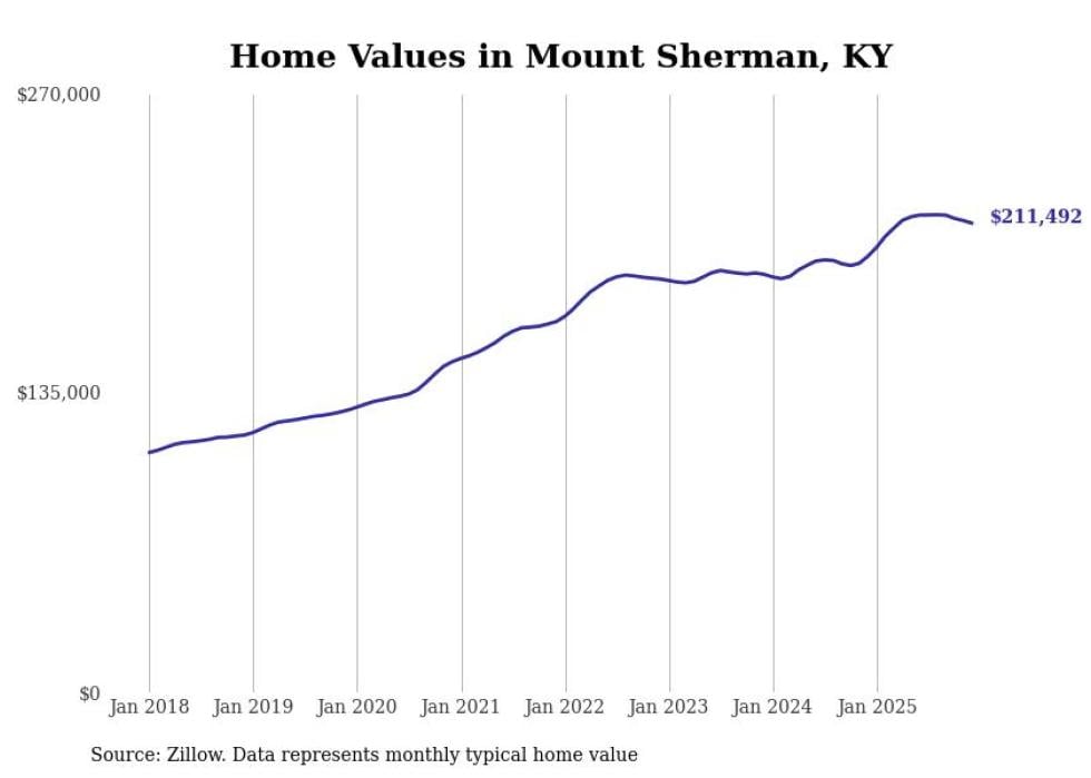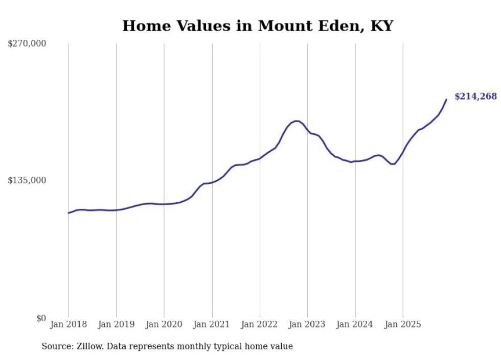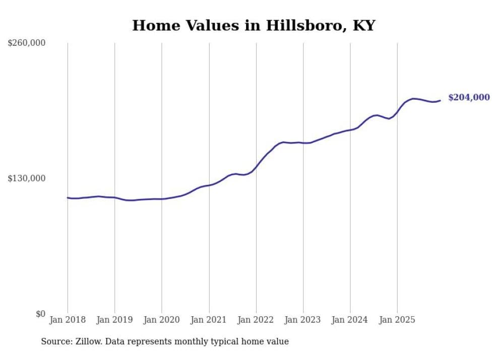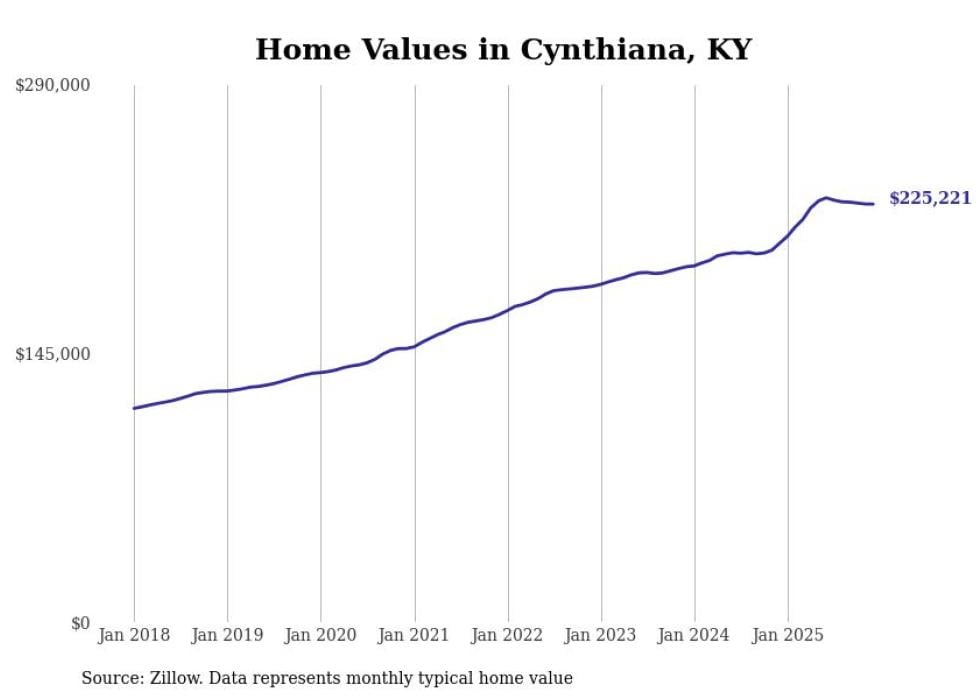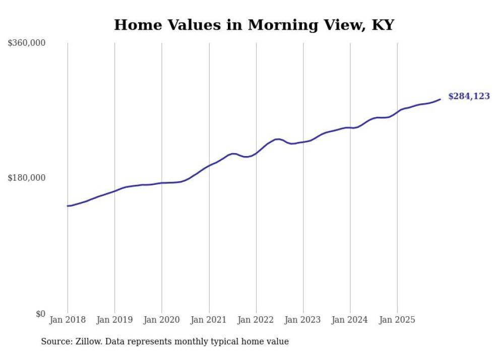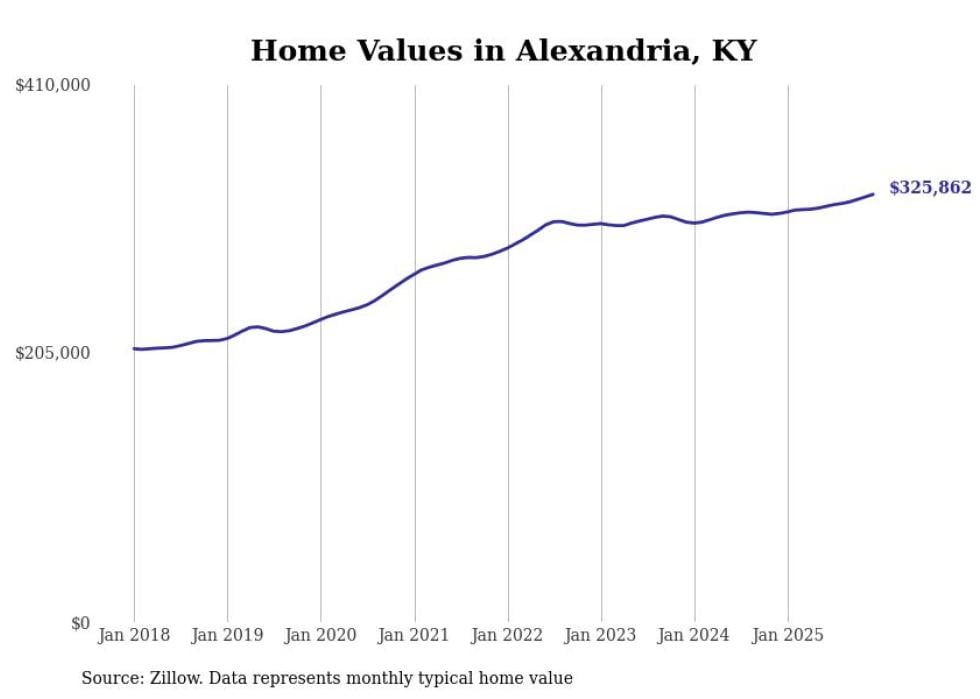 Stacker compiled a list of cities with the fastest-growing home prices in Kentucky using data from Zillow. Cities are ranked by the dollar change in the Zillow Home Values Index for all homes from the 12 months ending December 2025. The charts in this story were created automatically using Matplotlib. Data was available for 50 cities and towns in Kentucky.