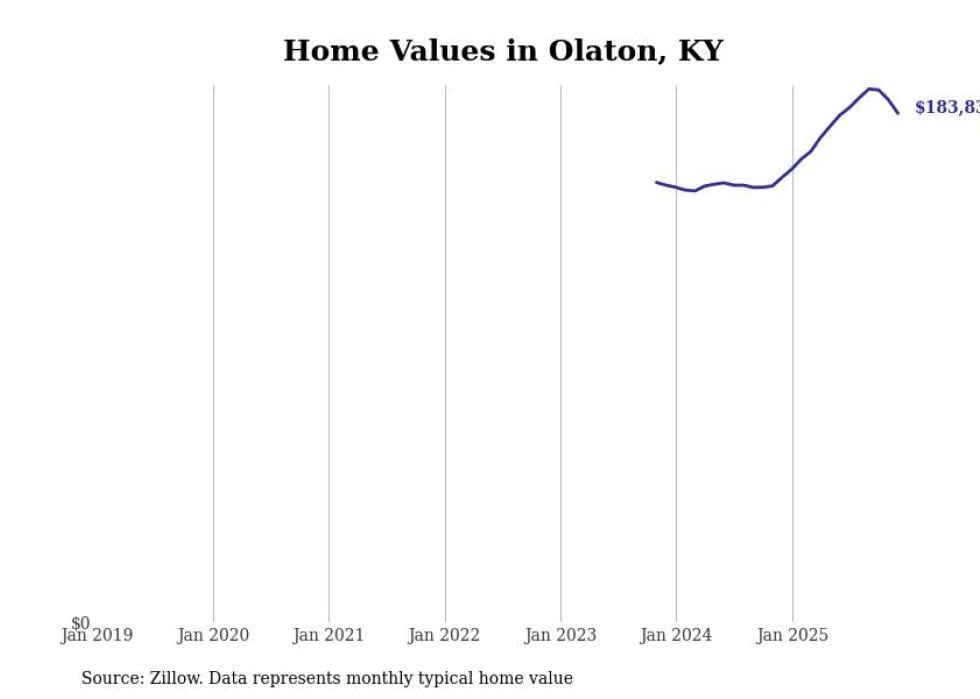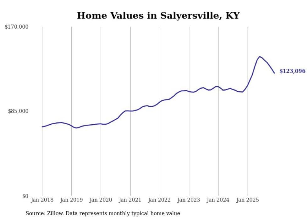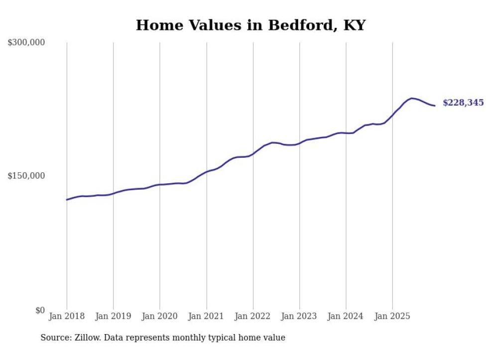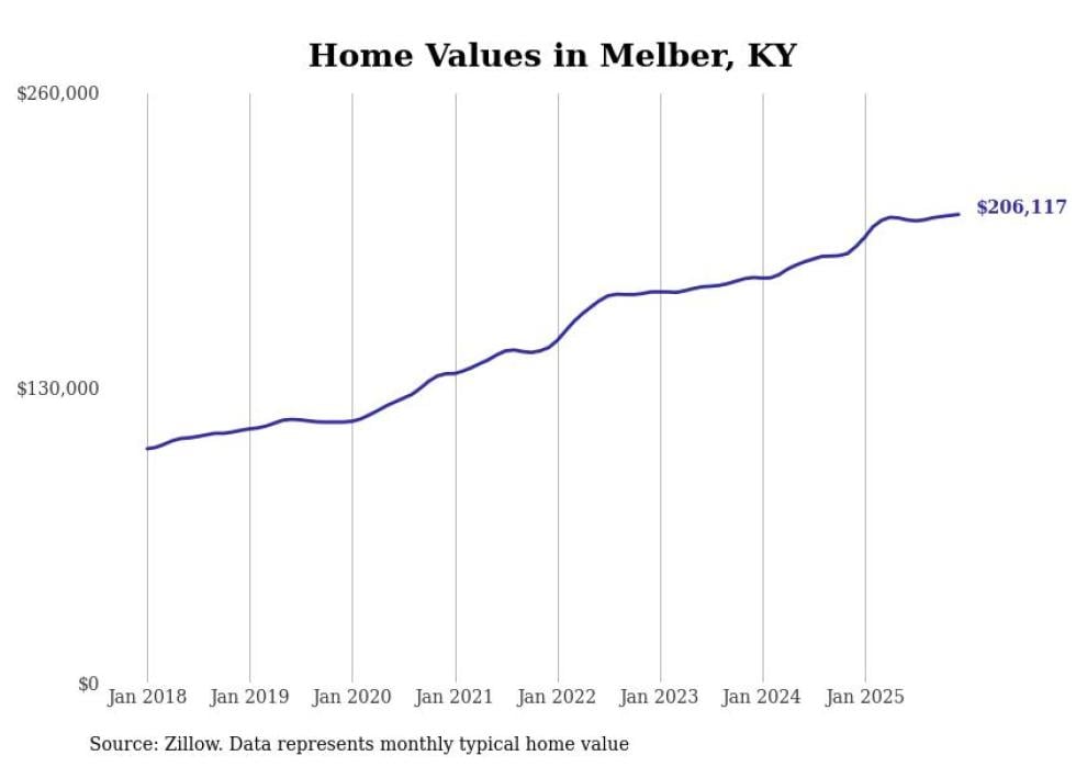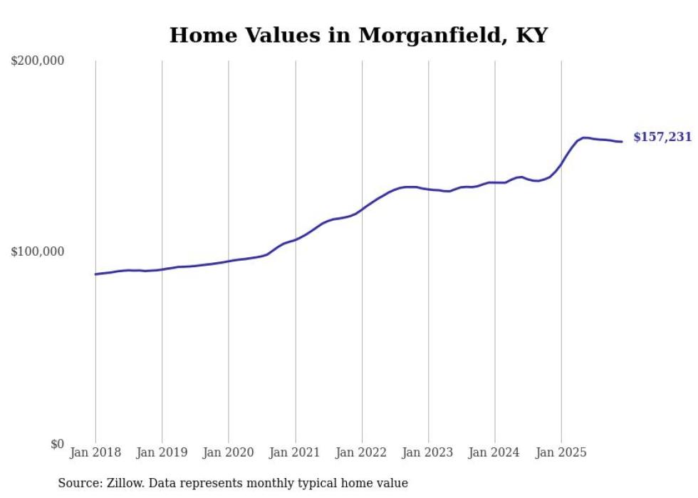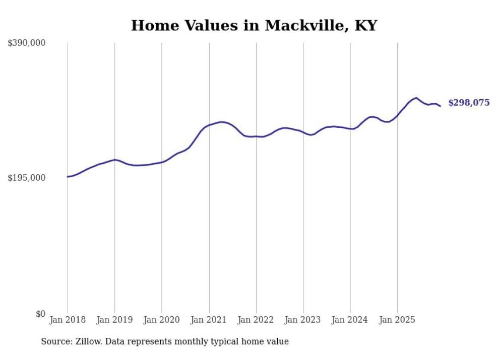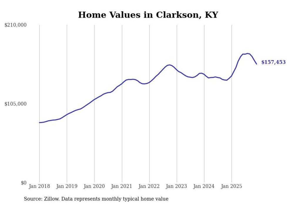 Stacker compiled a list of cities with the fastest-growing home prices in Kentucky using data from Zillow. Cities are ranked by the dollar change in the Zillow Home Values Index for all homes from the 12 months ending December 2025. The charts in this story were created automatically using Matplotlib. Data was available for 50 cities and towns in Kentucky.