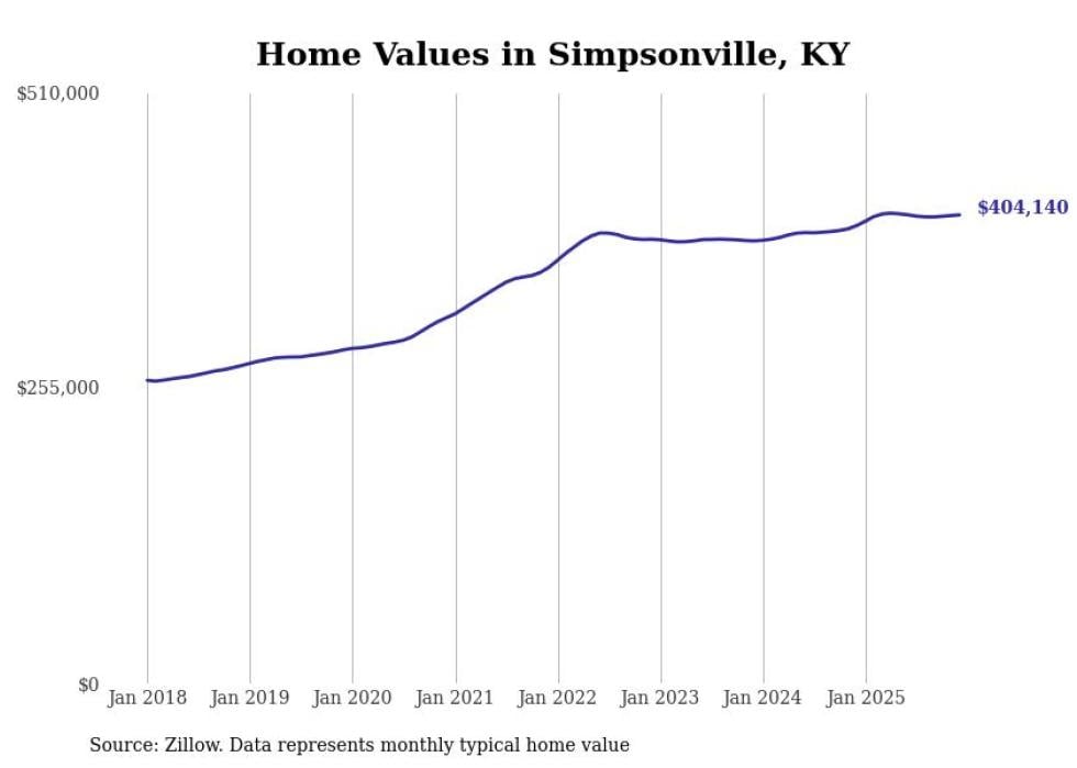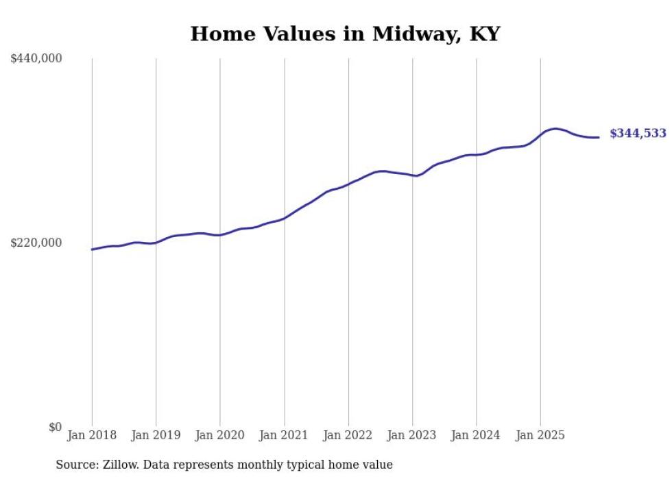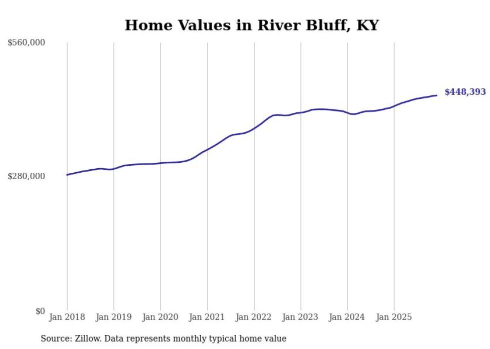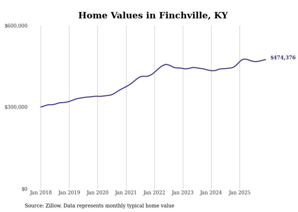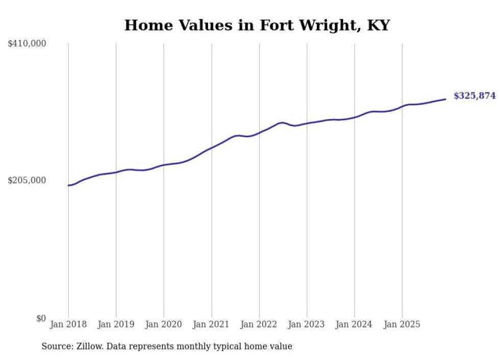 Stacker compiled a list of cities with the most expensive homes in Kentucky using data from Zillow. Cities are ranked by the Zillow Home Values Index for all homes as of December 2025. The charts in this story were created automatically using Matplotlib.