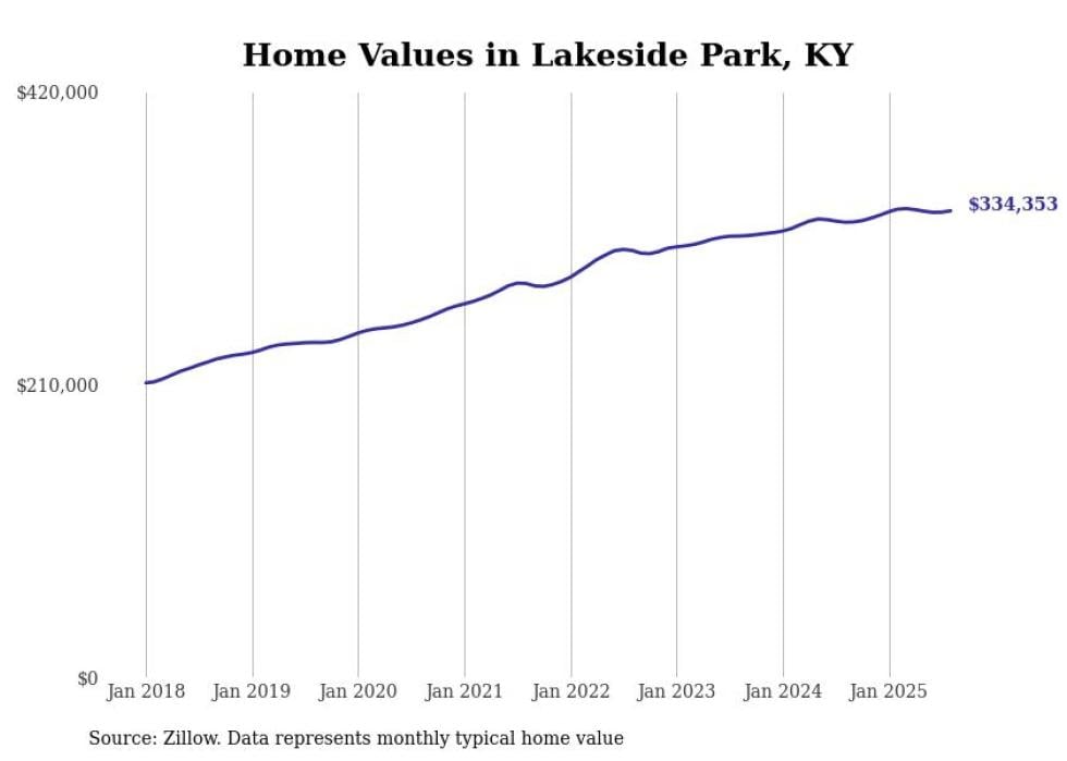 Stacker compiled a list of cities with the most expensive homes in Kentucky using data from Zillow. Cities are ranked by the Zillow Home Values Index for all homes as of August 2025. The charts in this story were created automatically using Matplotlib.