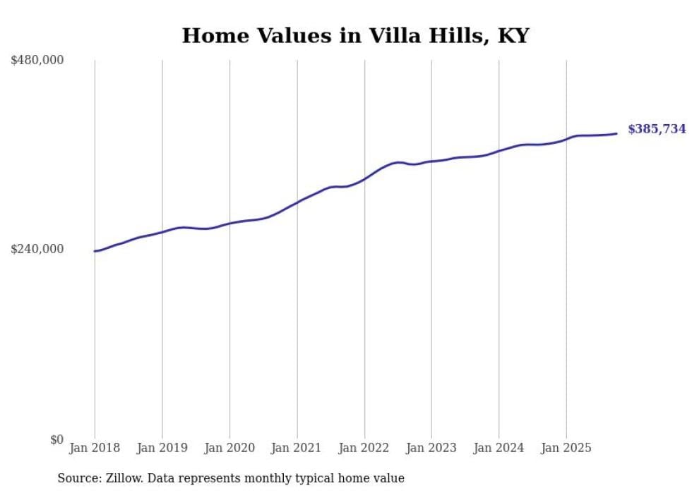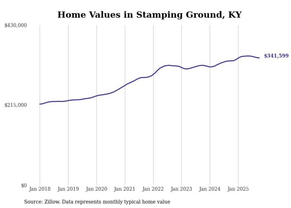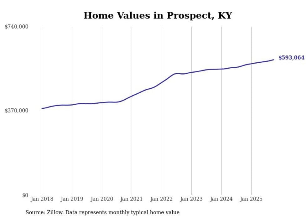 Stacker compiled a list of cities with the most expensive homes in Kentucky using data from Zillow. Cities are ranked by the Zillow Home Values Index for all homes as of October 2025. The charts in this story were created automatically using Matplotlib.