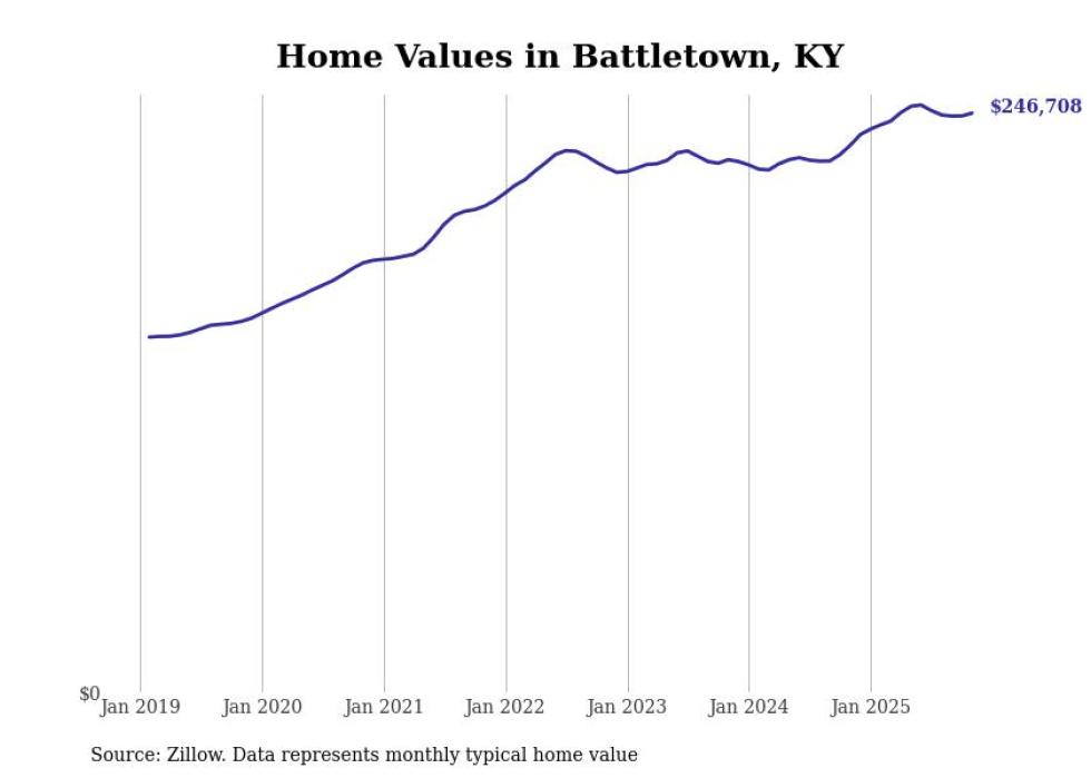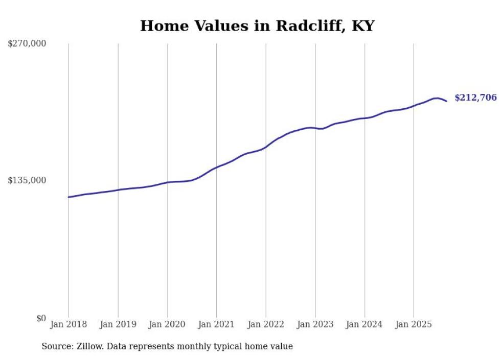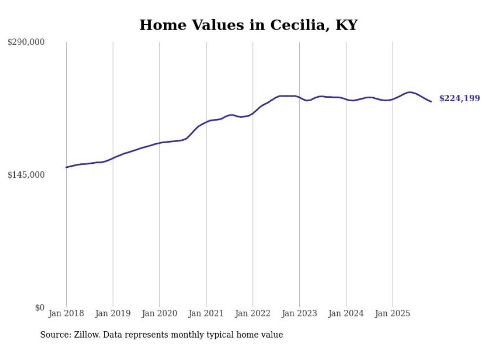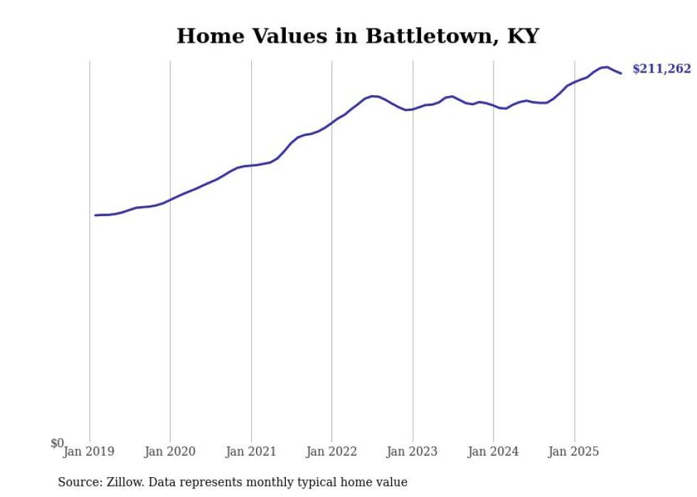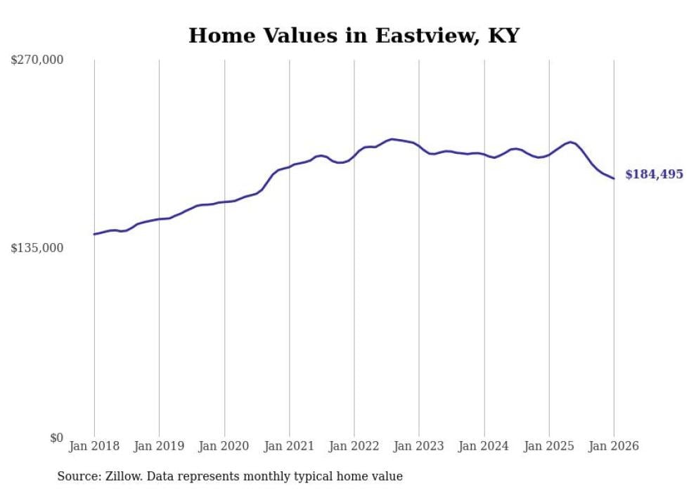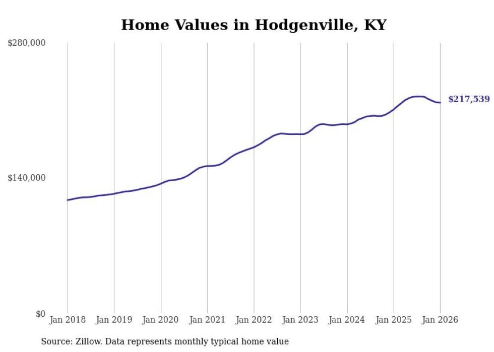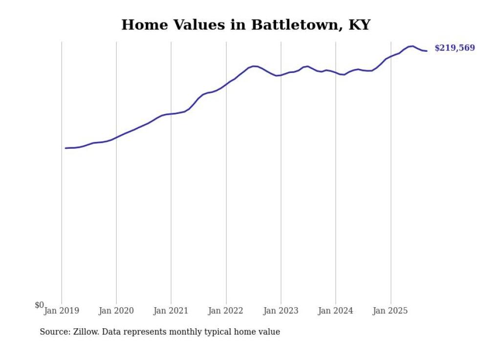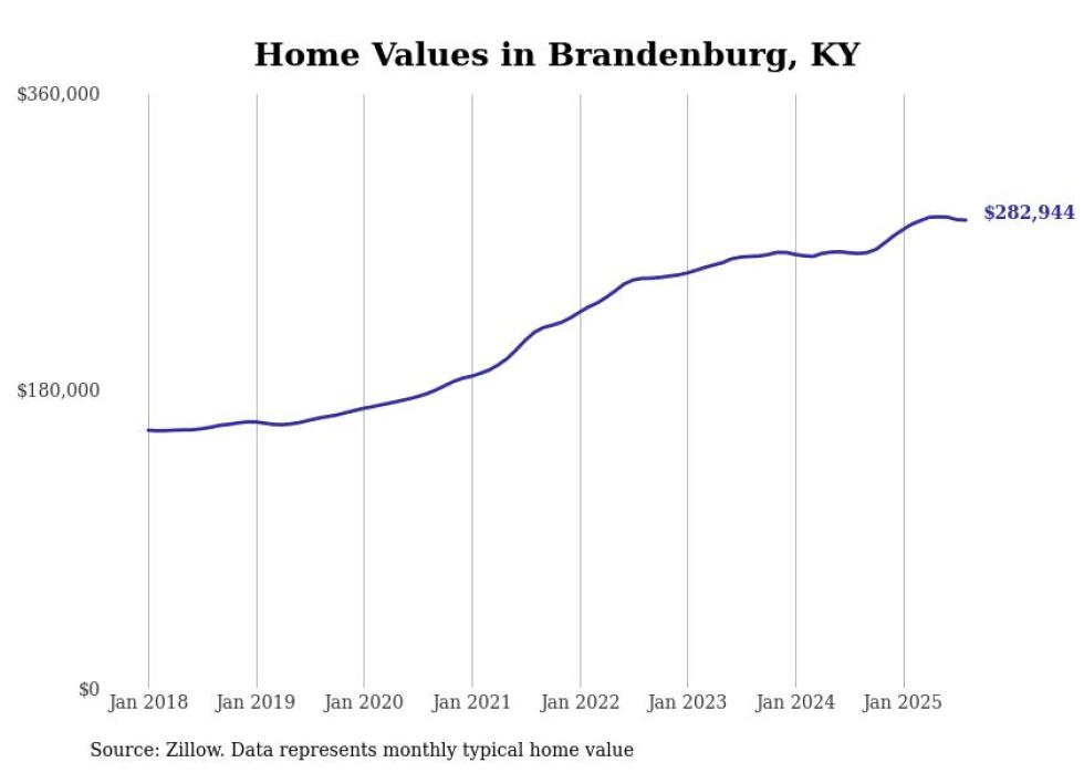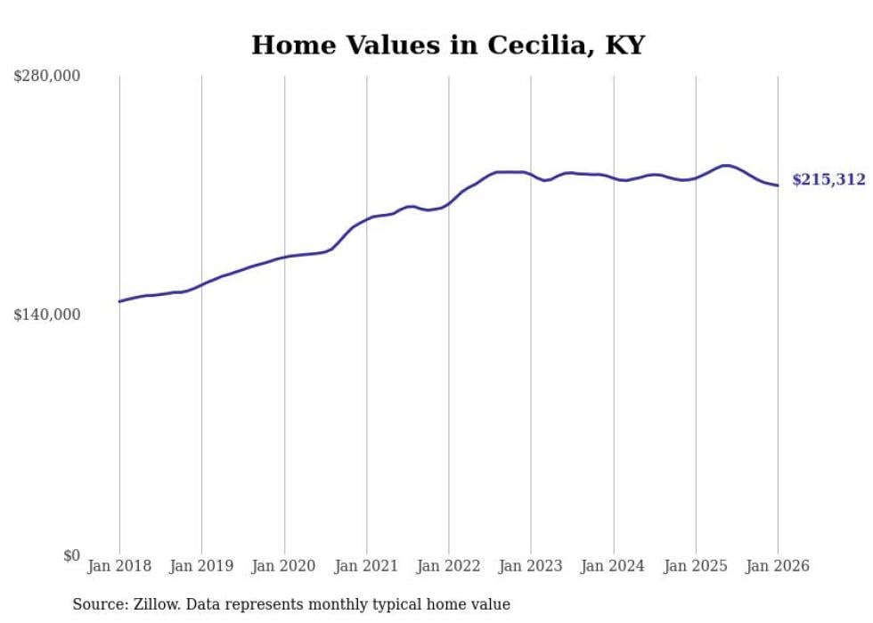 Stacker compiled a list of cities with the most expensive homes in the Elizabethtown-Fort Knox, KY metro area using data from Zillow. Charts show the monthly typical home value since January 2018.