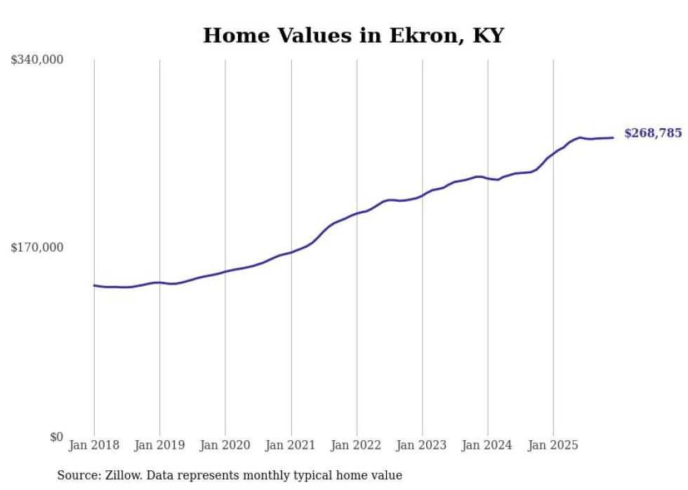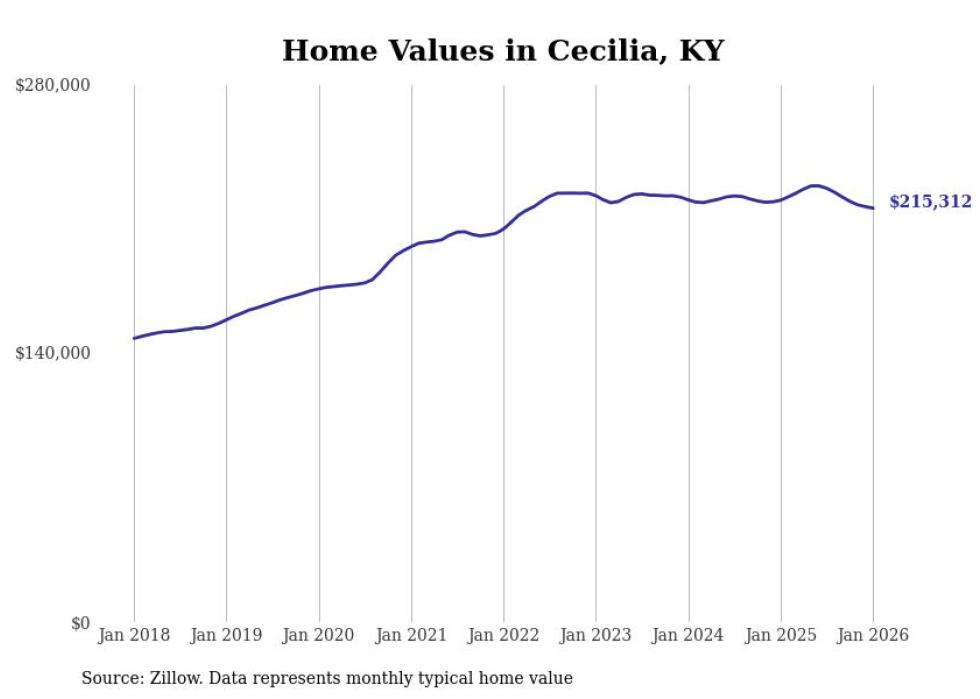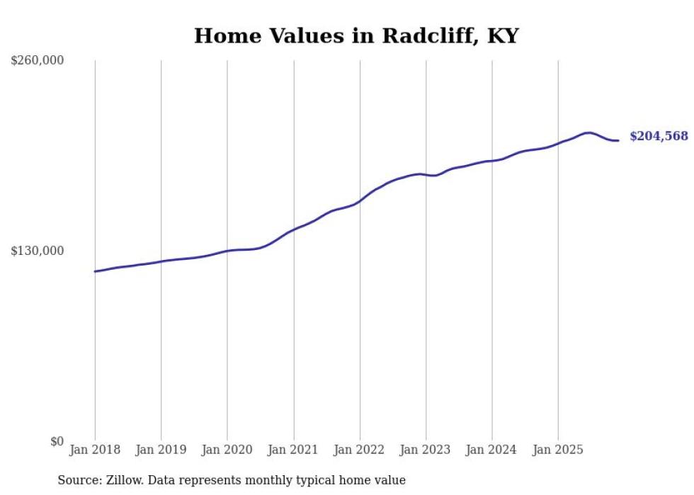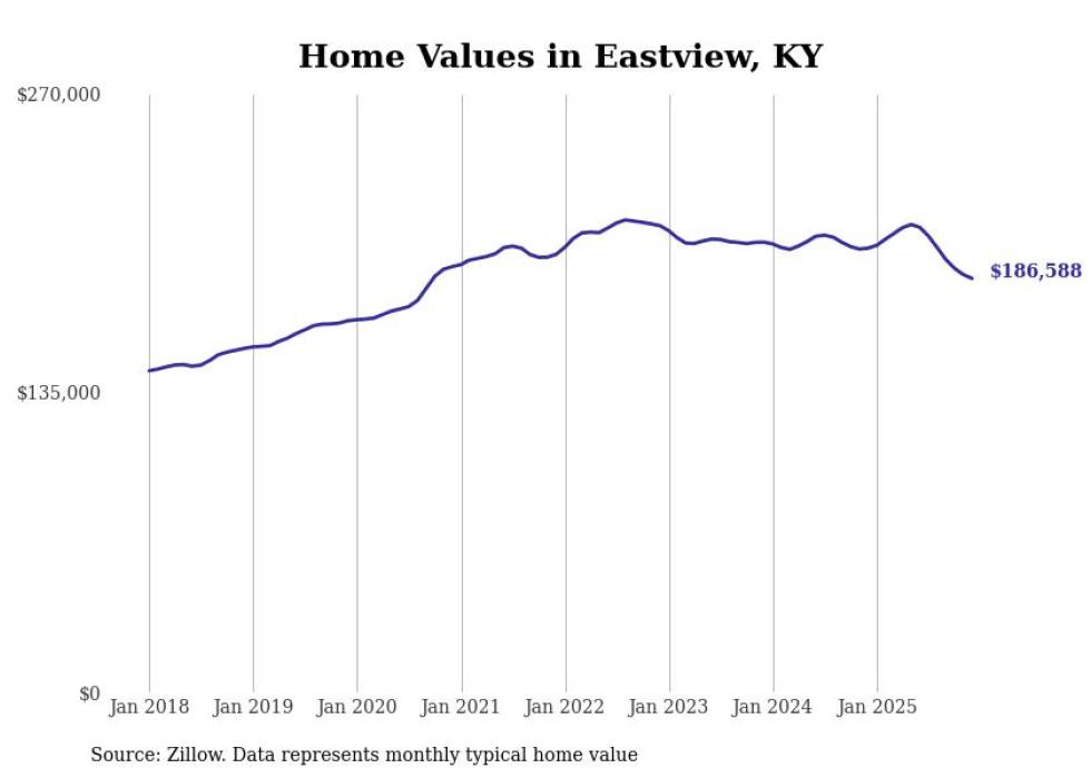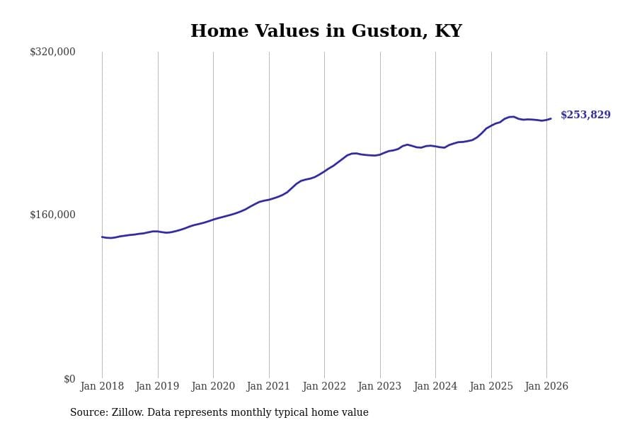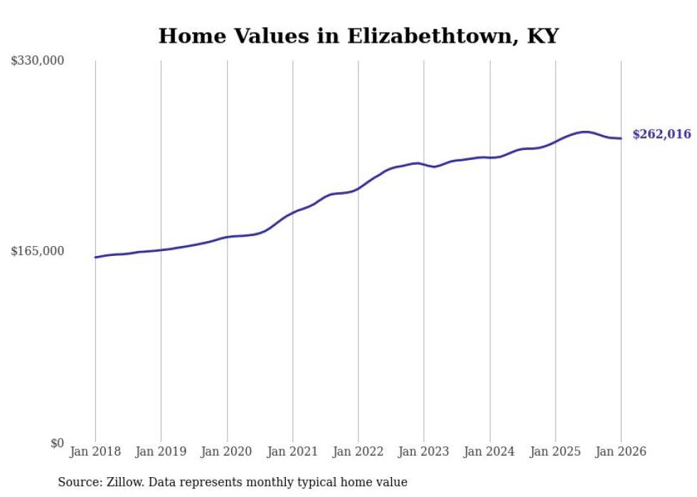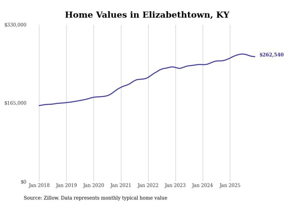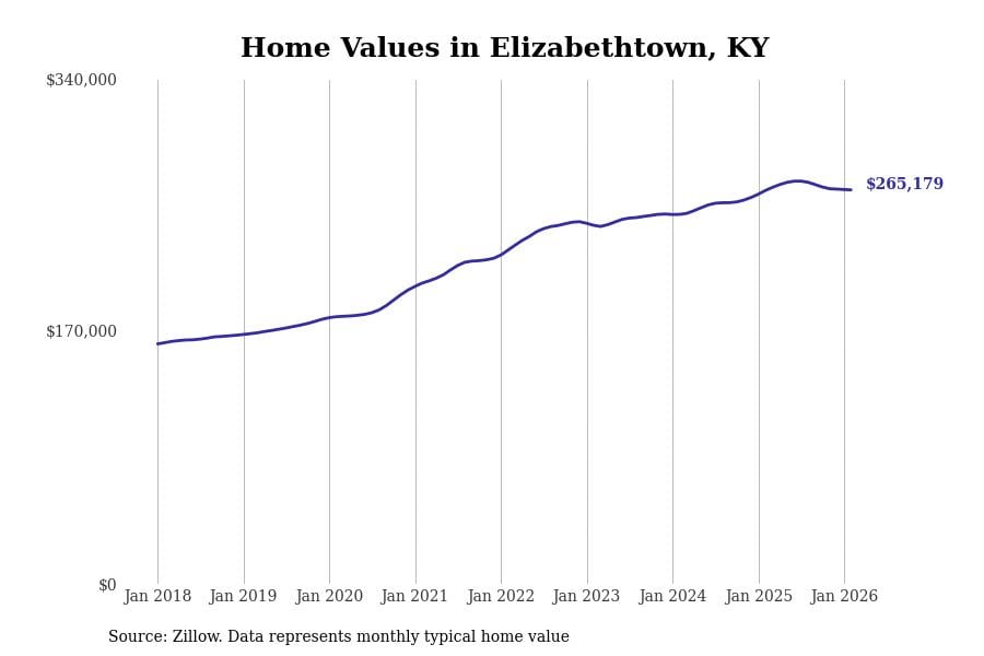 Stacker compiled a list of cities with the most expensive homes in the Elizabethtown metro area using data from Zillow. Charts show the monthly typical home value since January 2018. All 21 cities and towns with data available were included in the list.