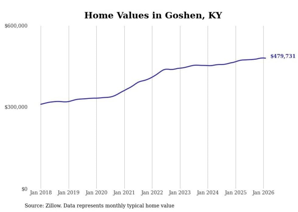 Stacker compiled a list of cities with the most expensive homes in the Louisville/Jefferson County, KY-IN metro area using data from Zillow. Charts show the monthly typical home value since January 2018.