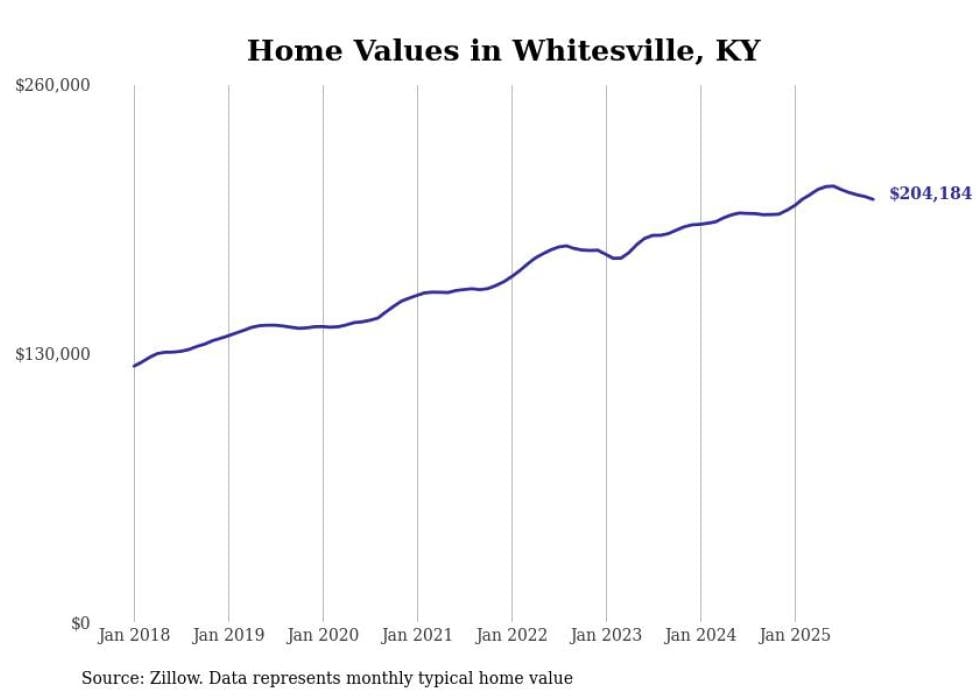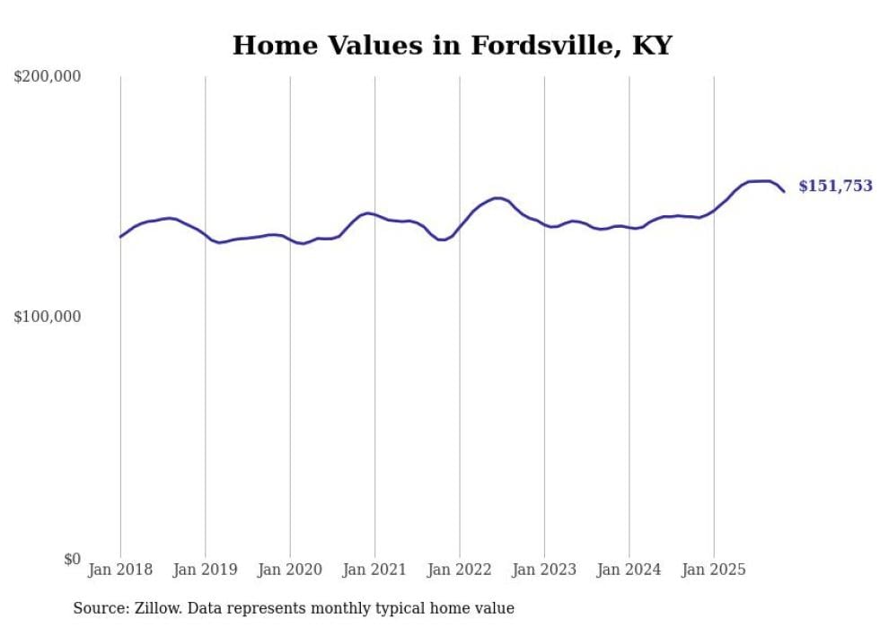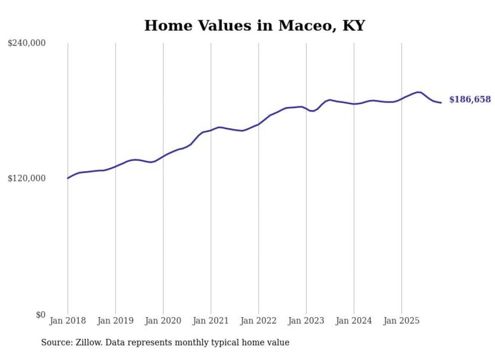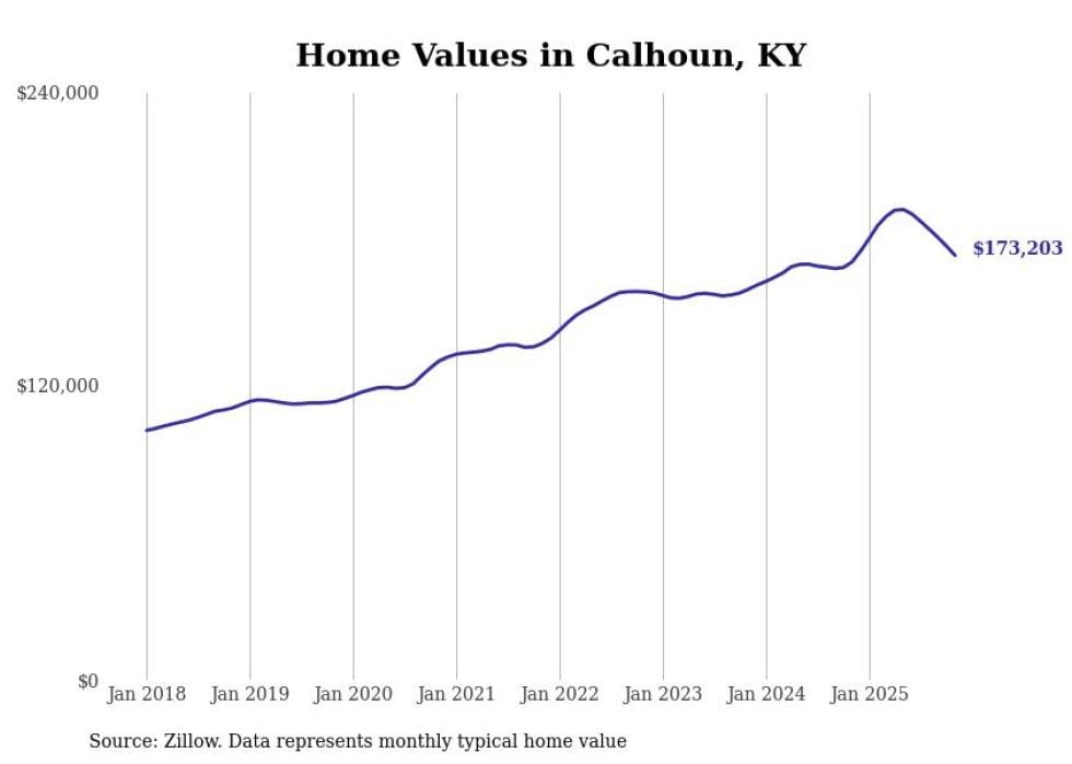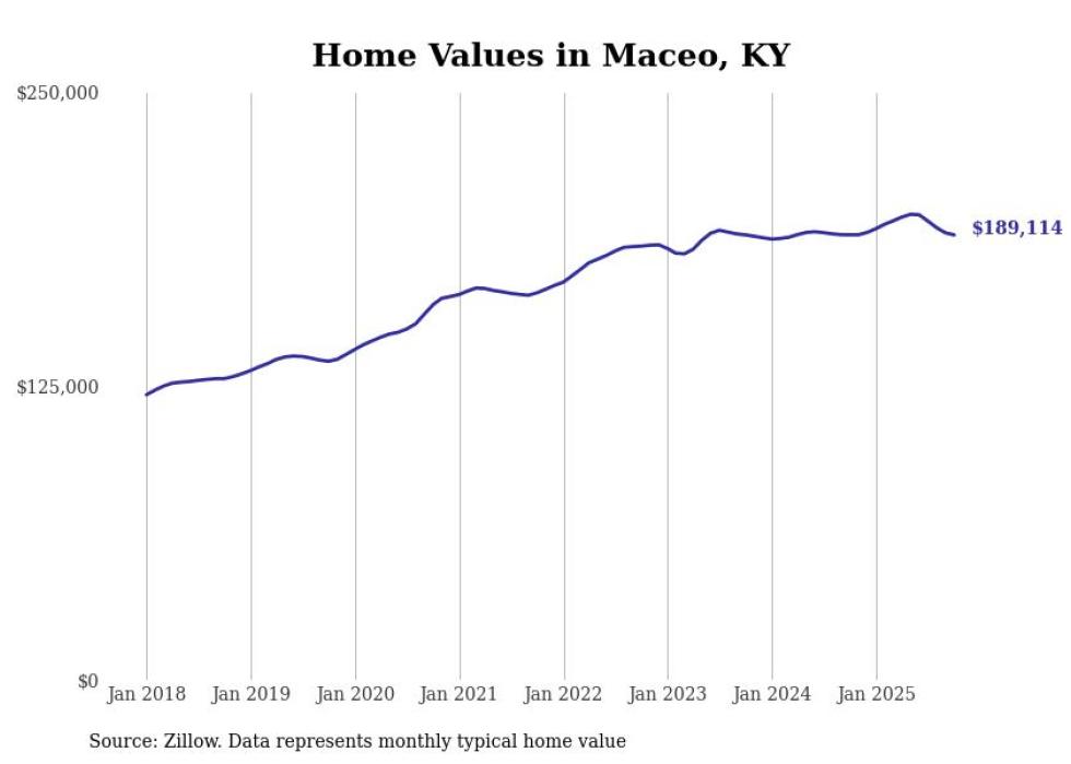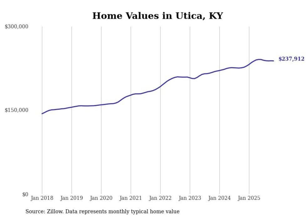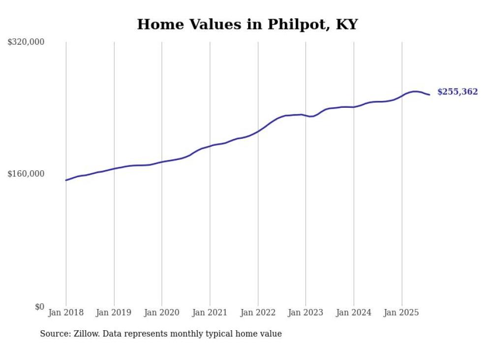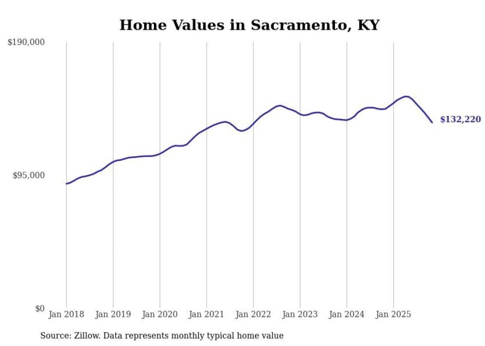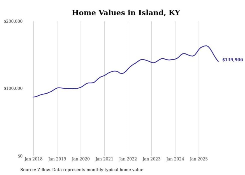 Stacker compiled a list of cities with the most expensive homes in the Owensboro metro area using data from Zillow. Charts show the monthly typical home value since January 2018. All 13 cities and towns with data available were included in the list.